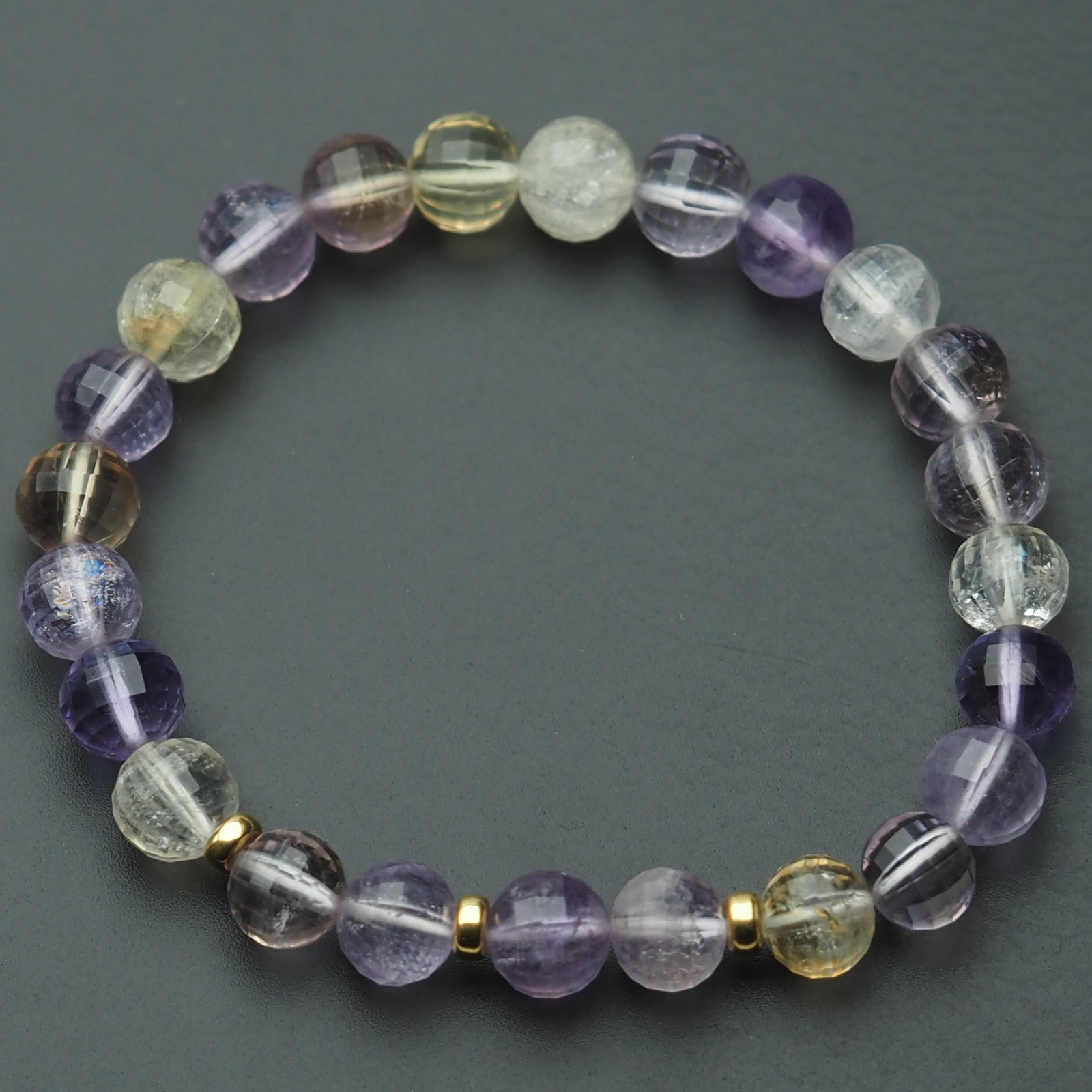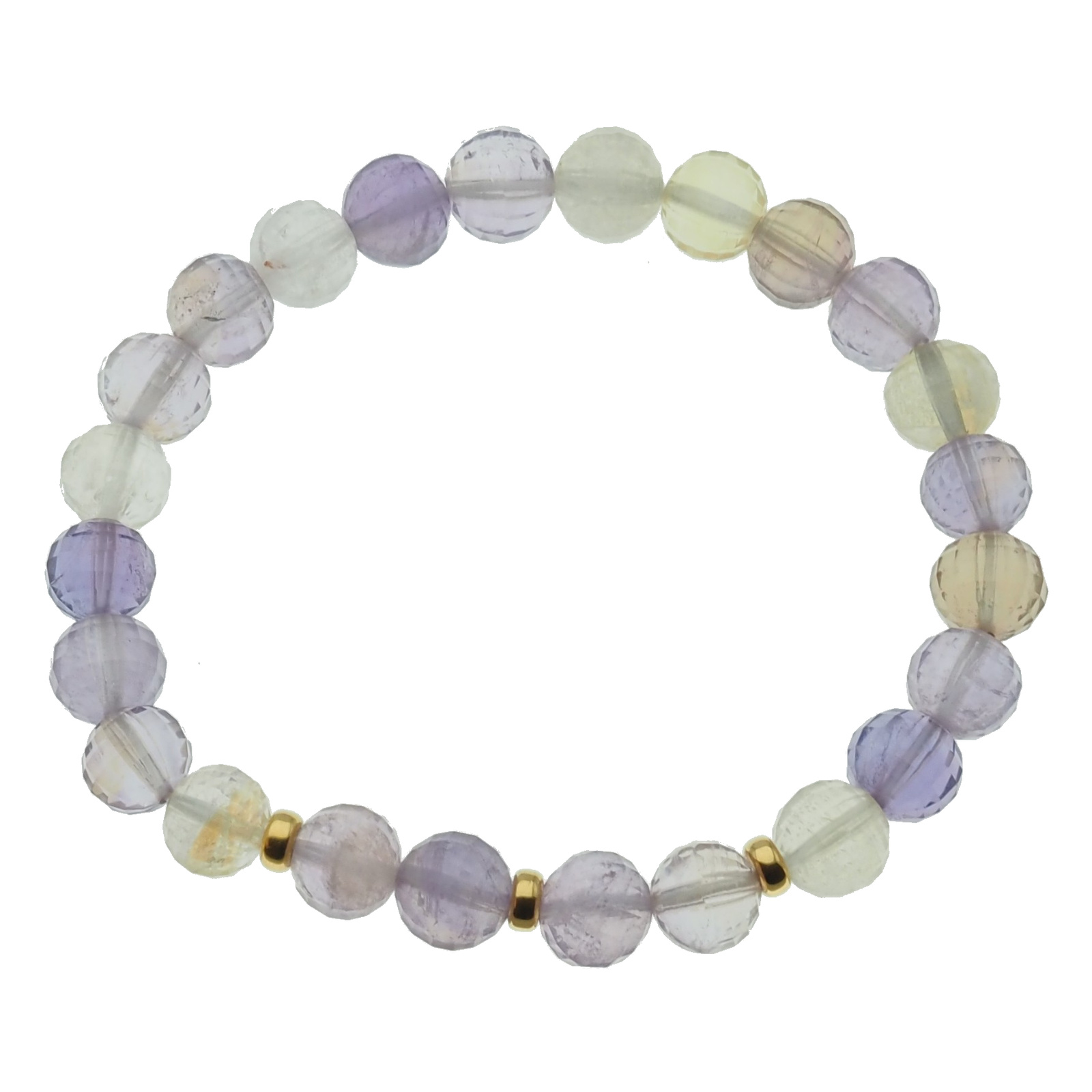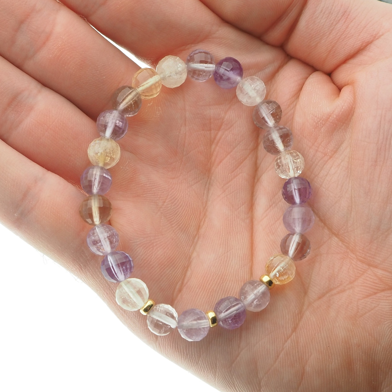 Bransoletka wykonana ręcznie na elastycznej gumce silikonowej z naturalnych kamieni Ametrynu – połączenia Ametystu i Cytrynu. Wyrób zdobią fasetowane kulki oraz srebrne elementy pozłacane 24-karatowym złotem. Delikatna i subtelna forma o wyjątkowym energetycznym charakterze.