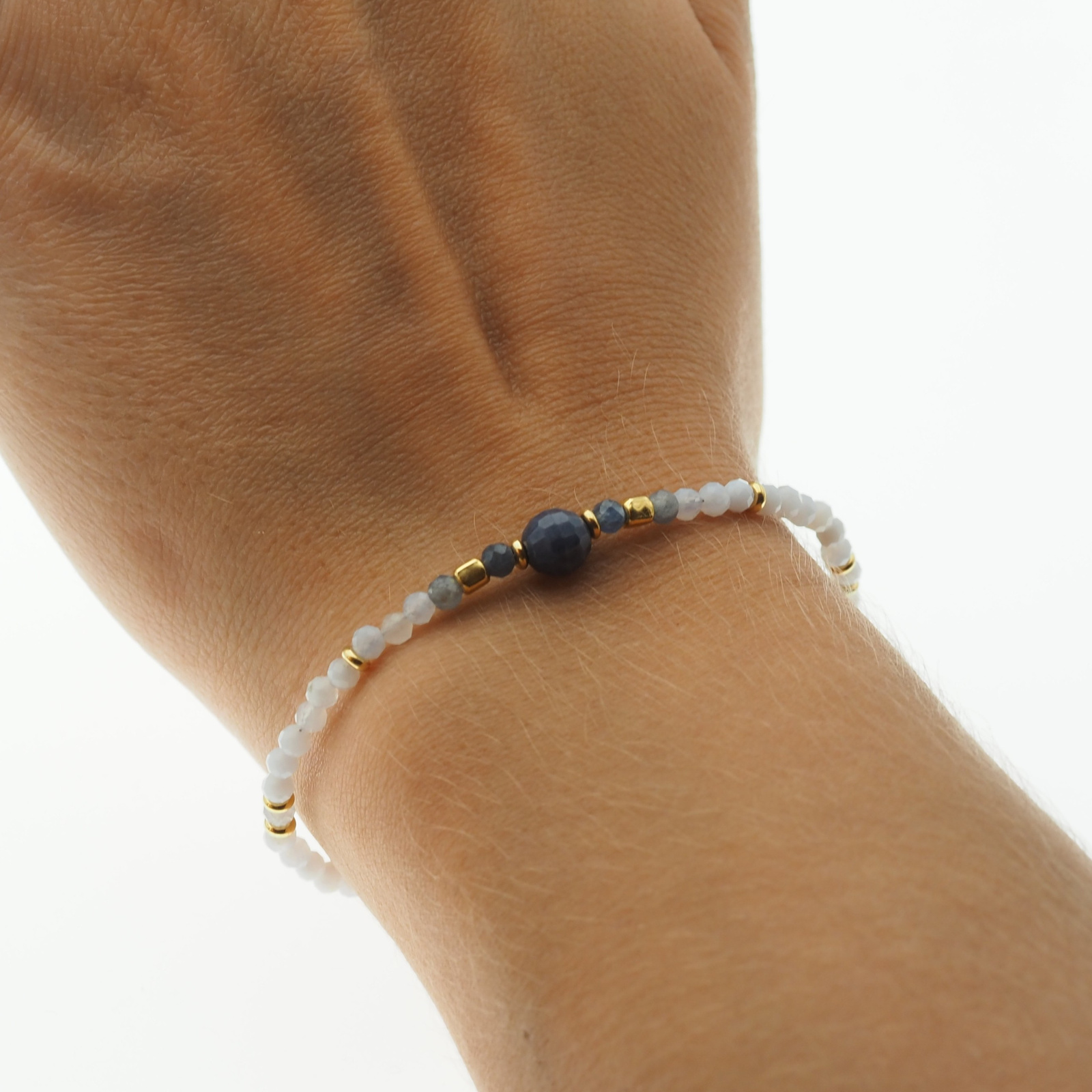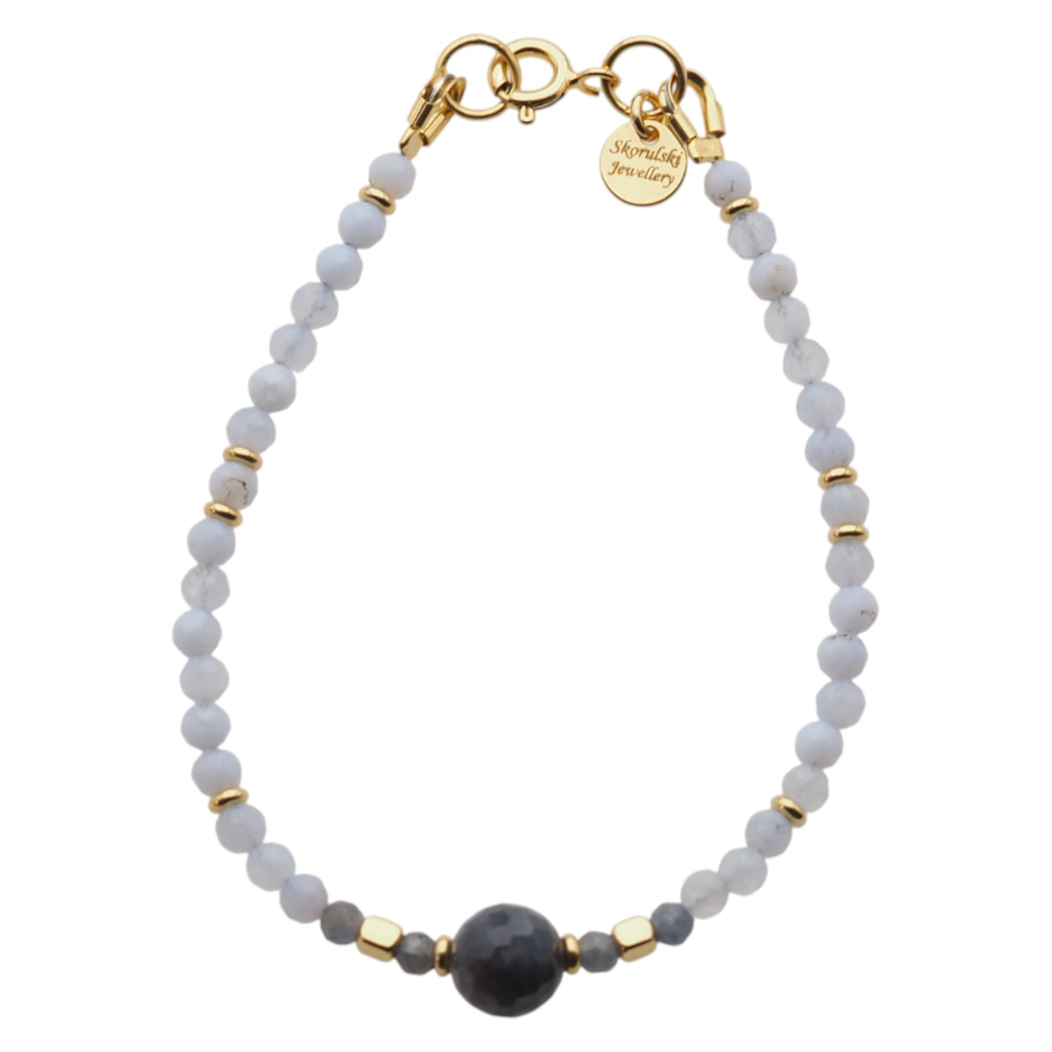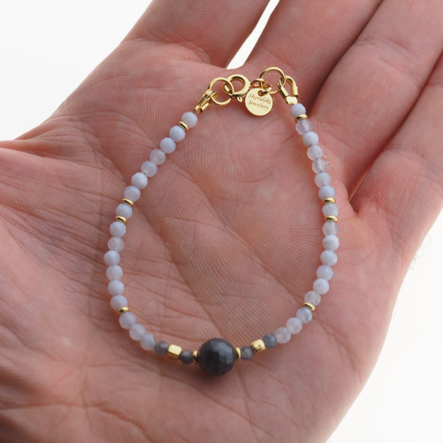 Bransoletka z Chalcedonem i Szafirem fasetowanym została zrobiona ręcznie na lince stalowej.