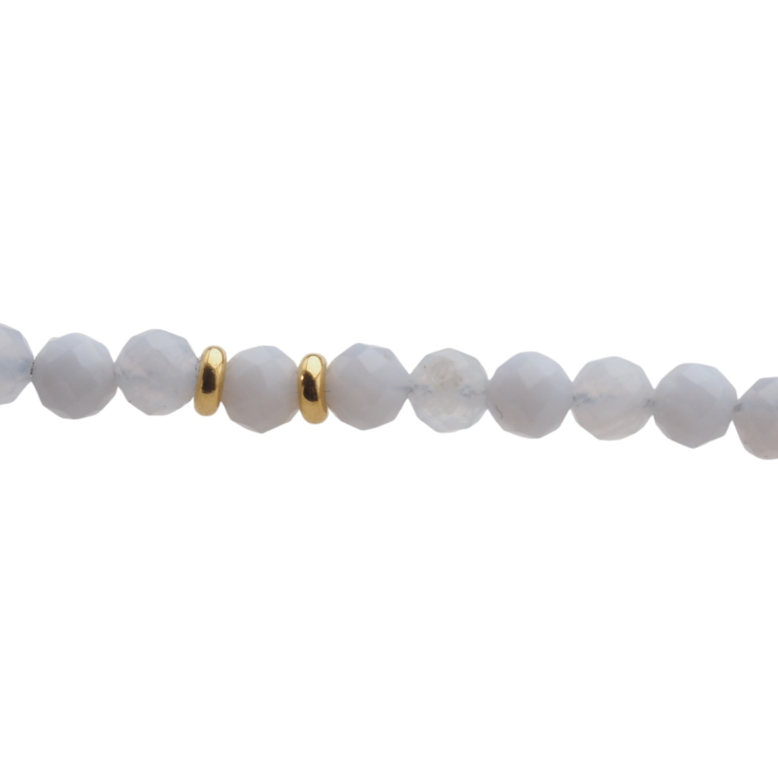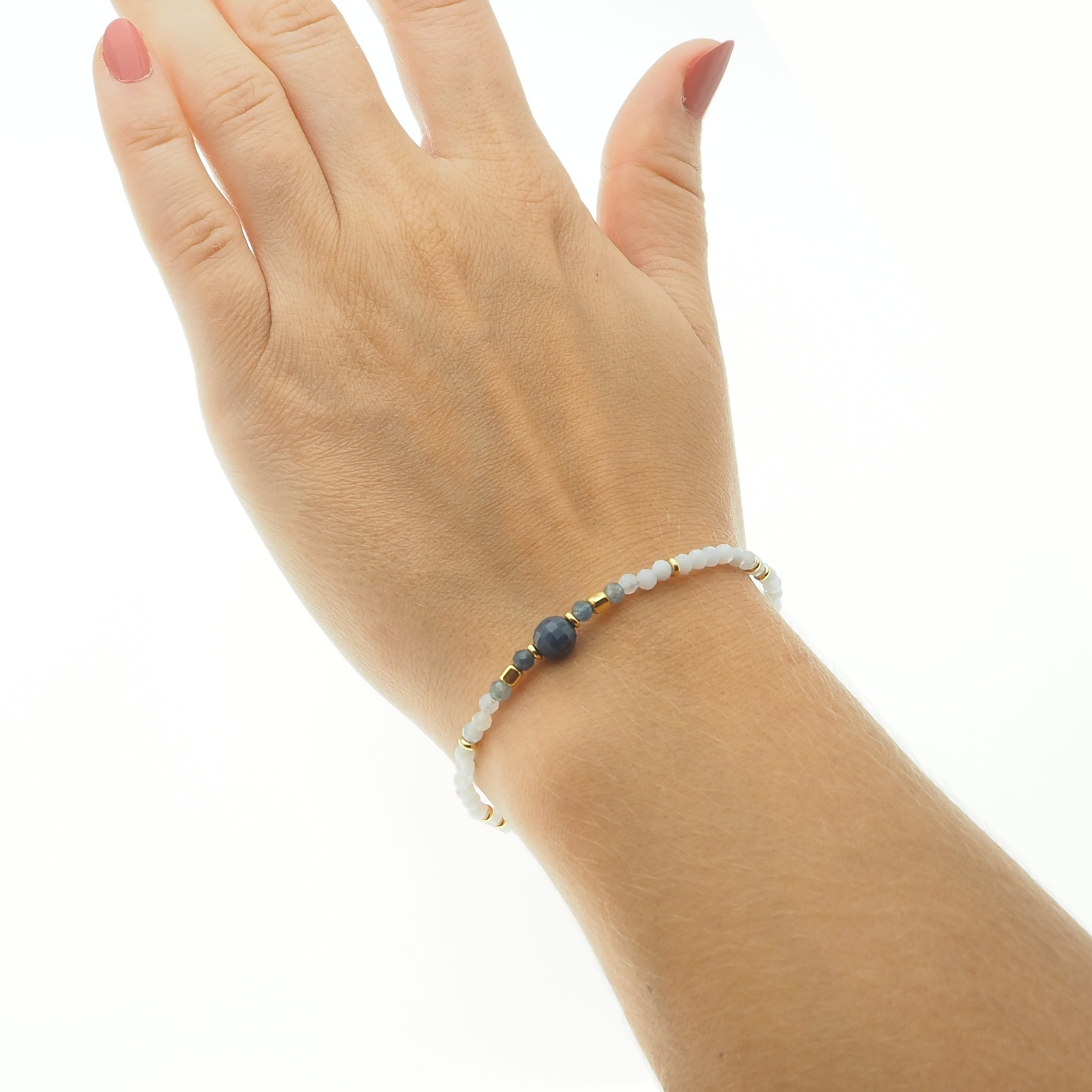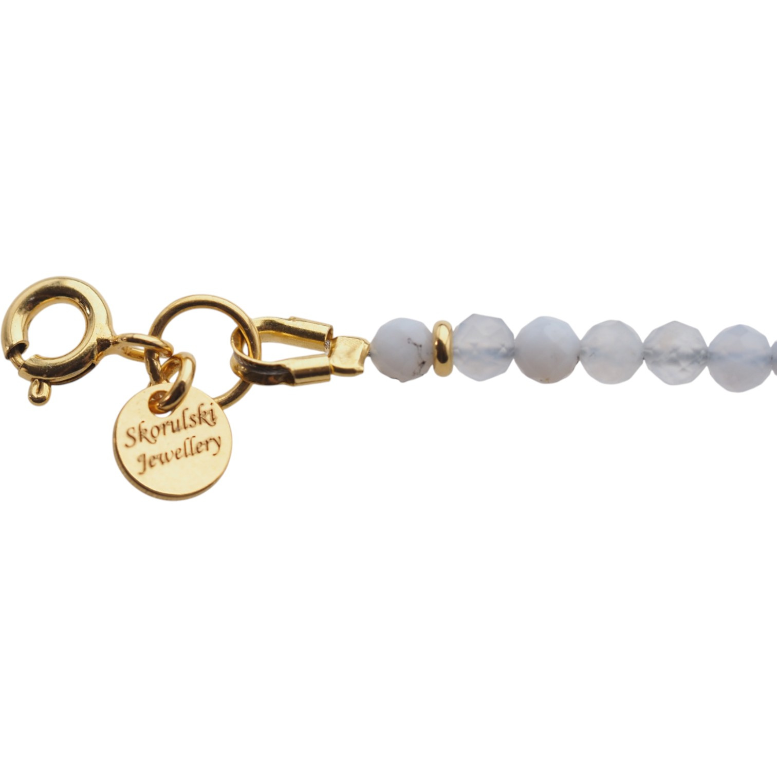 Bransoletka z Chalcedonem i Szafirem fasetowanym została zrobiona ręcznie na lince stalowej.