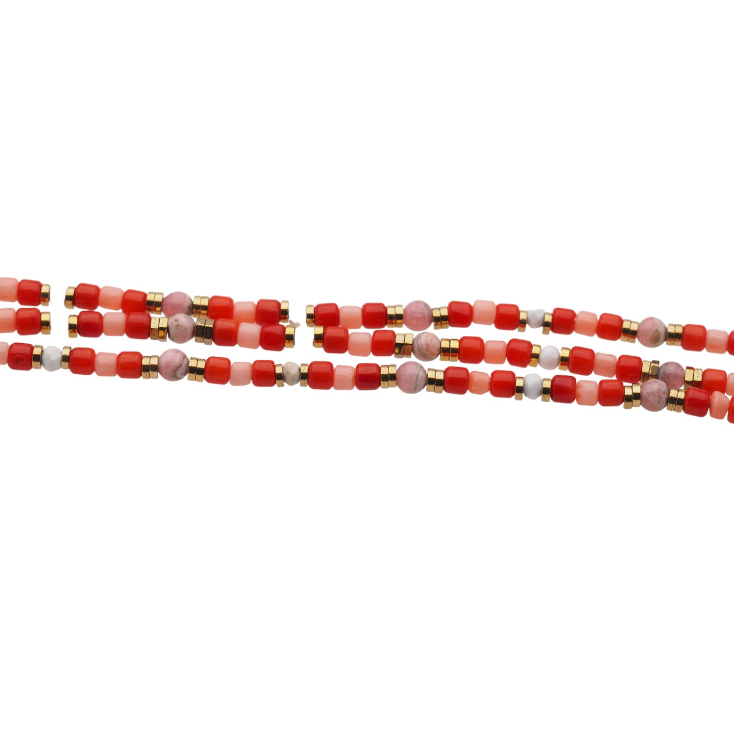 Bransoletka z Koralem, Rodochrozytem, Howlitem, Hematytem została wykonana ręcznie na lince stalowej.