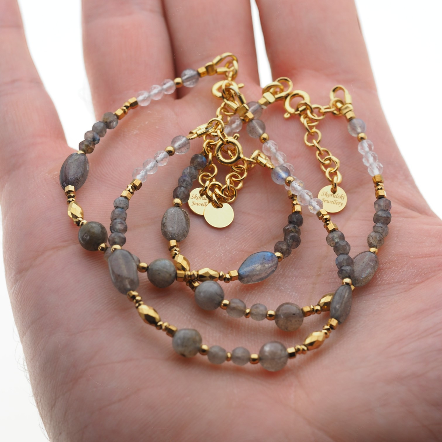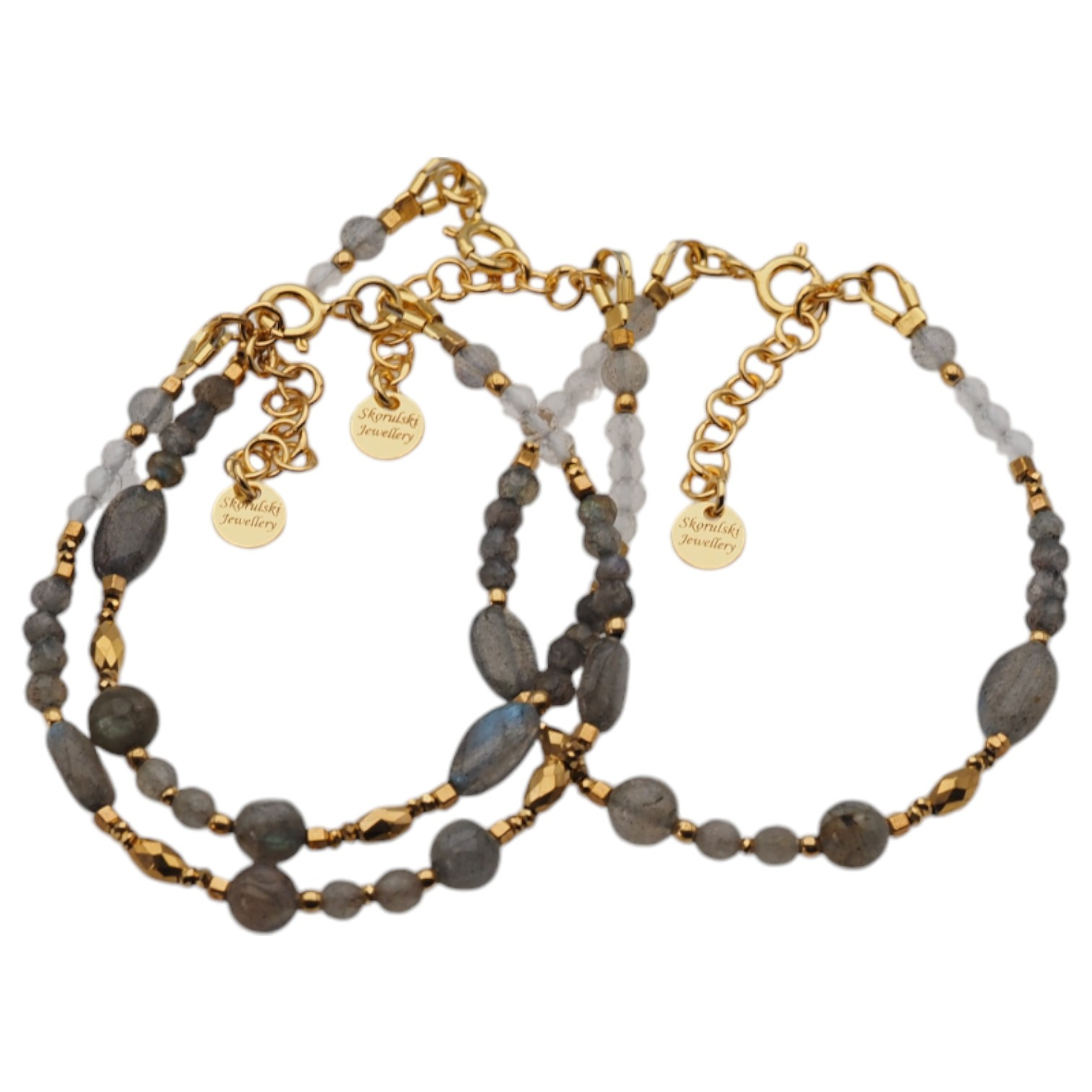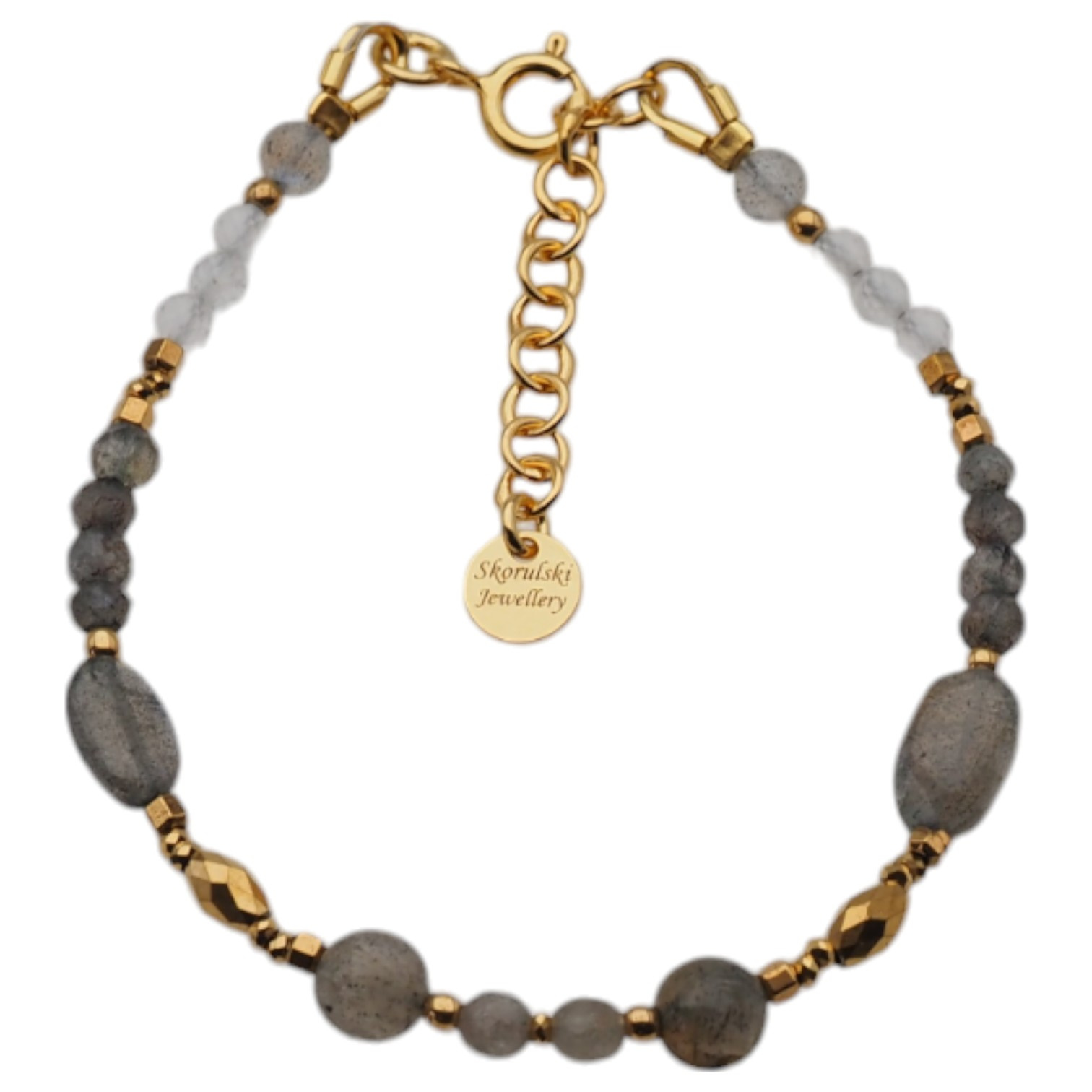Bransoletka - Labradoryt, kryształ górski hematyt i srebro złocone
