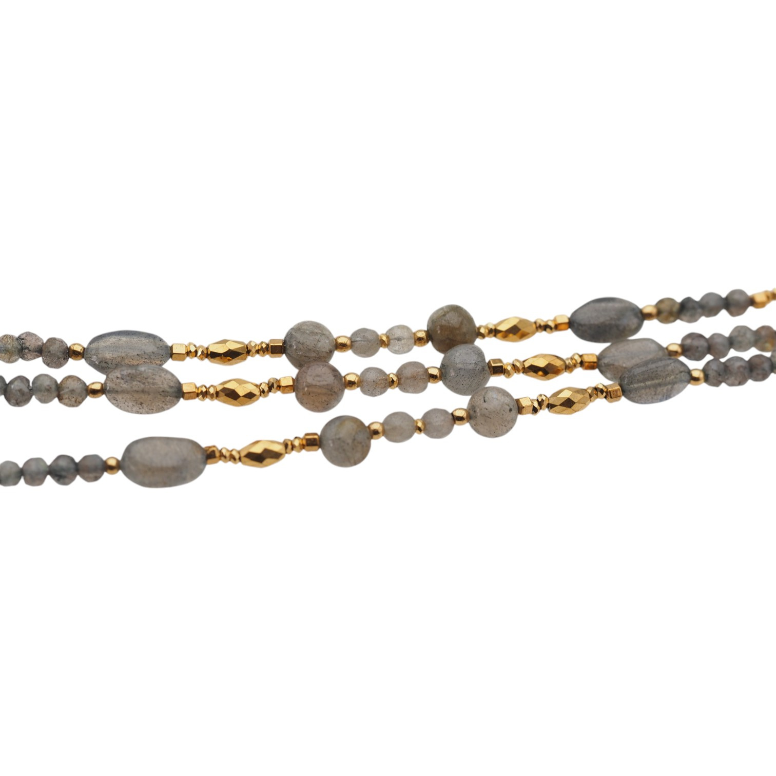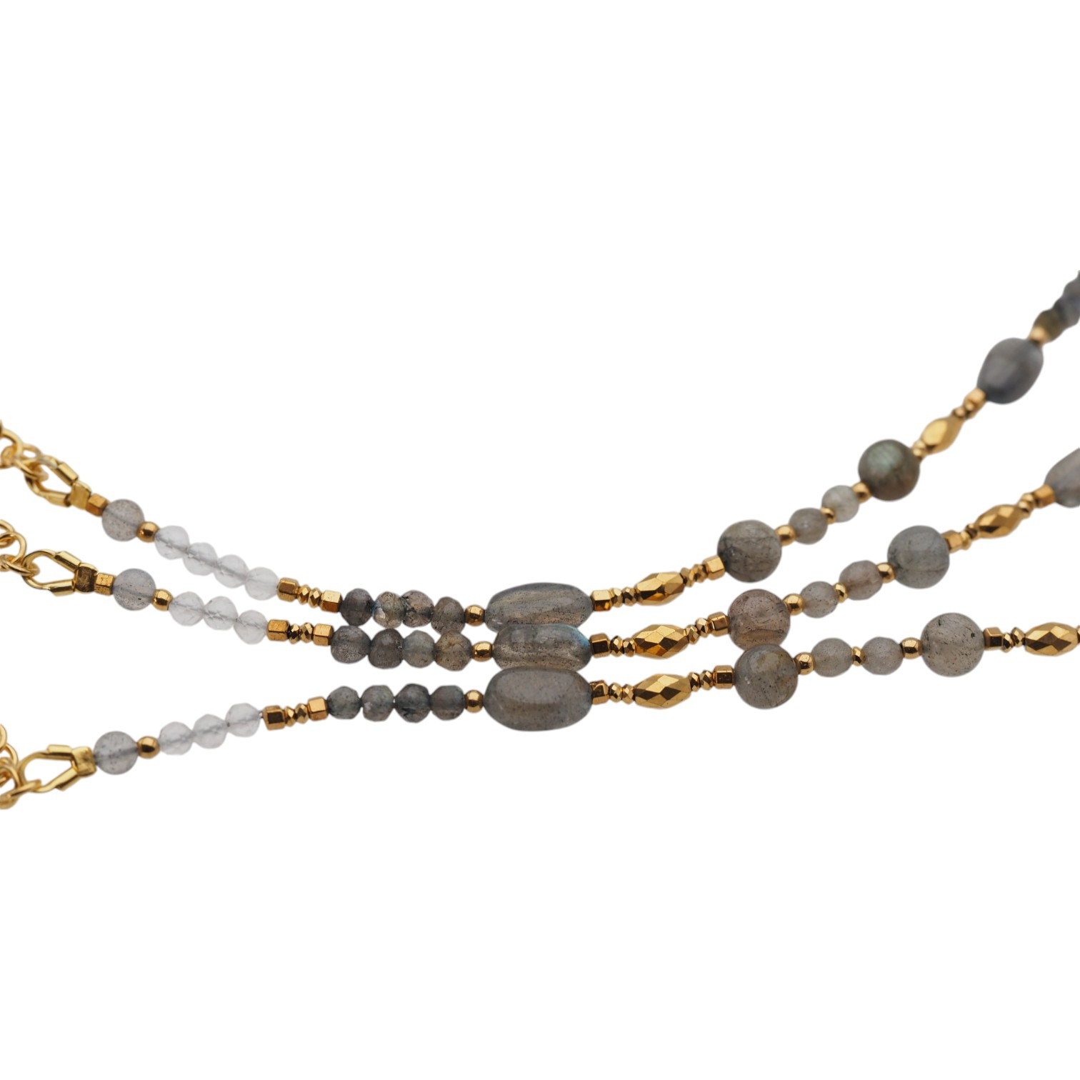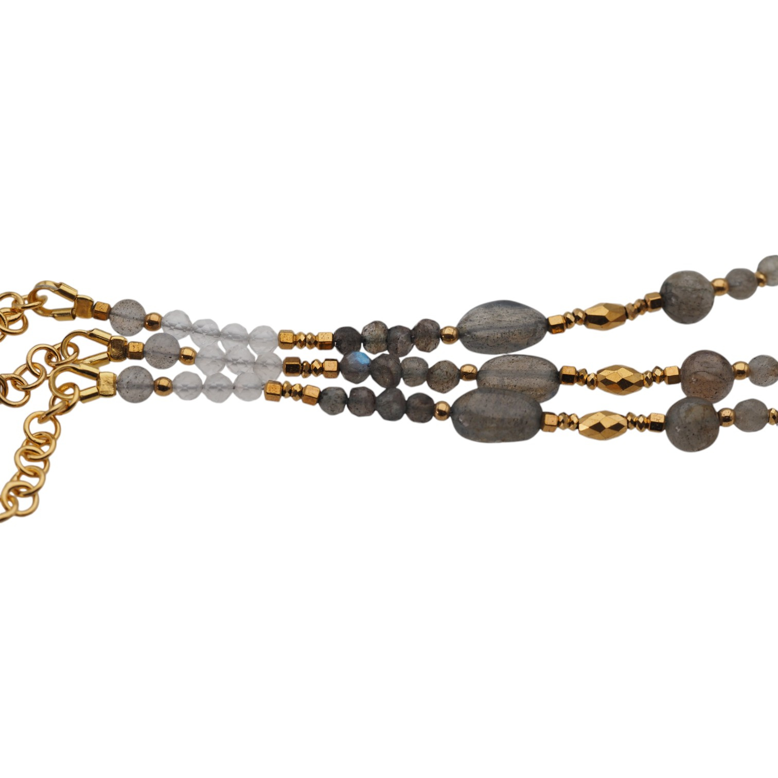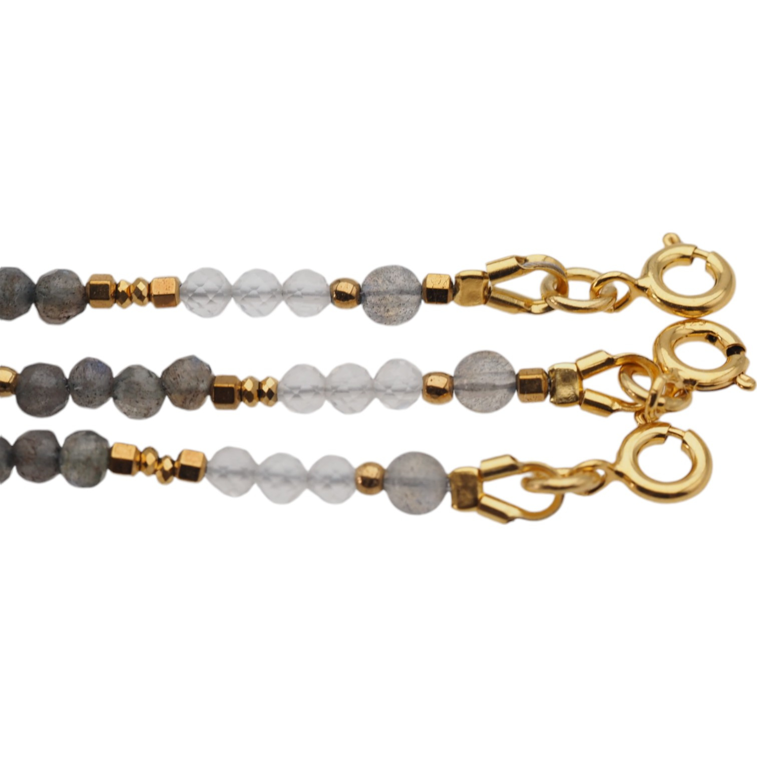 Bransoletka z fasetowanym Labradorytem, Kryształem Górskim, złotym Hematytem została wykonana ręcznie na lince stalowej.