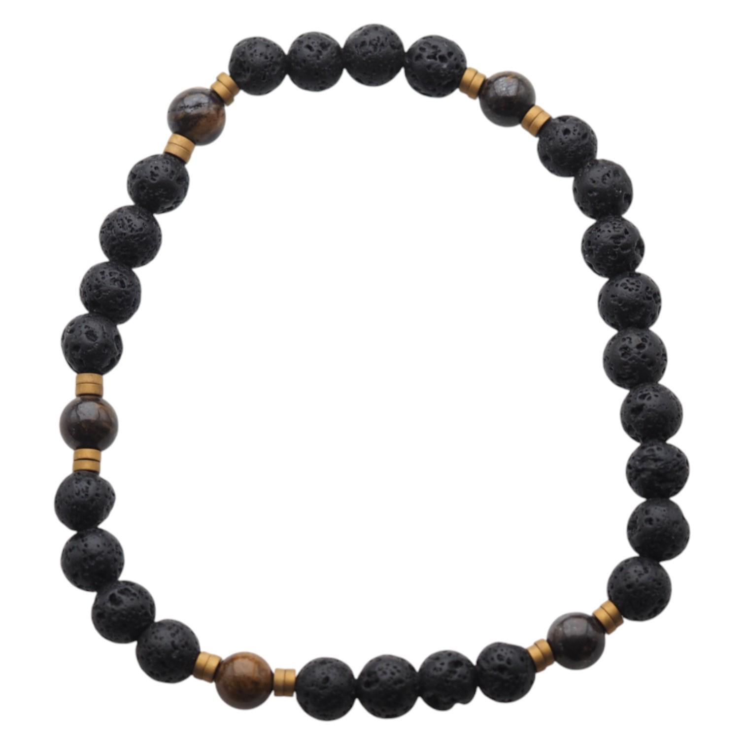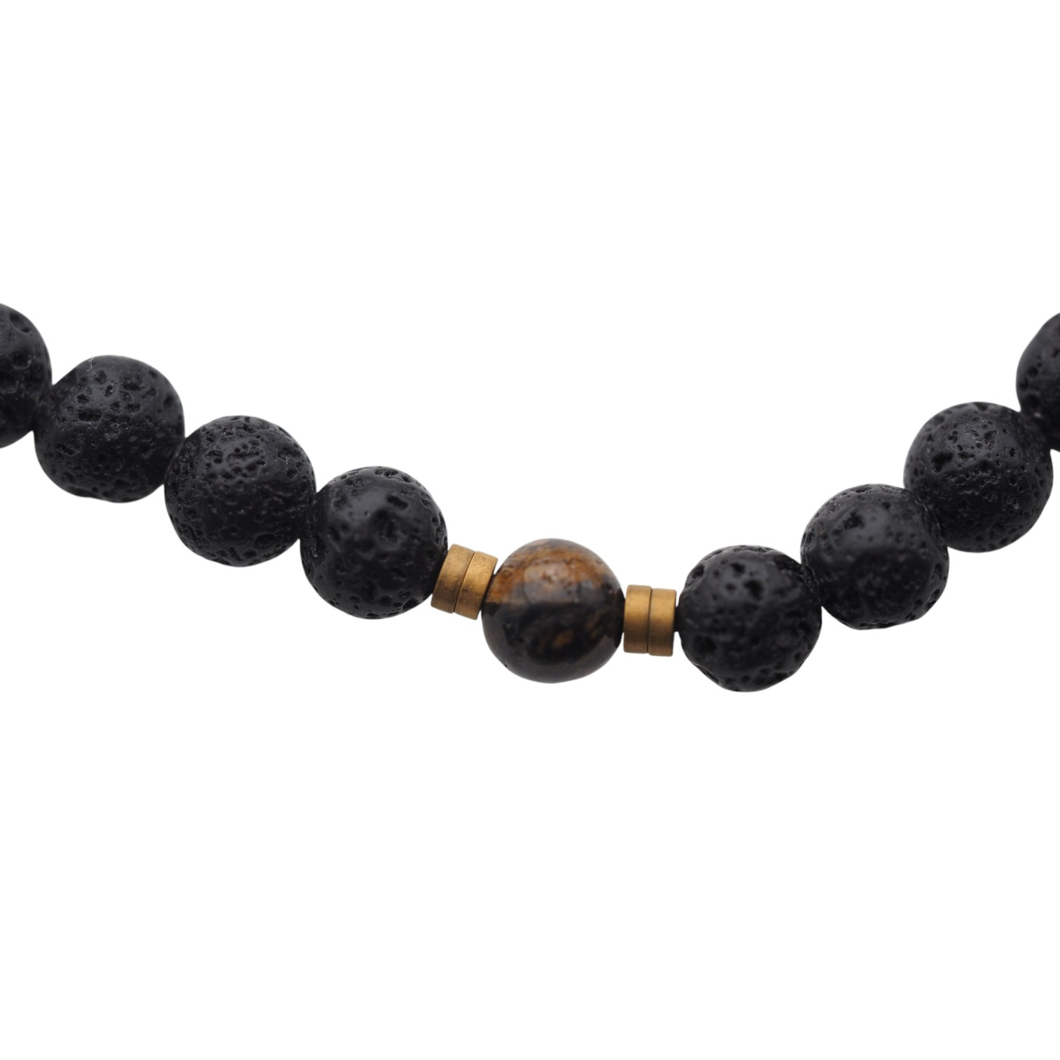 Ręcznie wykonana bransoletka męska stworzona z naturalnych kamieni półszlachetnych – Lawy Wulkanicznej, Bronzytu i złotego Hematytu. Połączenie matowej czerni, metalicznego złota i brązowych akcentów tworzy elegancką, nowoczesną kompozycję inspirowaną siłami natury.