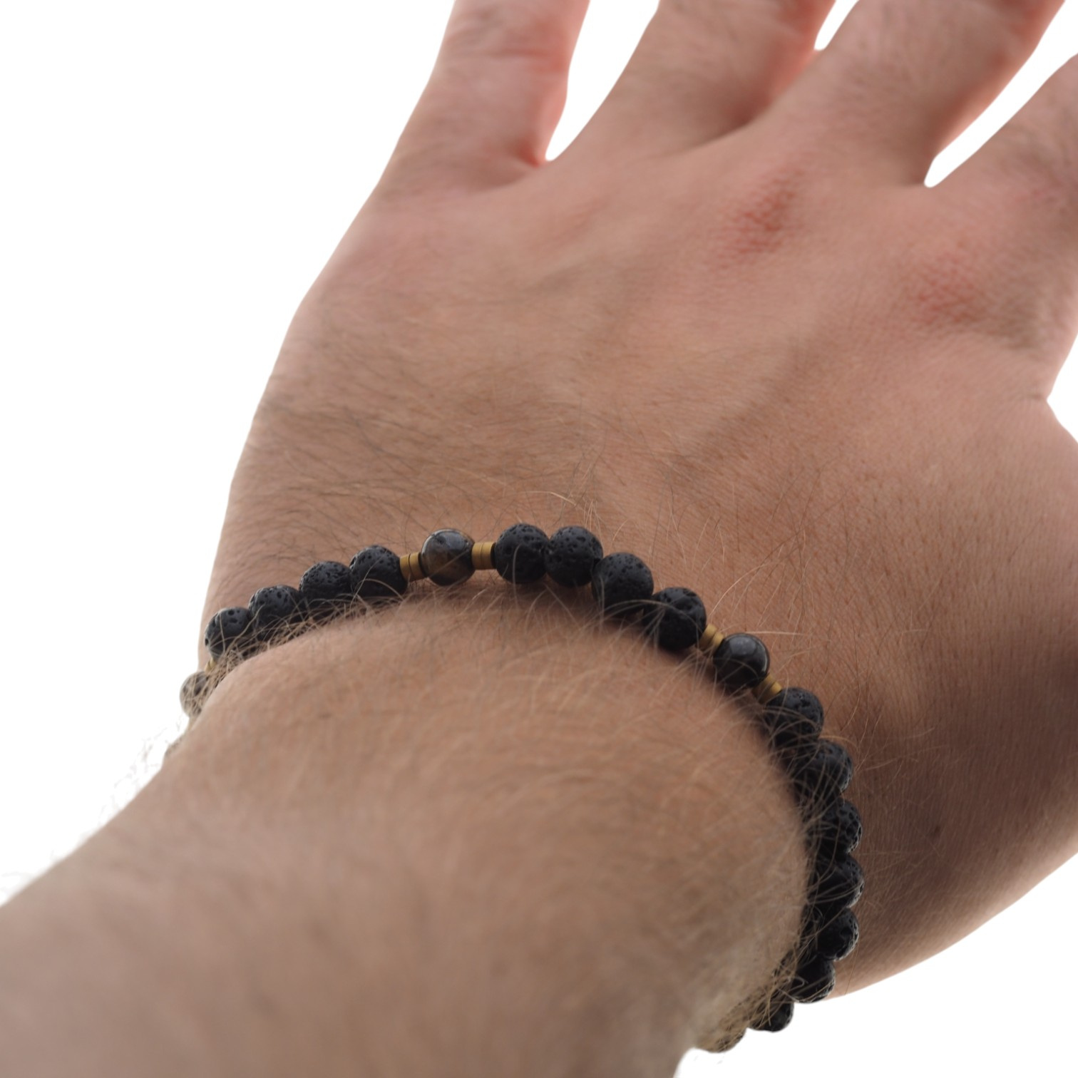 Bransoletka męska z Lawy Wulkanicznej, Bronzytu i złotego Hematytu – ręcznie wykonana, na gumce silikonowej