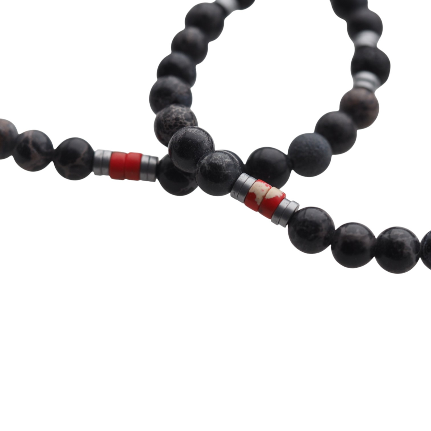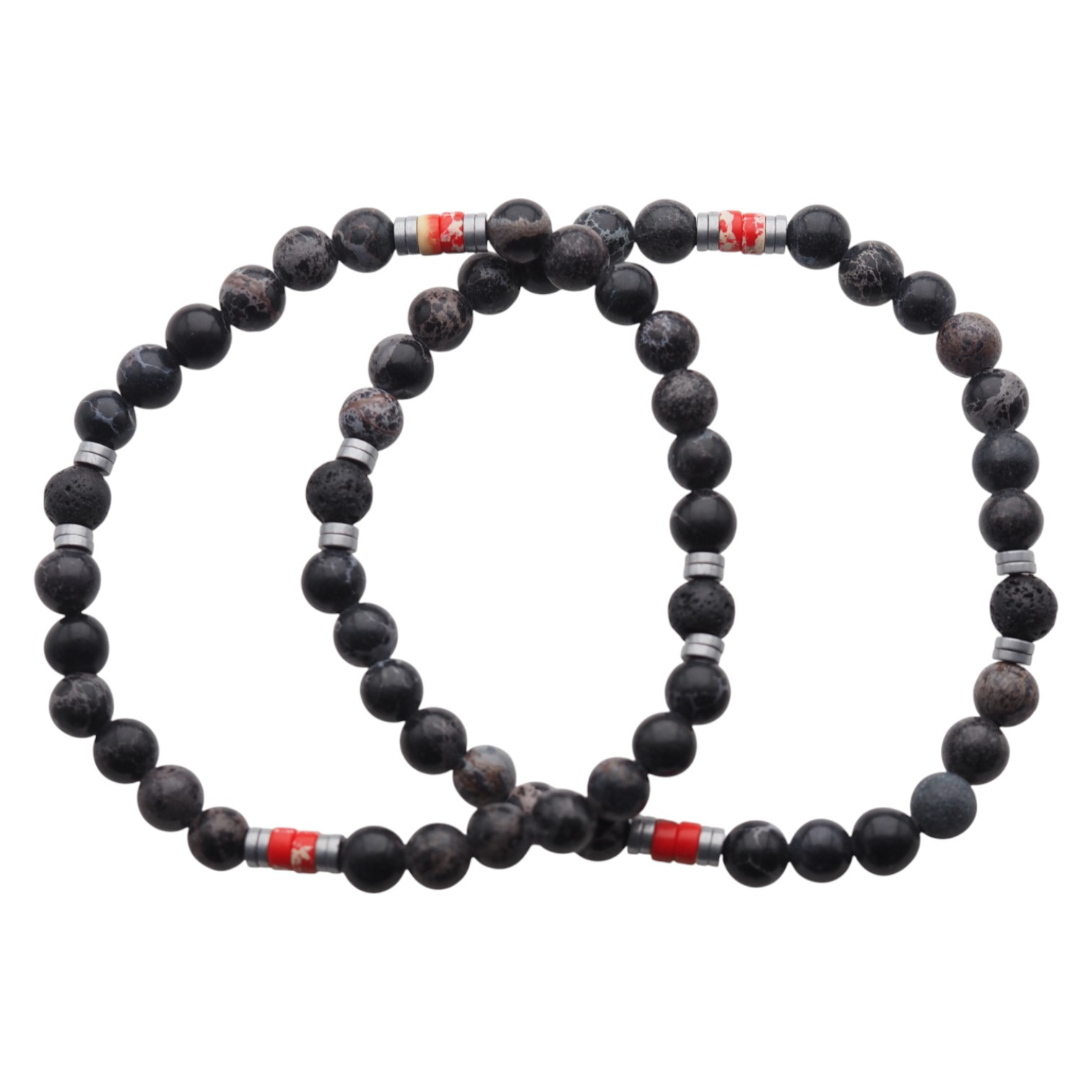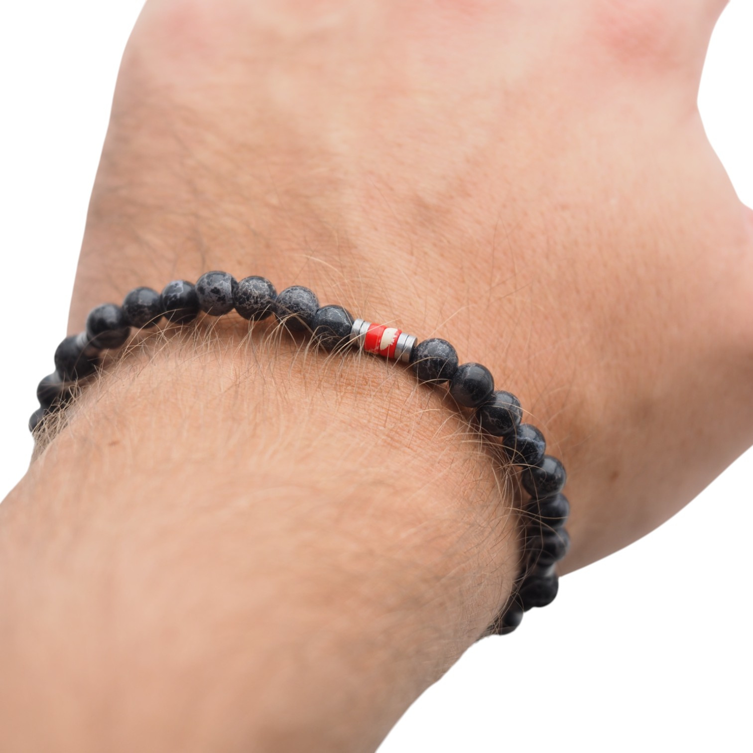 Nowoczesna, ręcznie wykonana bransoletka męska stworzona z naturalnych kamieni półszlachetnych – Lawy Wulkanicznej, czerwonego Jaspisu i Hematytu. Połączenie głębokiej czerni z metalicznym srebrem i subtelnym akcentem czerwieni nadaje bransoletce wyrazisty, energetyczny charakter.