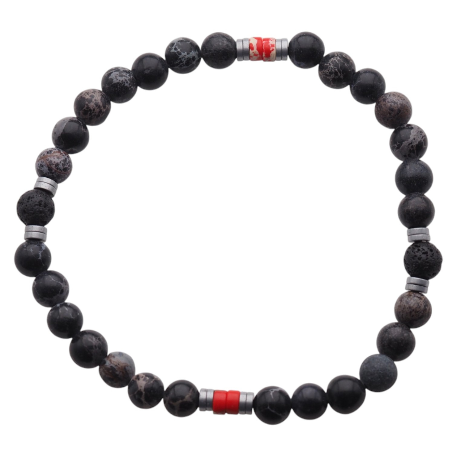 Bransoletka męska z Lawy Wulkanicznej, czerwonego Jaspisu i Hematytu – ręcznie wykonana, na gumce silikonowej