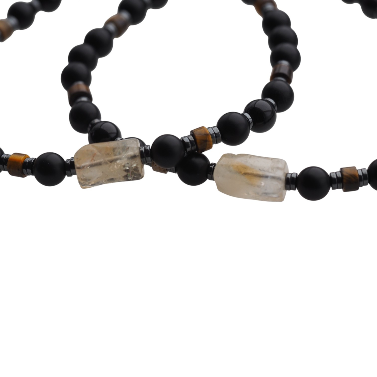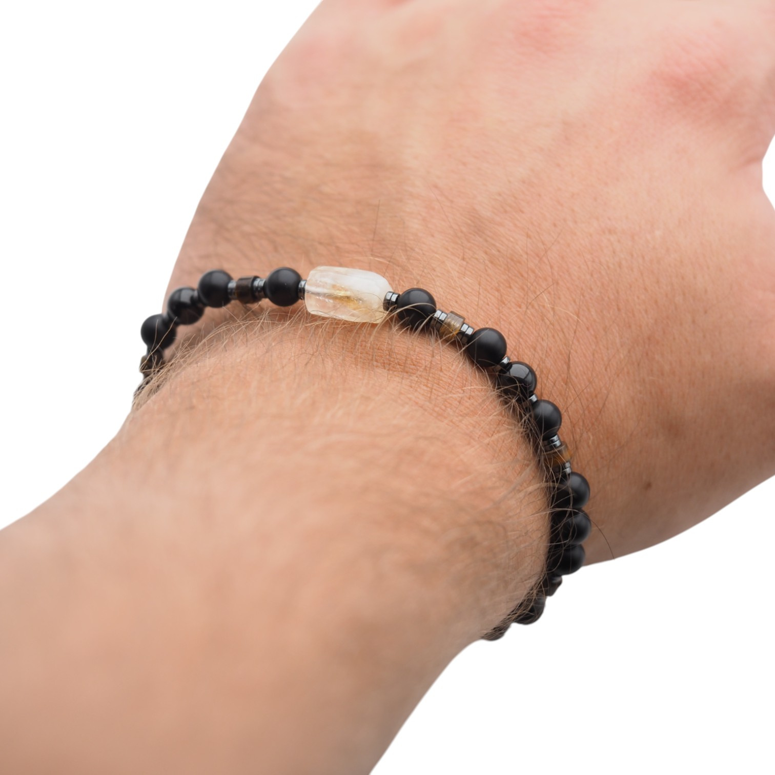 Nowoczesna, ręcznie wykonana bransoletka męska z naturalnych kamieni półszlachetnych: Onyksu, czarnego Turmalinu, Tygrysiego Oka, Cytrynu i Hematytu. Połączenie głębokiej czerni, złotych refleksów i subtelnych brązowych tonów tworzy kompozycję symbolizującą siłę, odwagę i pewność siebie.