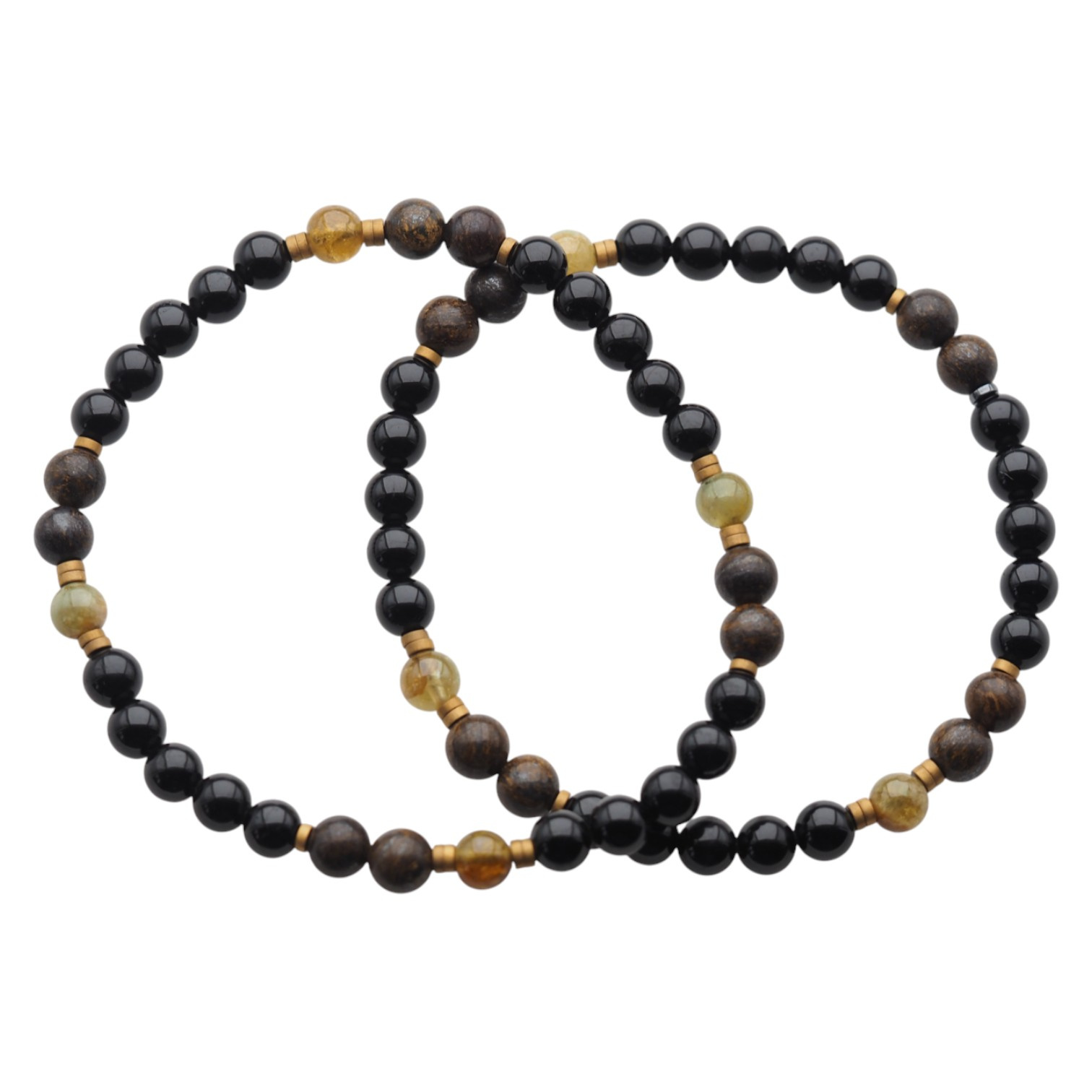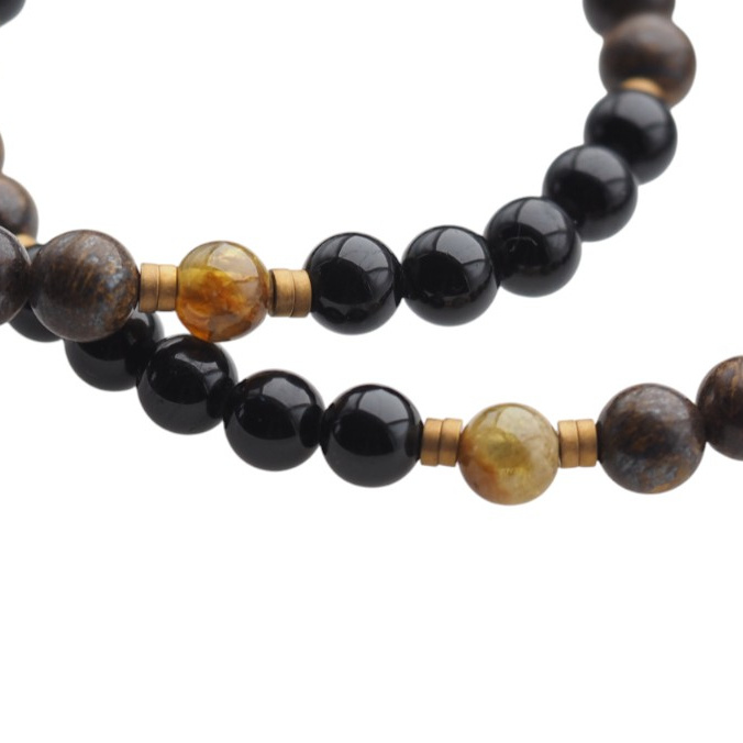 Stylowa, ręcznie wykonana bransoletka męska stworzona z naturalnych kamieni półszlachetnych – czarnego Turmalinu, Bronzytu, Granatu Zielonego i złotego Hematytu. Połączenie głębokiej czerni, ciepłego brązu i złocistych akcentów tworzy elegancką, nowoczesną kompozycję inspirowaną naturą i siłą ziemi.