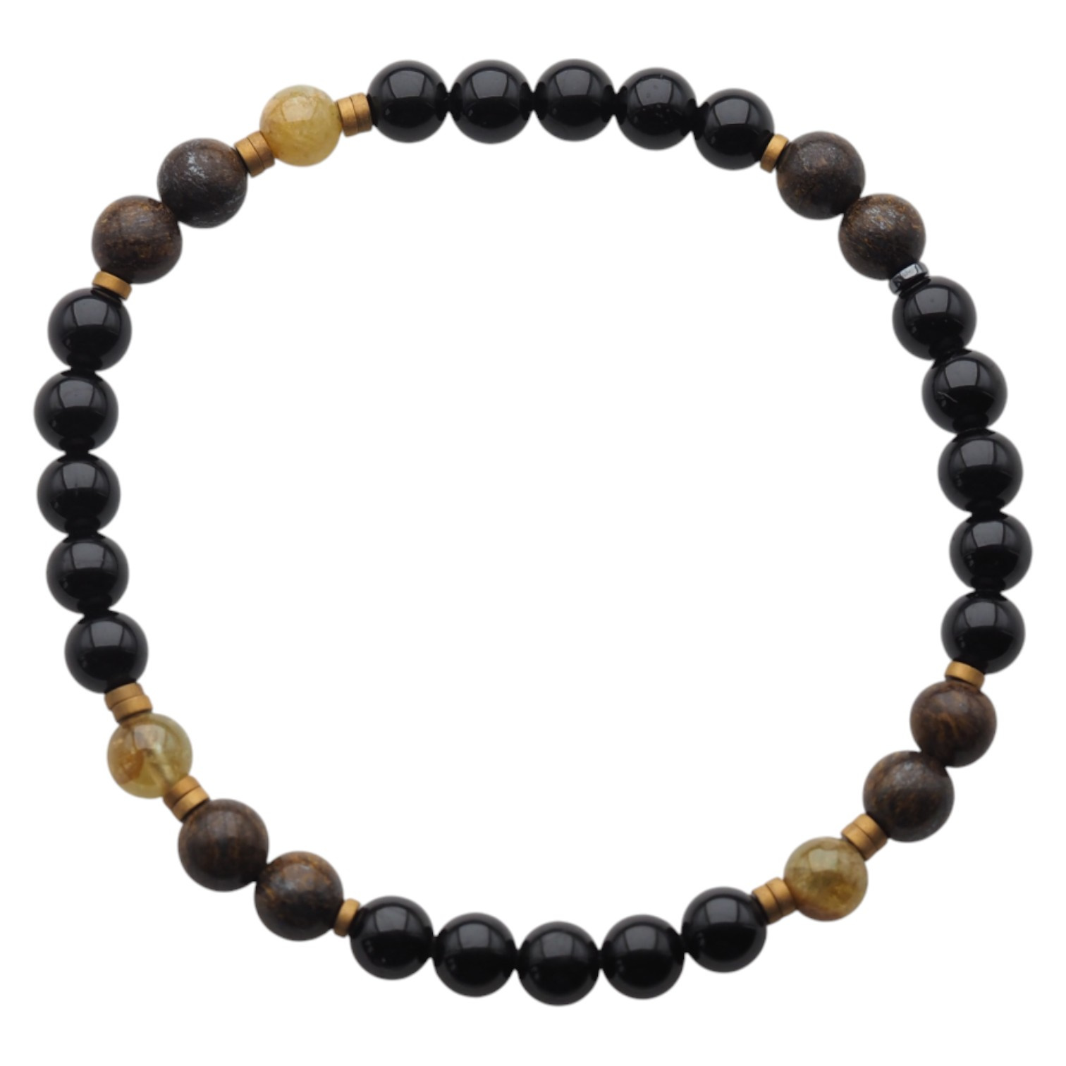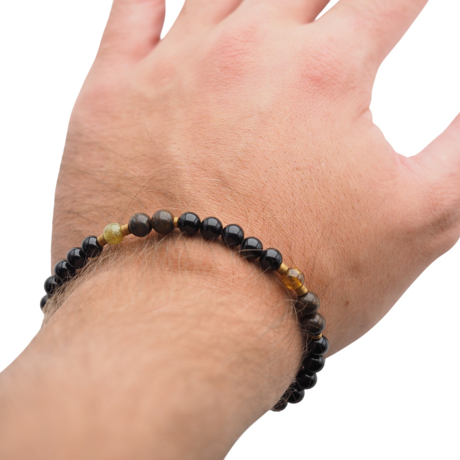 Bransoletka męska z czarnego Turmalinu, Bronzytu, Granatu Zielonego i złotego Hematytu – ręcznie wykonana, na gumce silikonowej