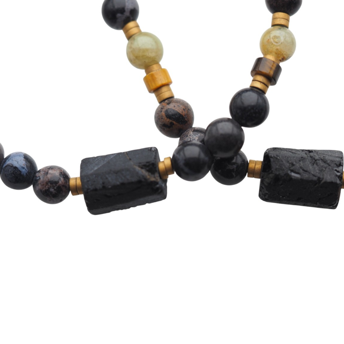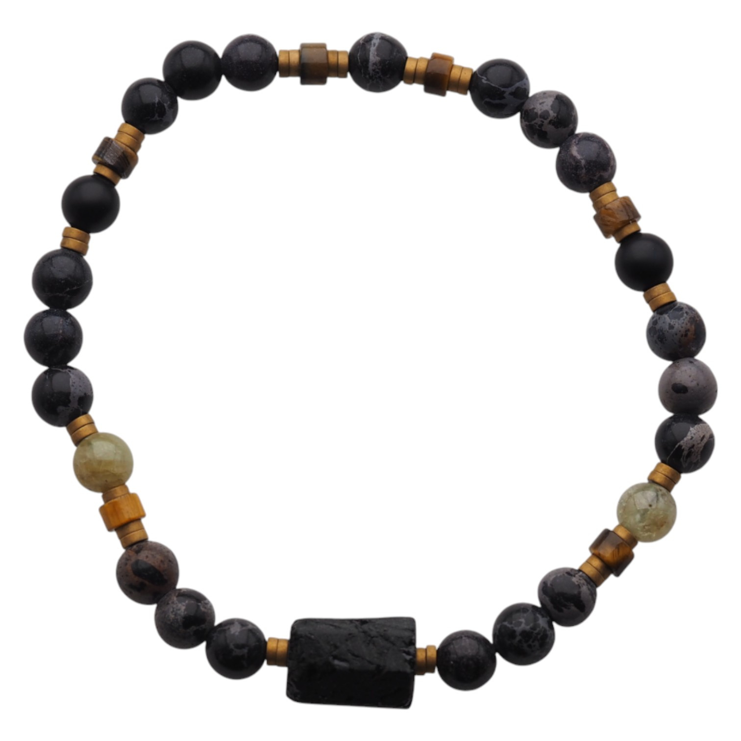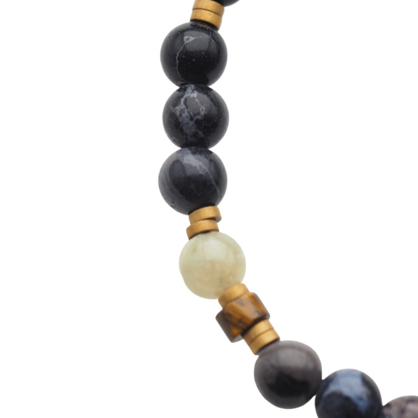 Ręcznie wykonana bransoletka męska stworzona z naturalnych kamieni półszlachetnych – czarnego Turmalinu, Jaspisu, Granatu Zielonego, Tygrysiego Oka i złotego Hematytu. Połączenie czerni, złota i ziemistych tonów brązu tworzy wyjątkową, męską kompozycję inspirowaną siłą natury i stabilnością żywiołów.