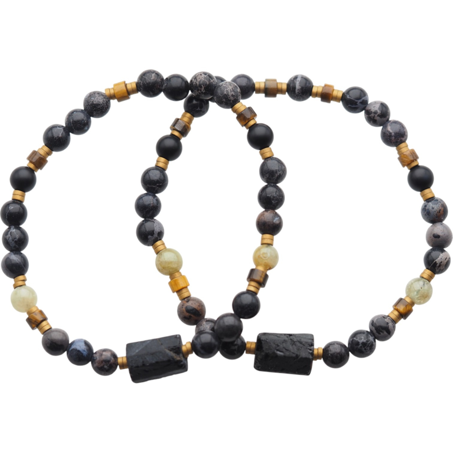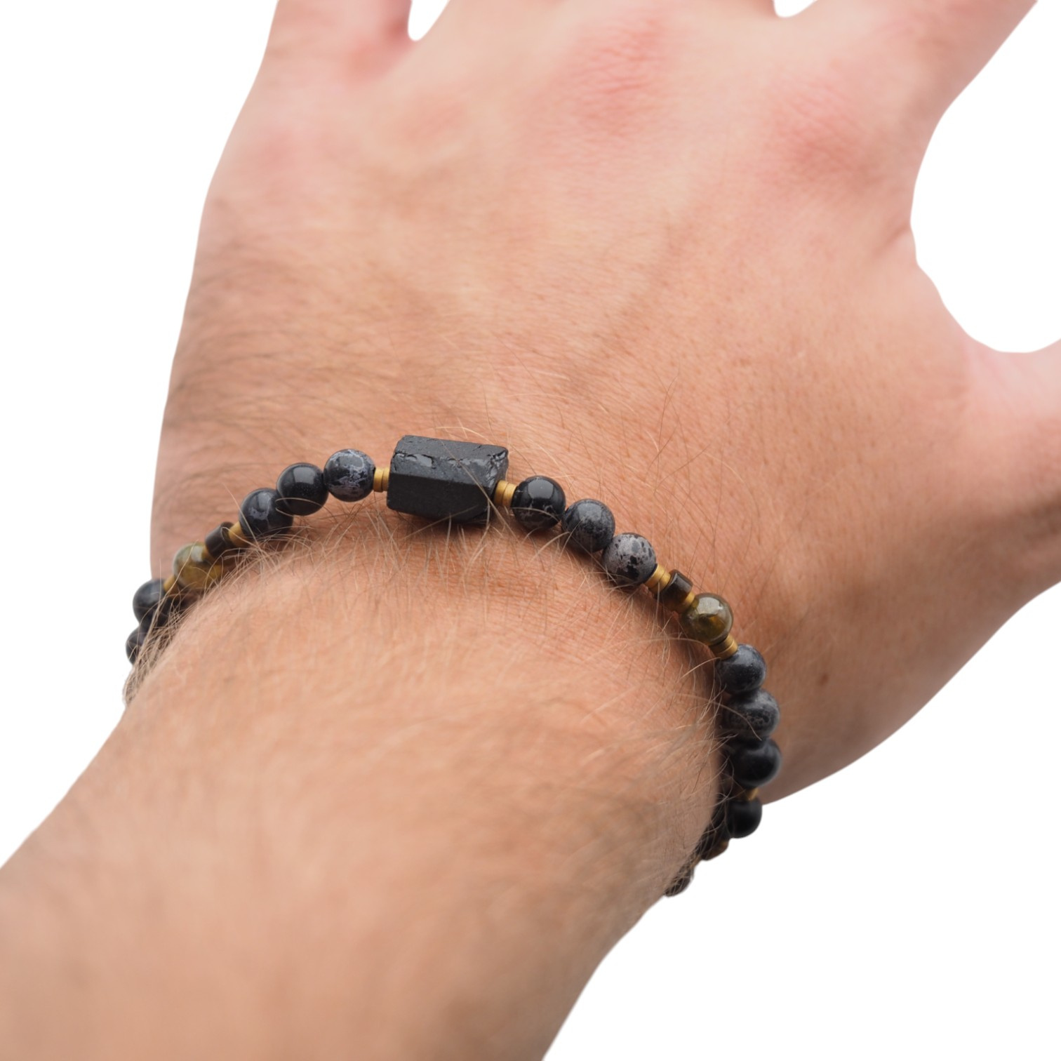 Bransoletka męska z czarnego Turmalinu, Jaspisu, Granatu Zielonego, Tygrysiego Oka i złotego Hematytu – ręcznie wykonana, na gumce silikonowej