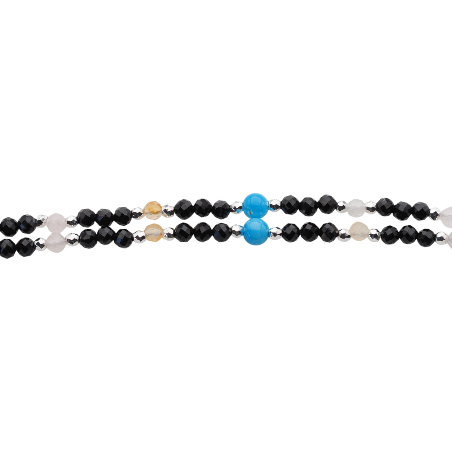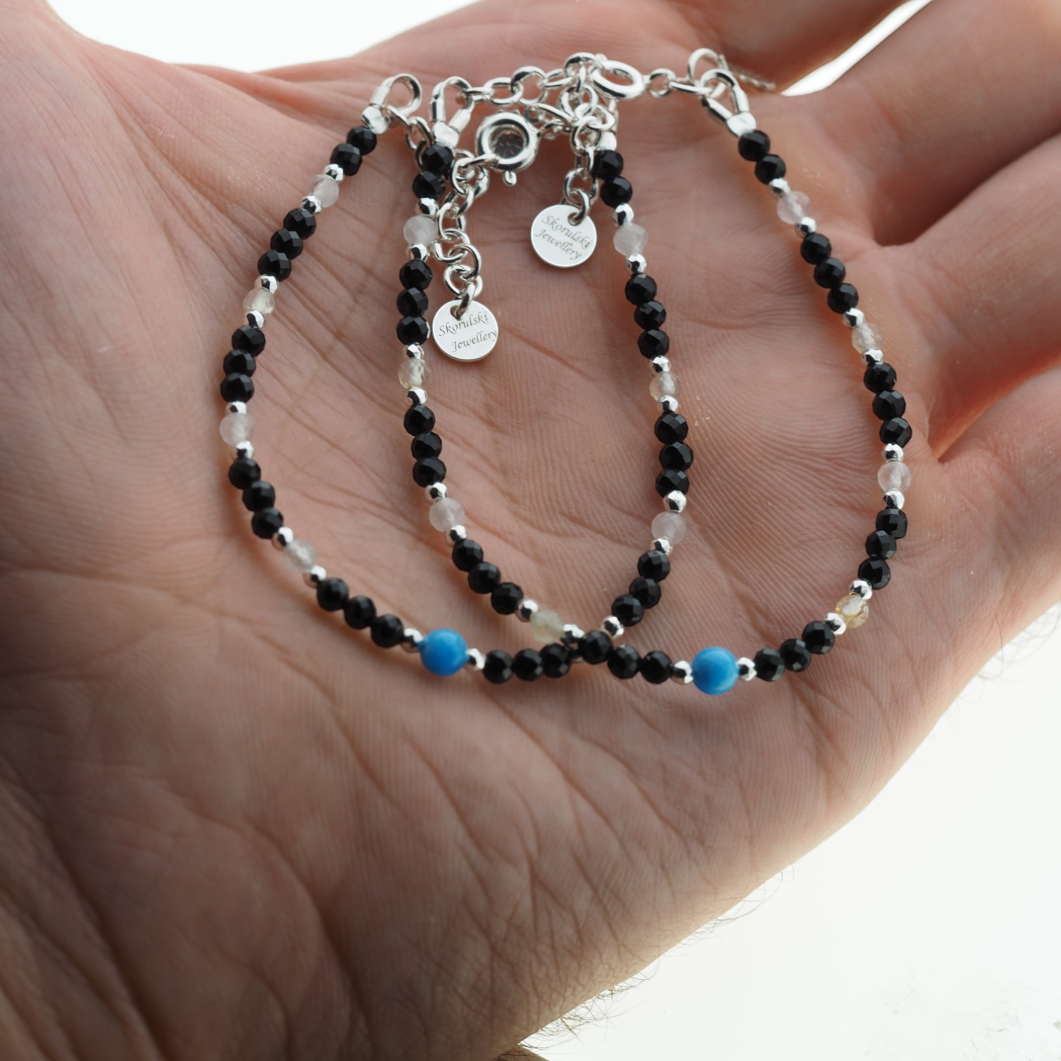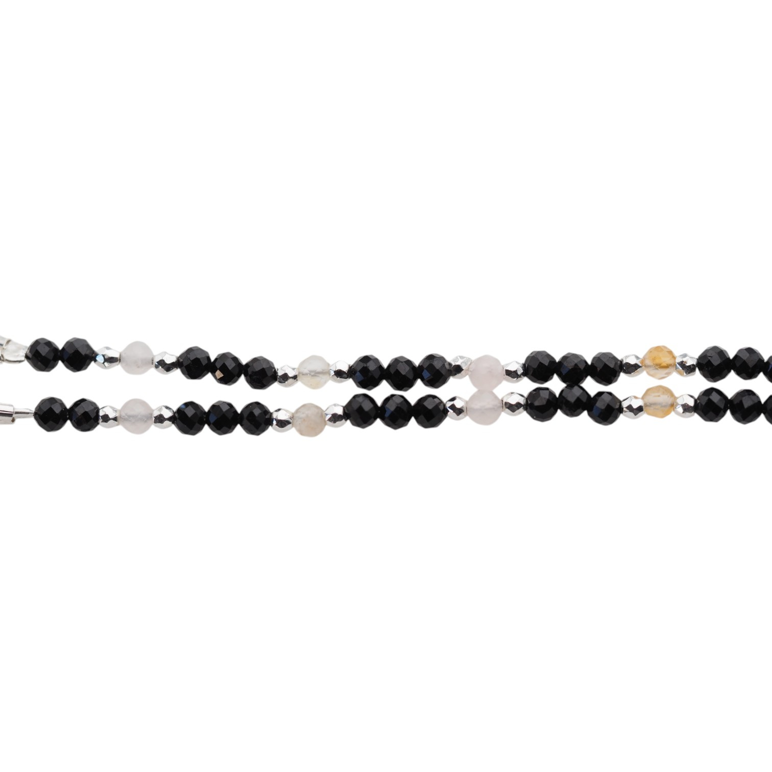 Bransoletka z Apatytem, czarnym Turmalinem, Cytrynem, Kwarcem Różowym i Hematytem została wykonana ręcznie na lince stalowej.