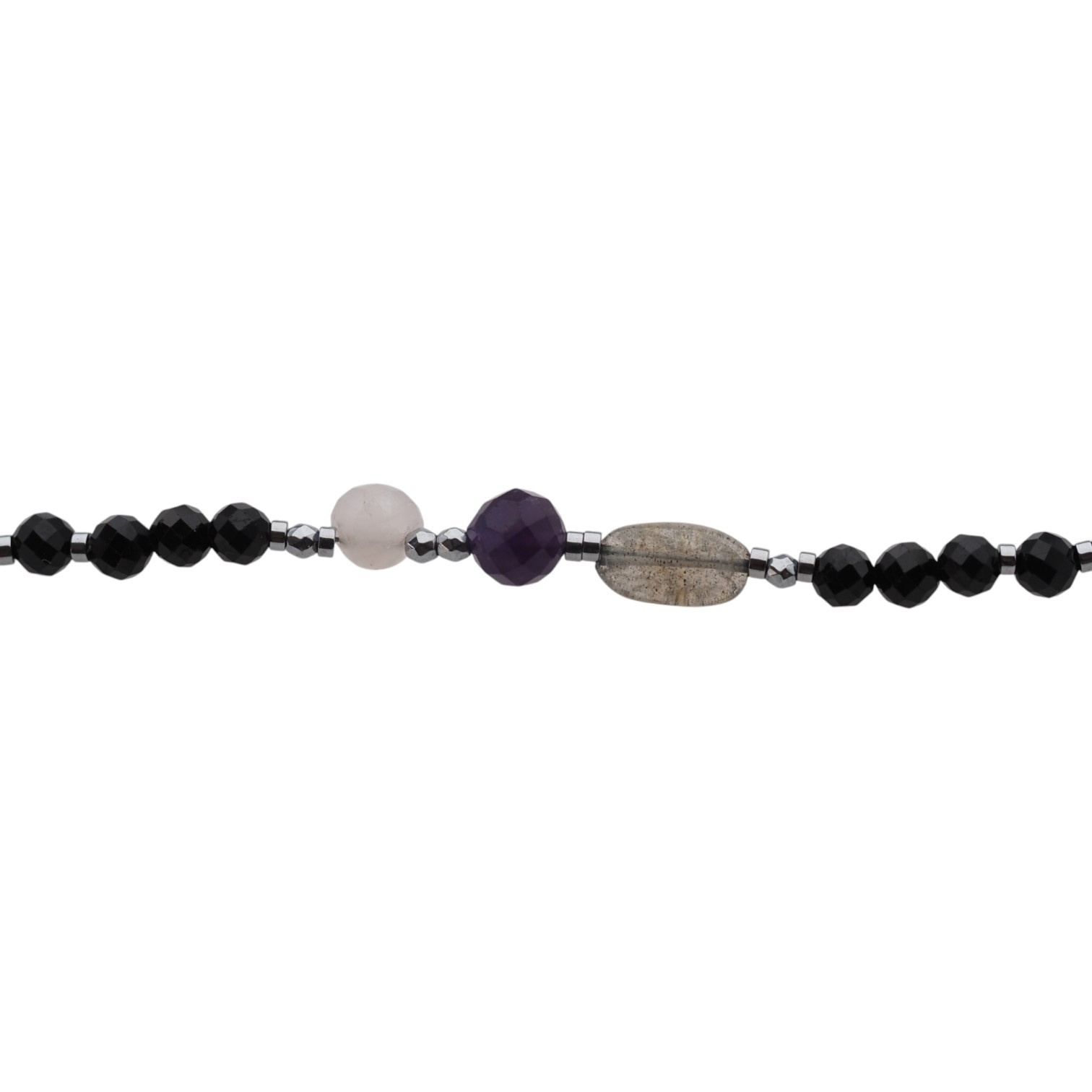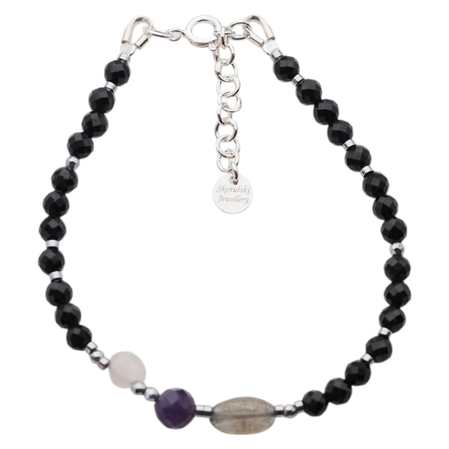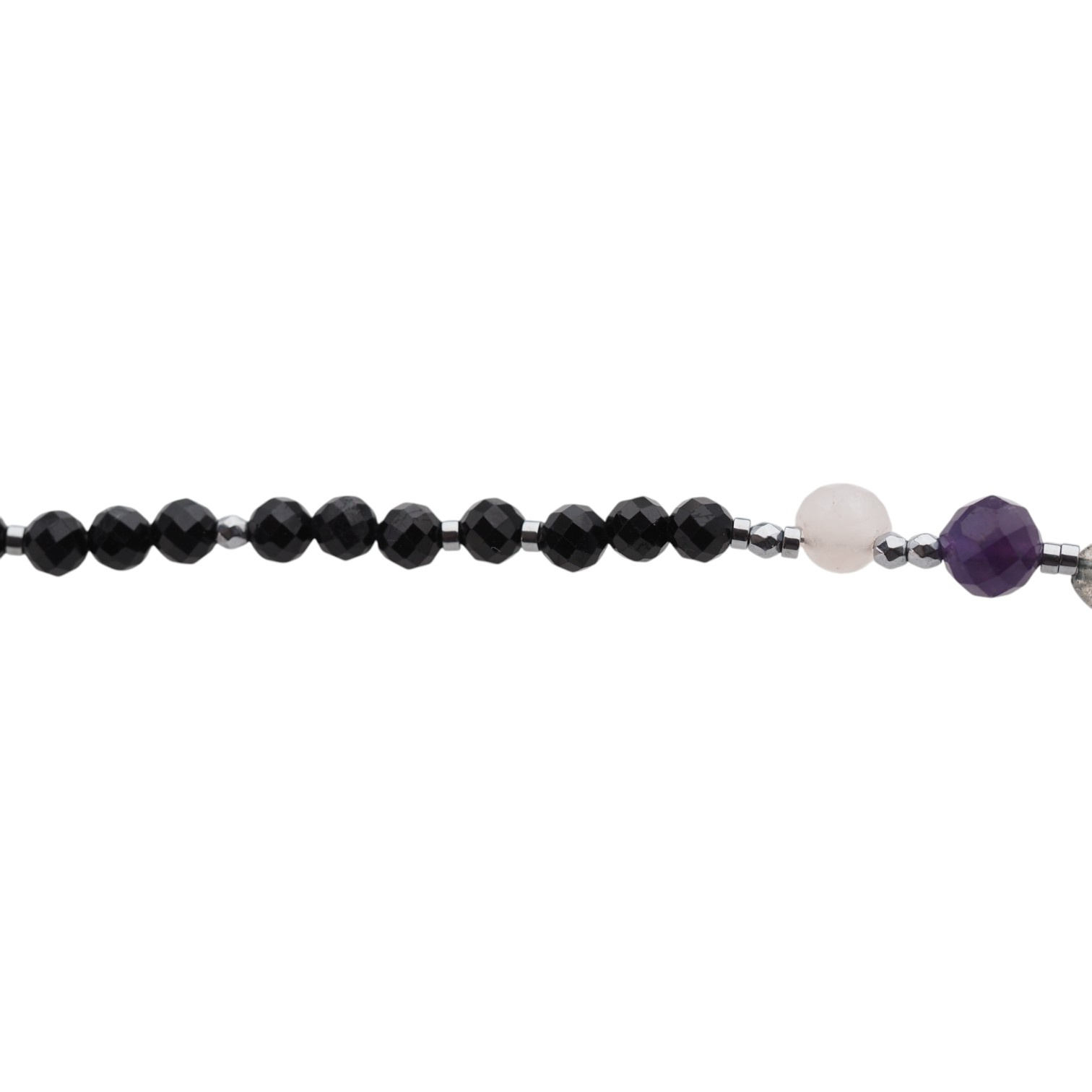 Bransoletka z czarnym Turmalinem, Labradorytem, Kwarcem Różowym, Ametystem i Hematytem została wykonana ręcznie na lince stalowej.