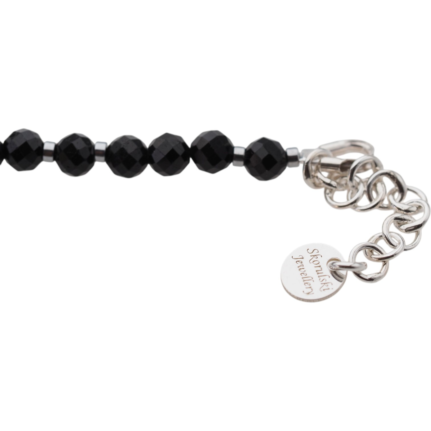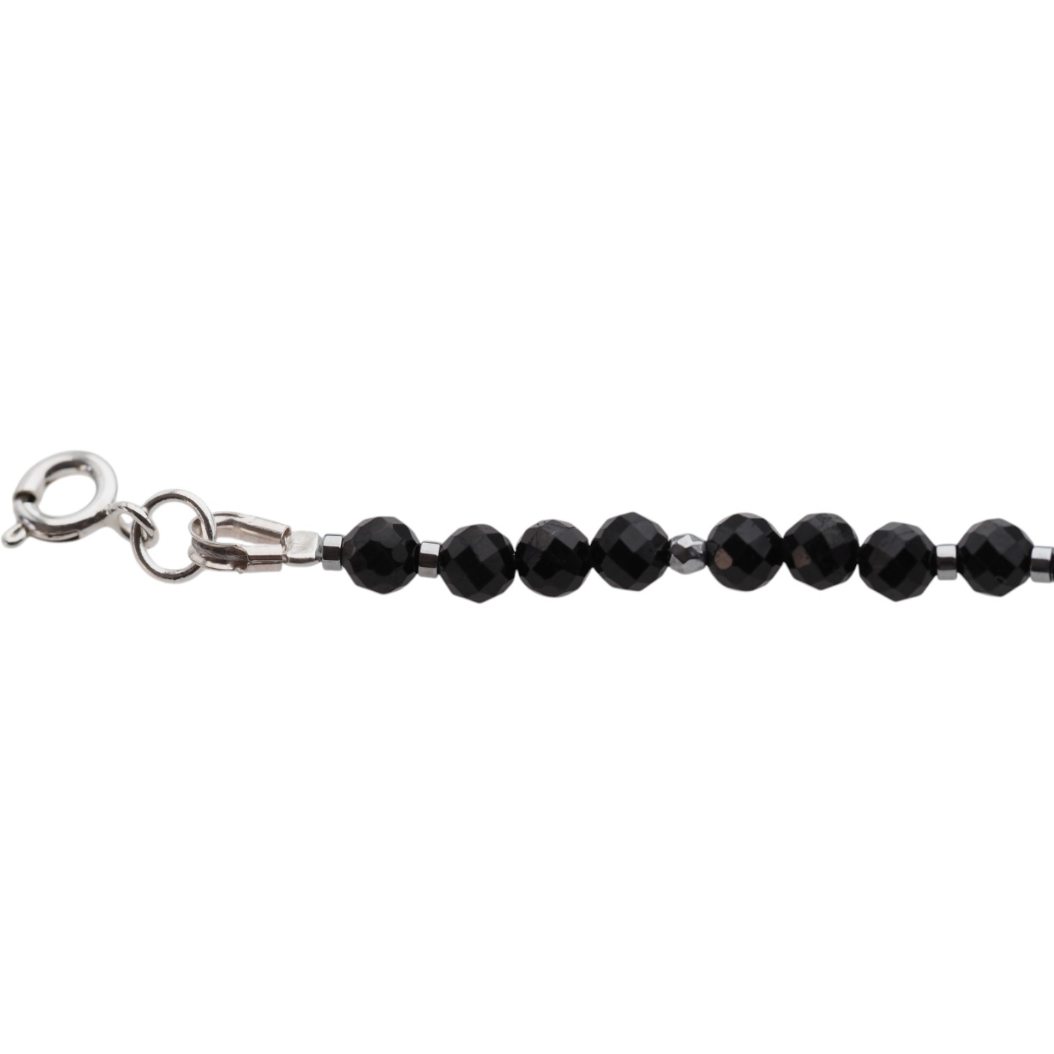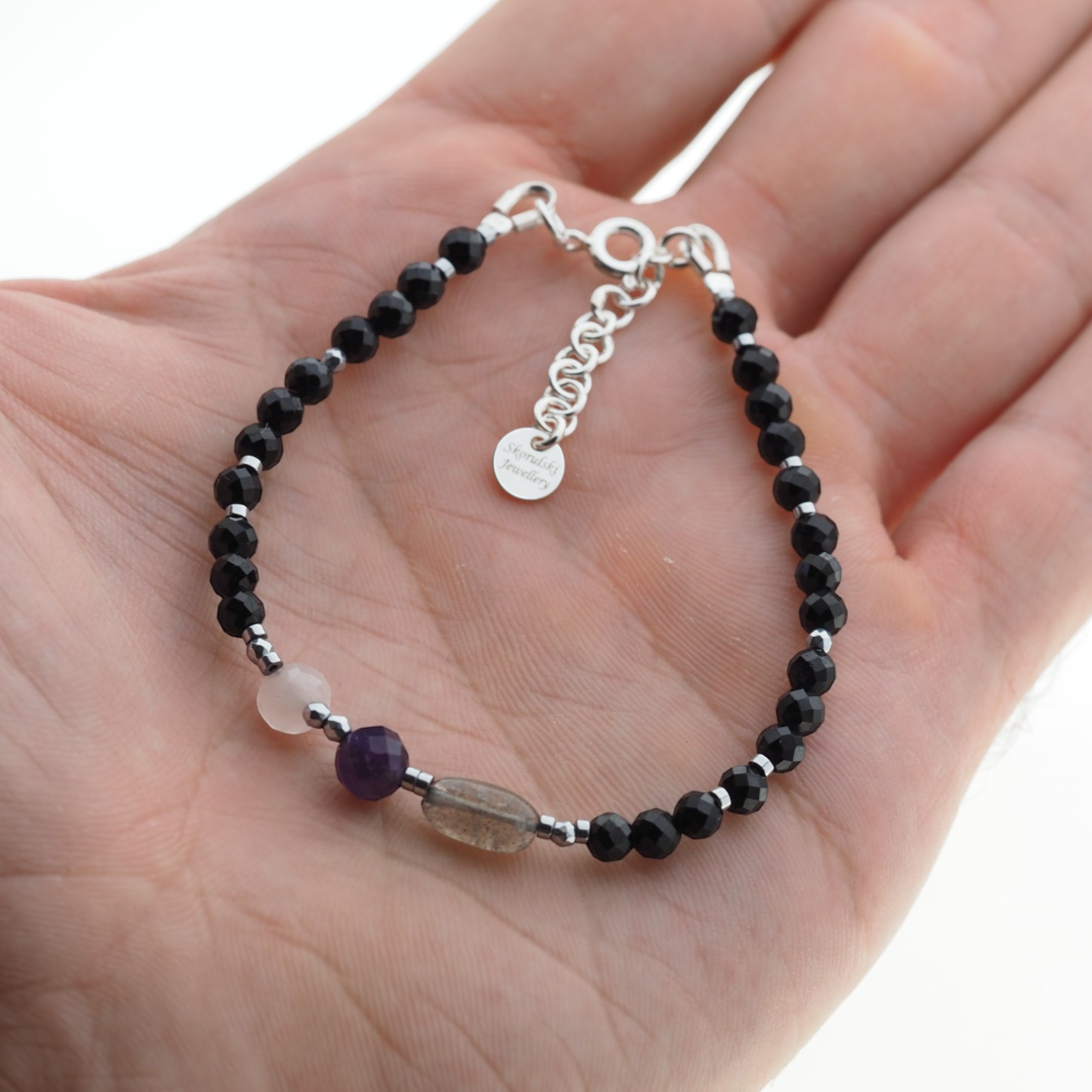 Bransoletka z czarnym Turmalinem, Labradorytem, Kwarcem Różowym, Ametystem i Hematytem została wykonana ręcznie na lince stalowej.