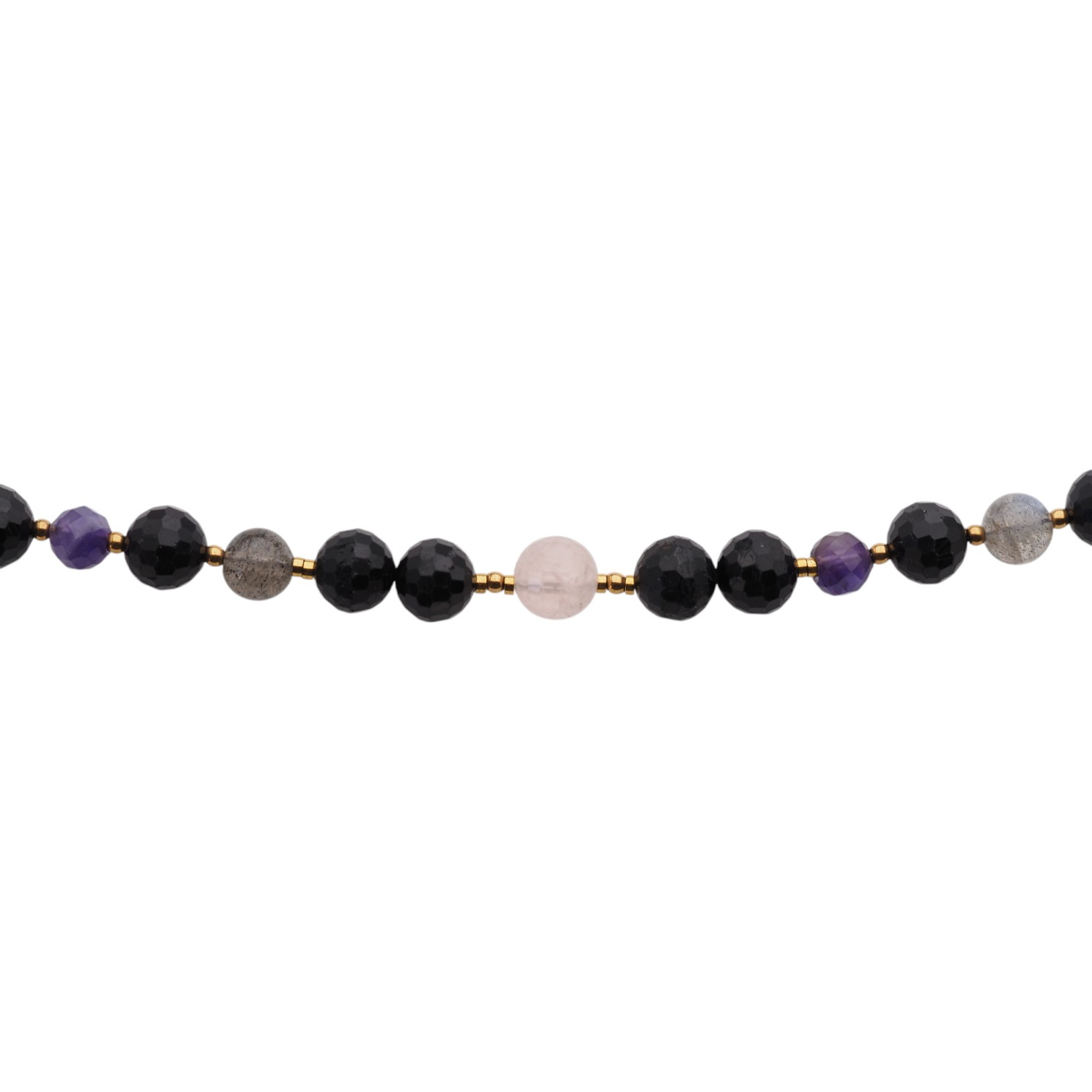 Bransoletka z czarnym Turmalinem, Labradorytem, Kwarcem Różowym, Ametystem i Hematytem została wykonana ręcznie na lince stalowej.