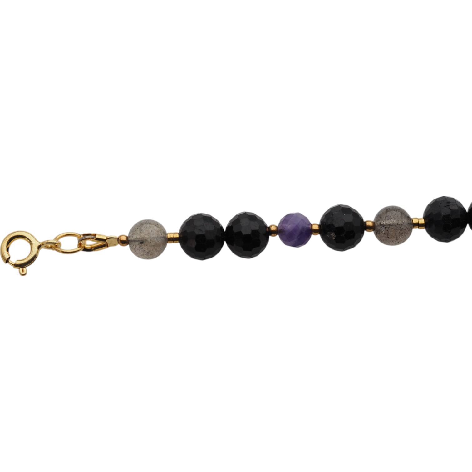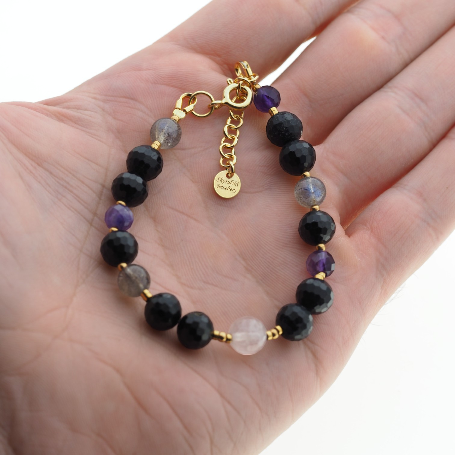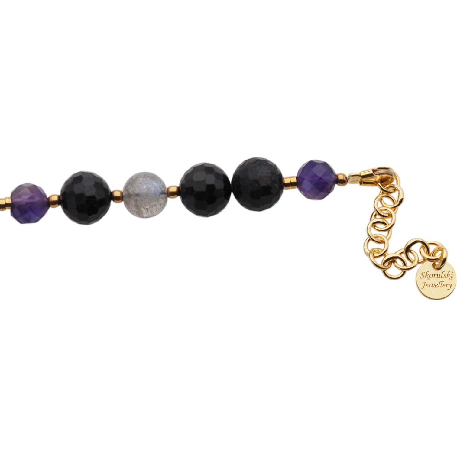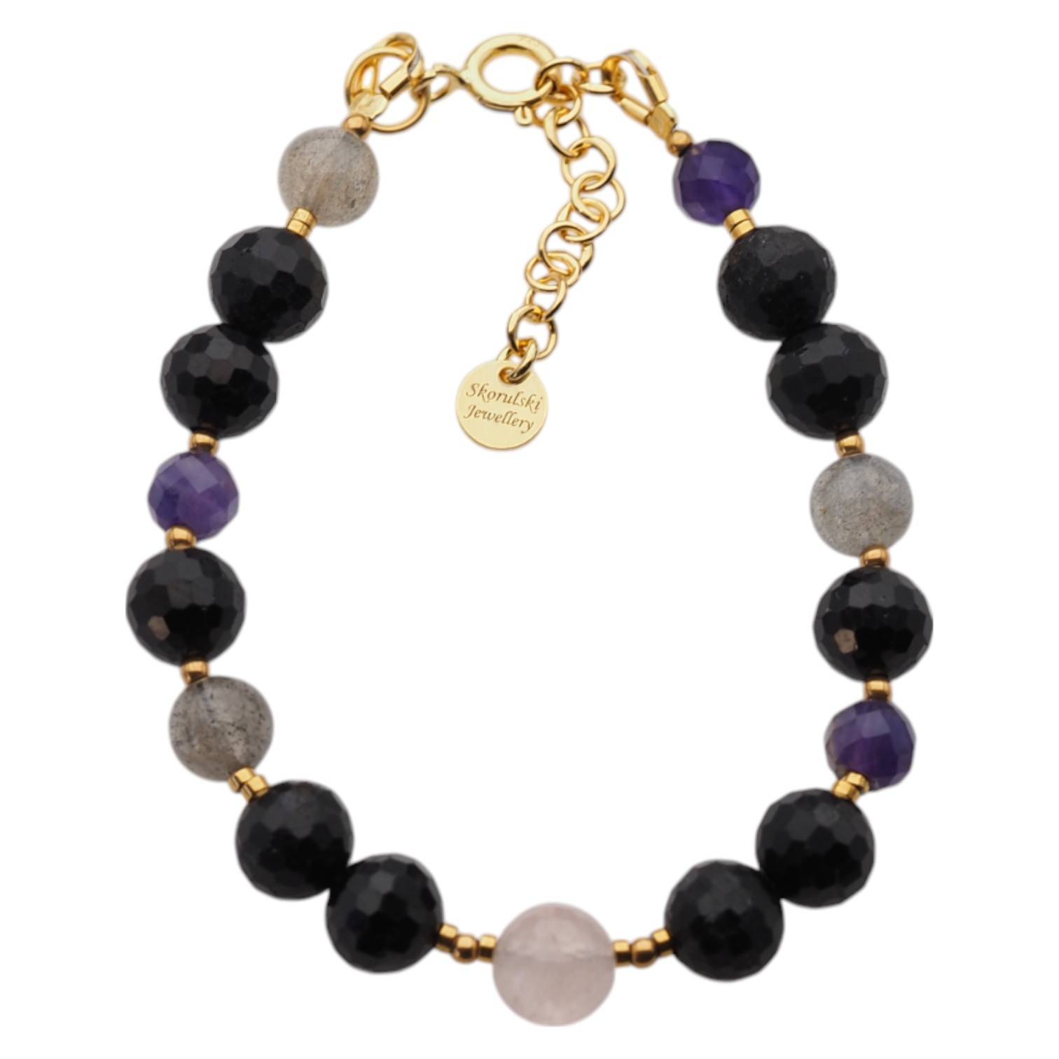 Bransoletka mix - Turmalin, ametyst, kwarc różowy, labradoryt i srebro złocone