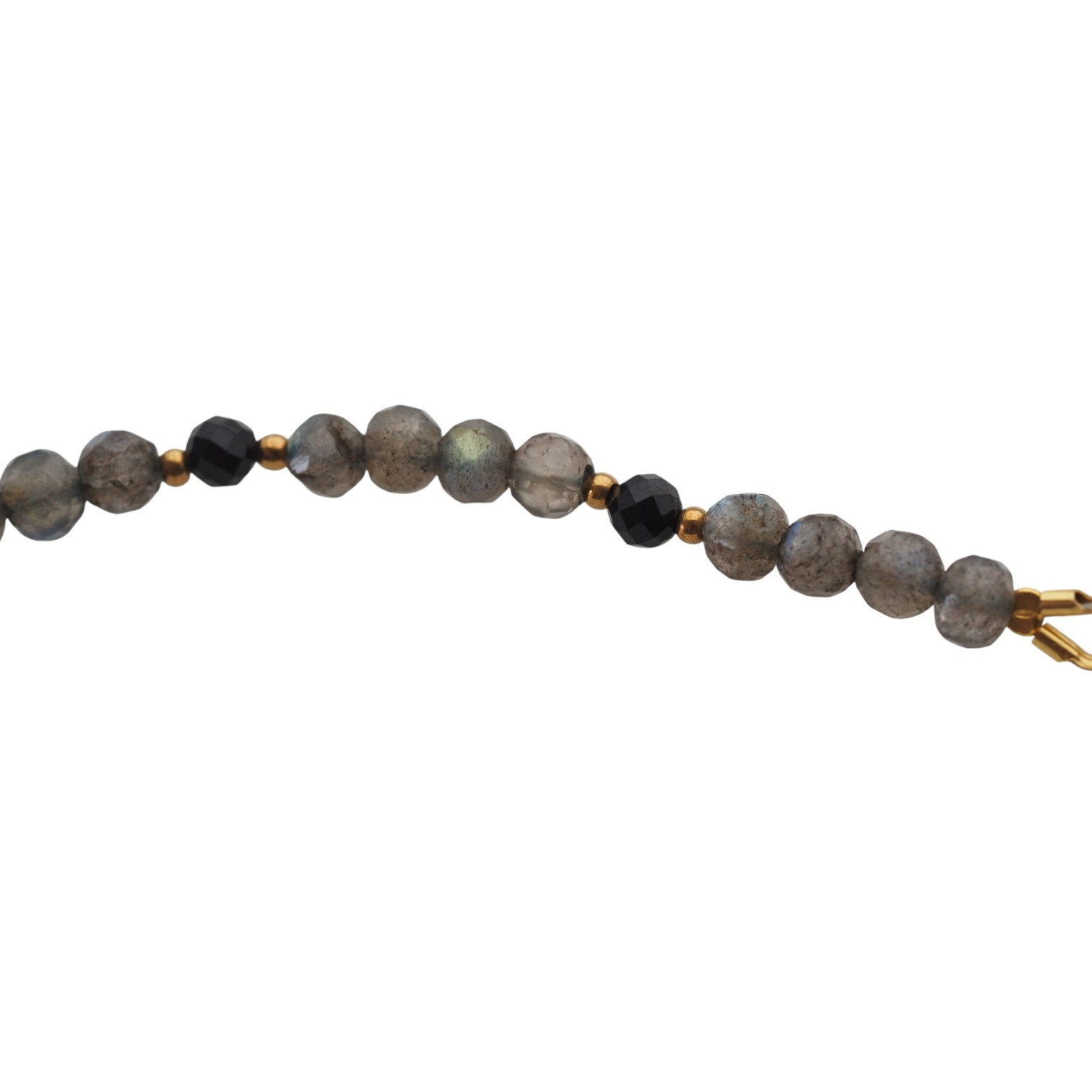 Bransoletka z czarnym Turmalinem, Labradorytem, Kwarcem Różowym, Ametystem i Hematytem została wykonana ręcznie na lince stalowej.