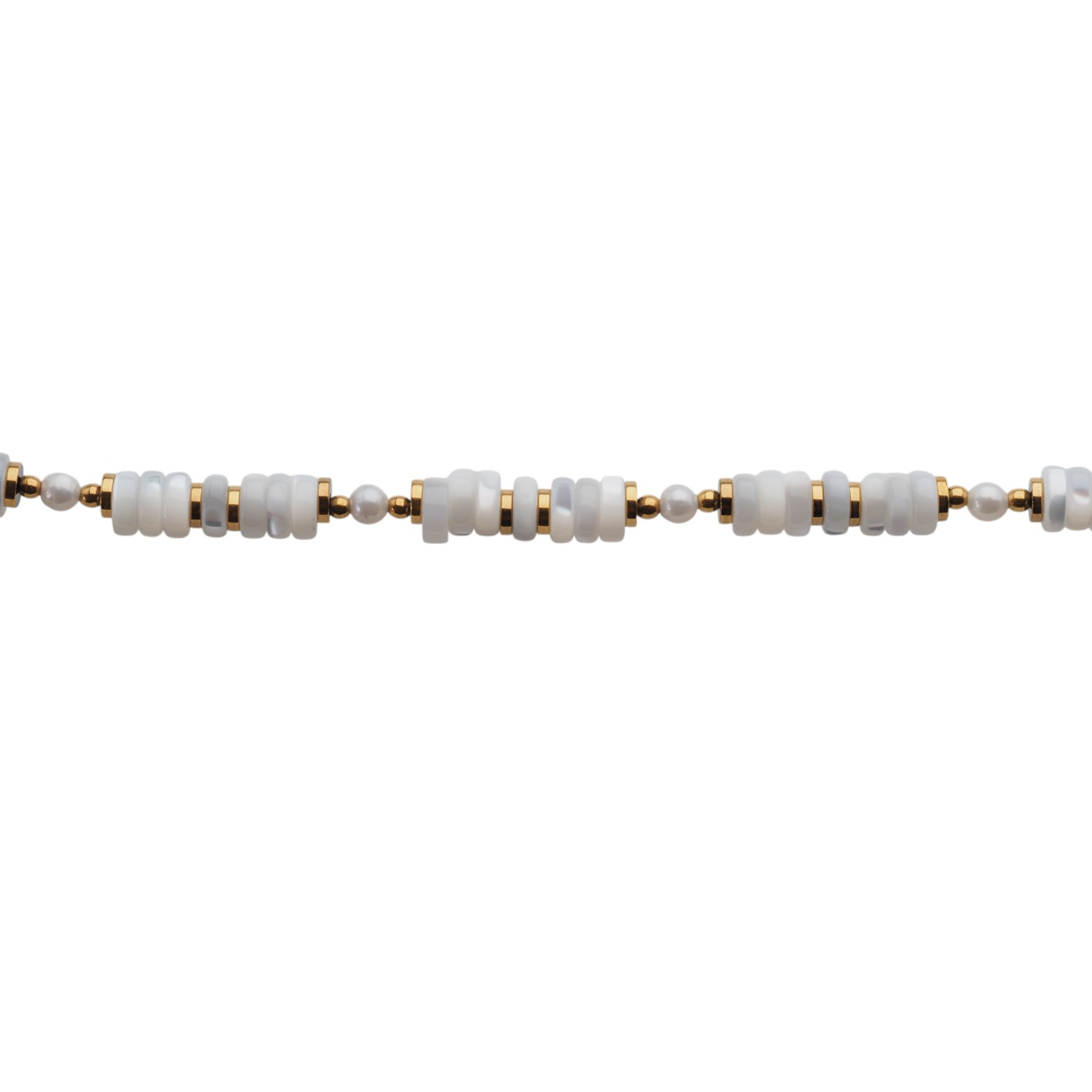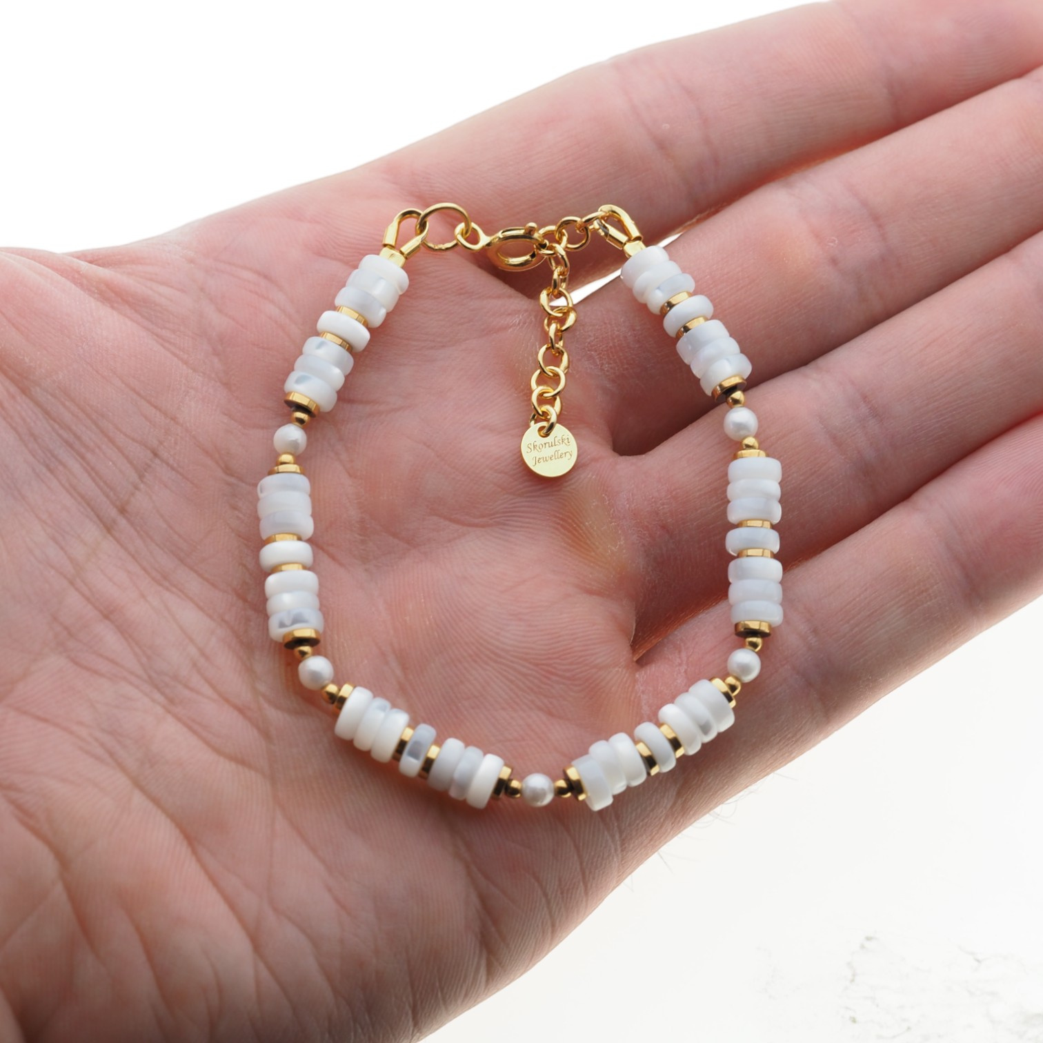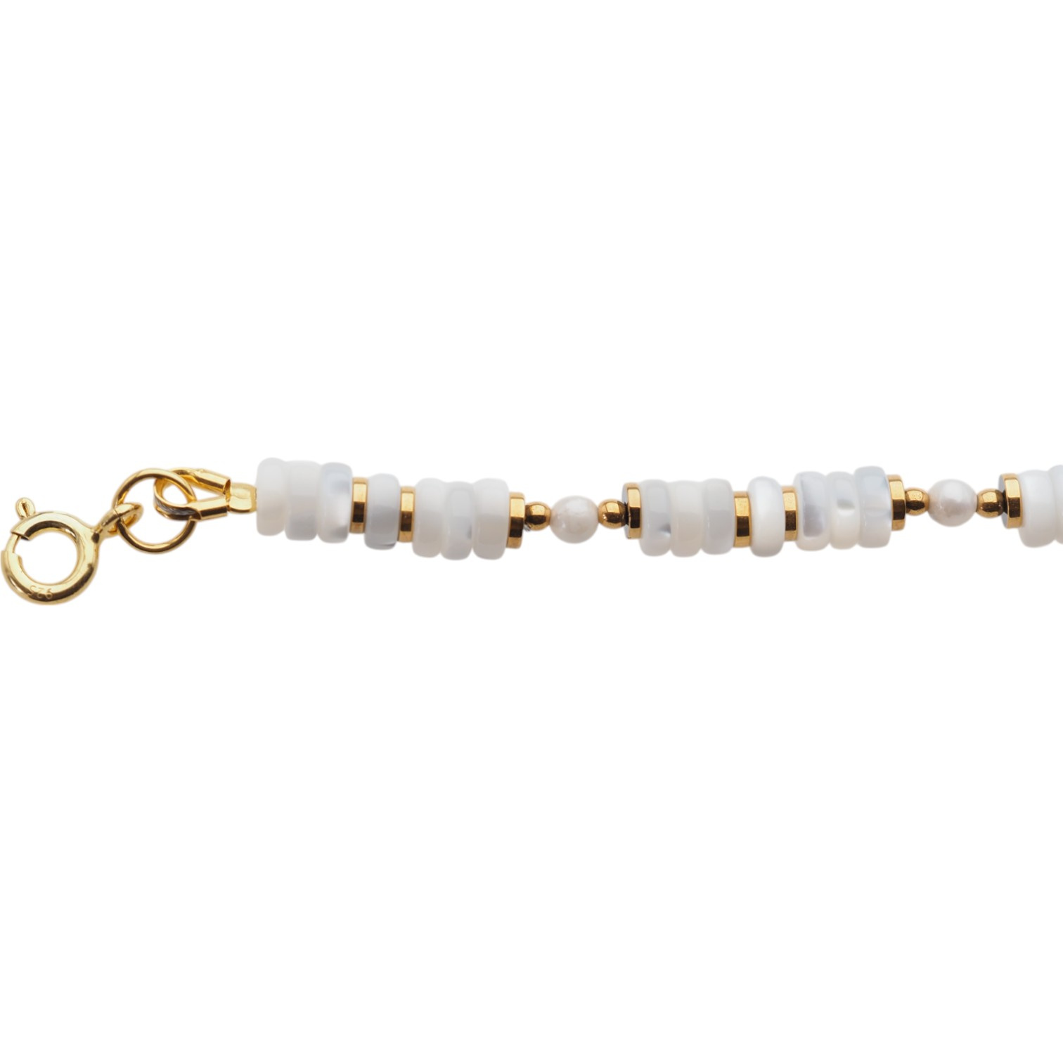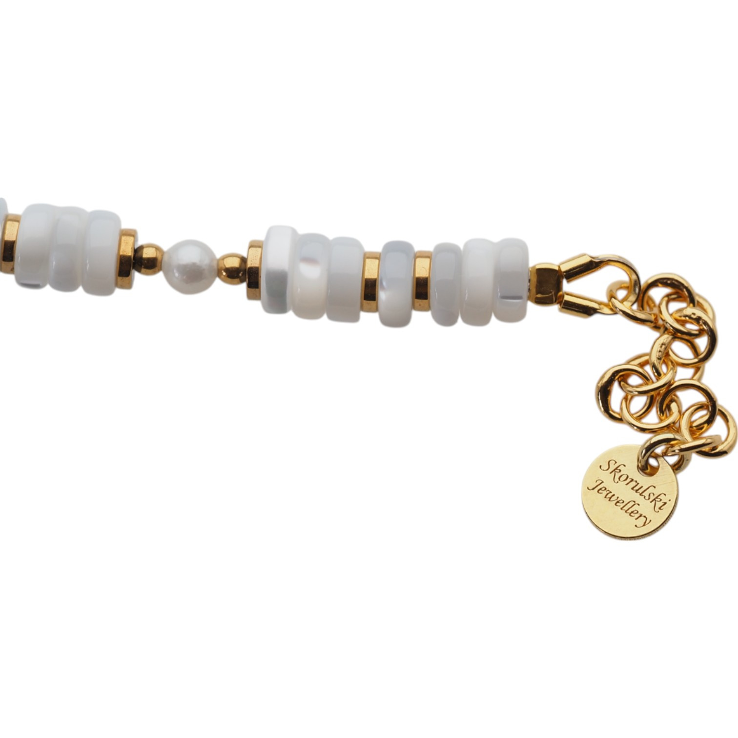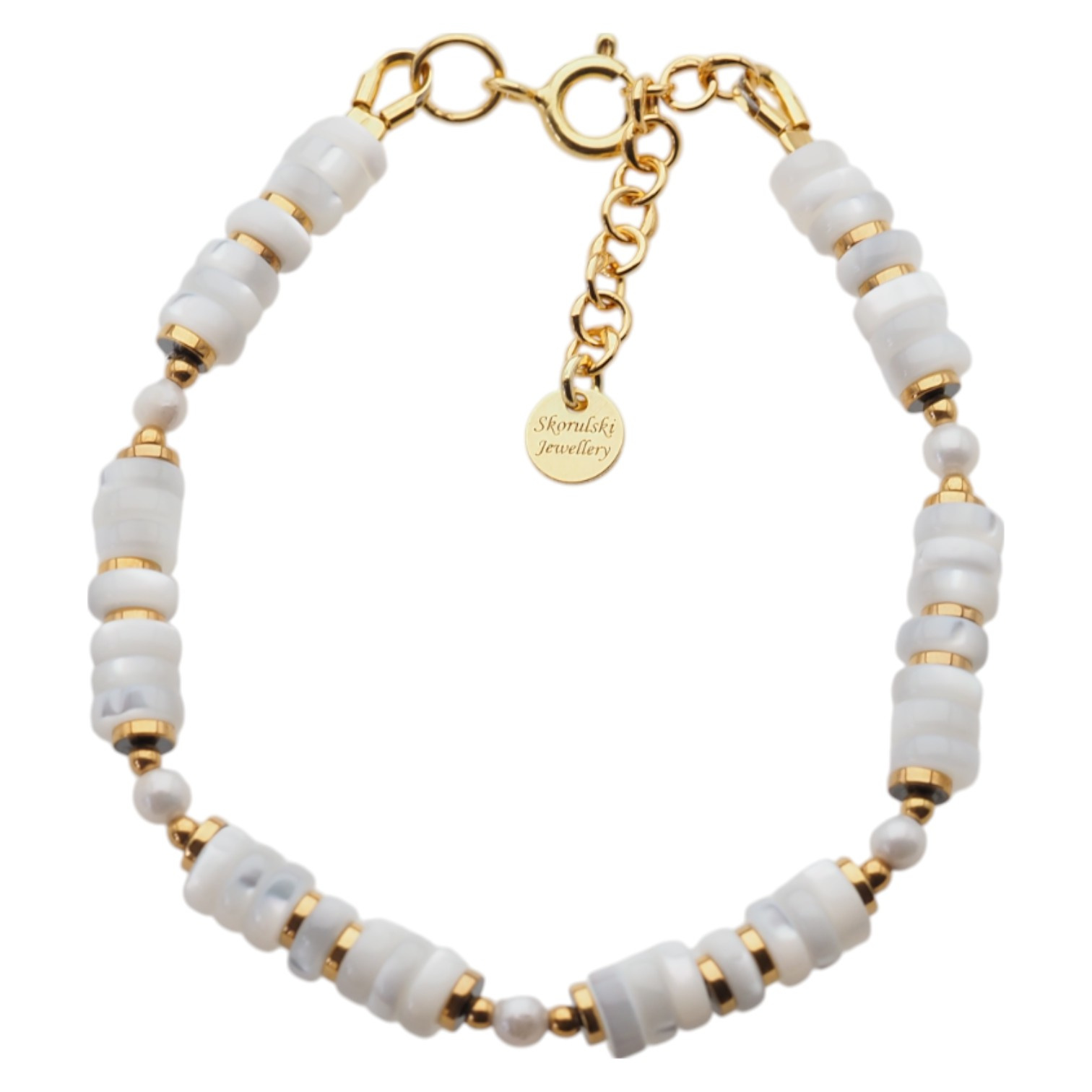 Bransoletka z Muszlą, białą Perłą, złotym Hematytem została wykonana ręcznie na lince stalowej.