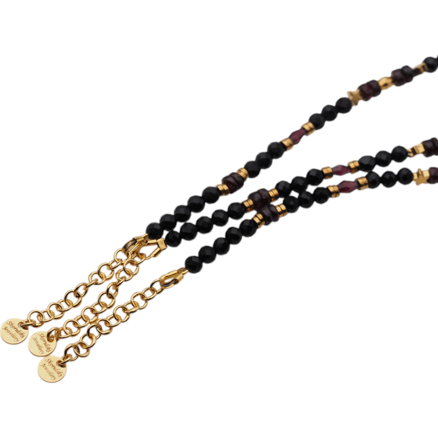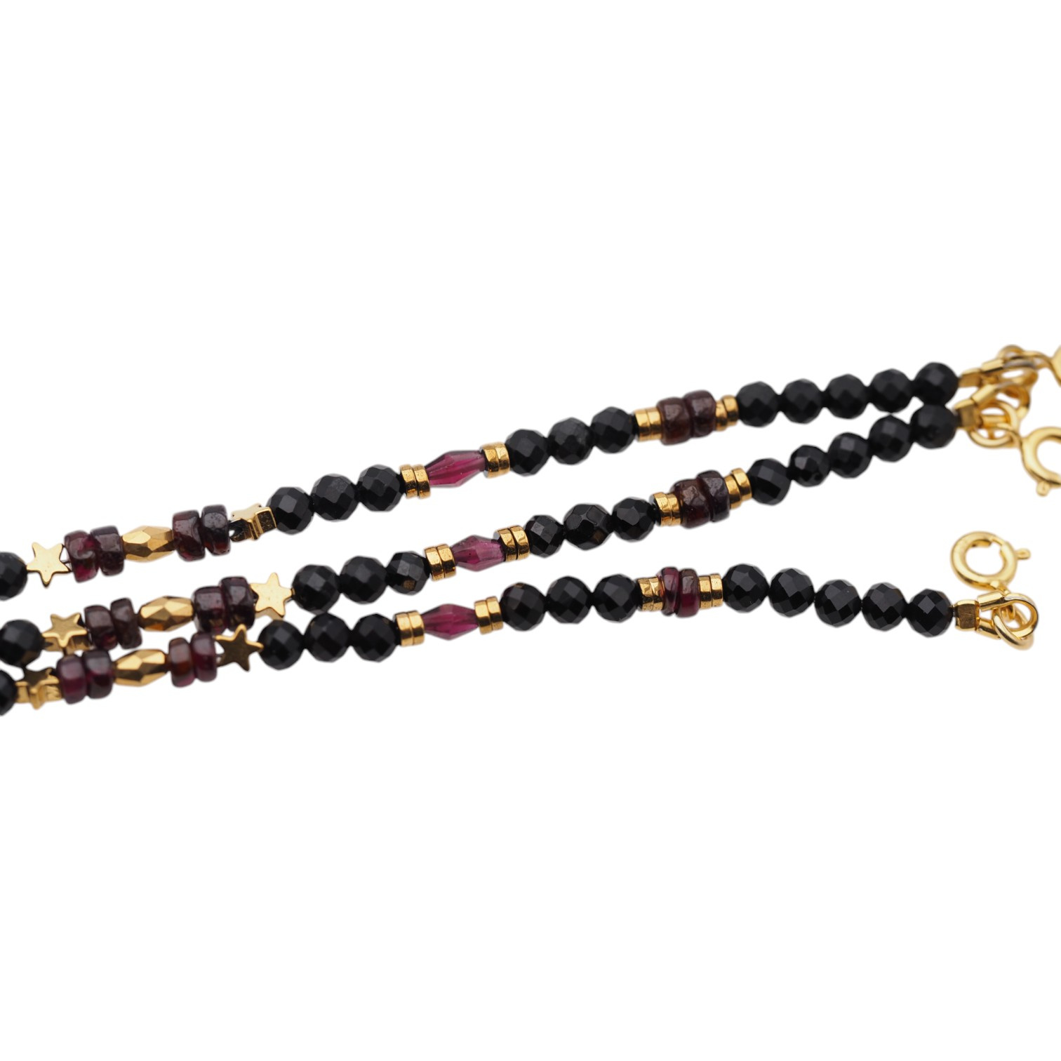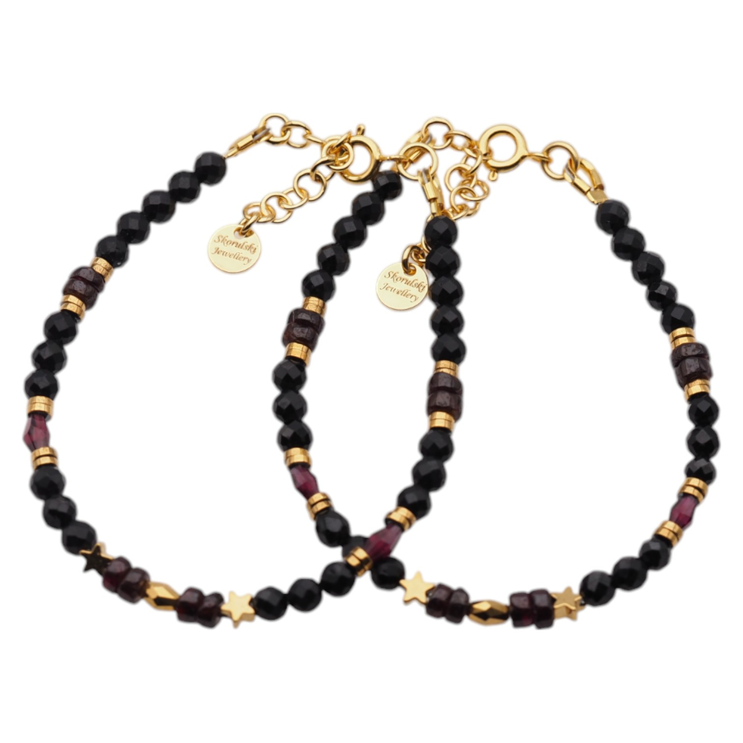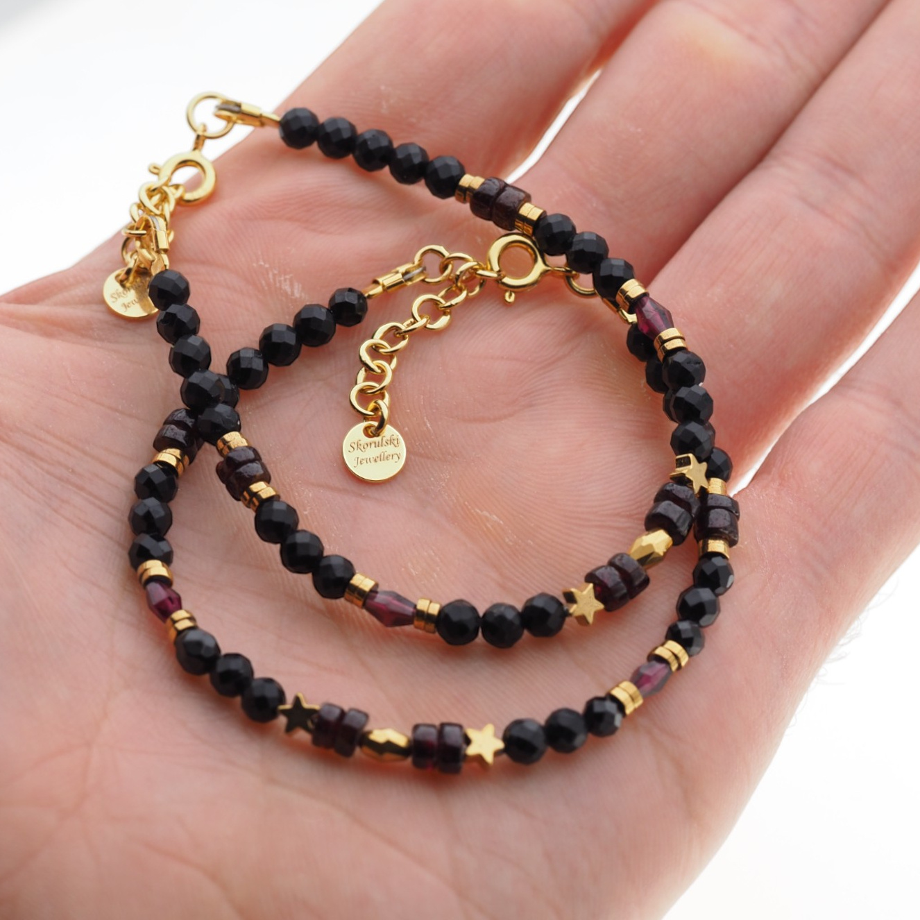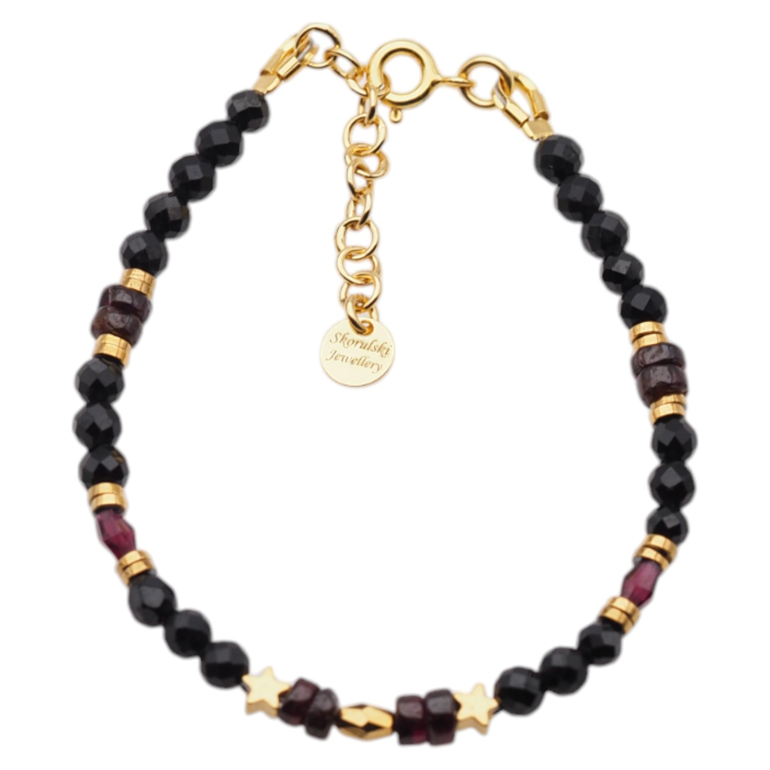 Bransoletka regulowana - Granat, Turmalin czarny, gwiazdki i srebro złocone (świąteczne)