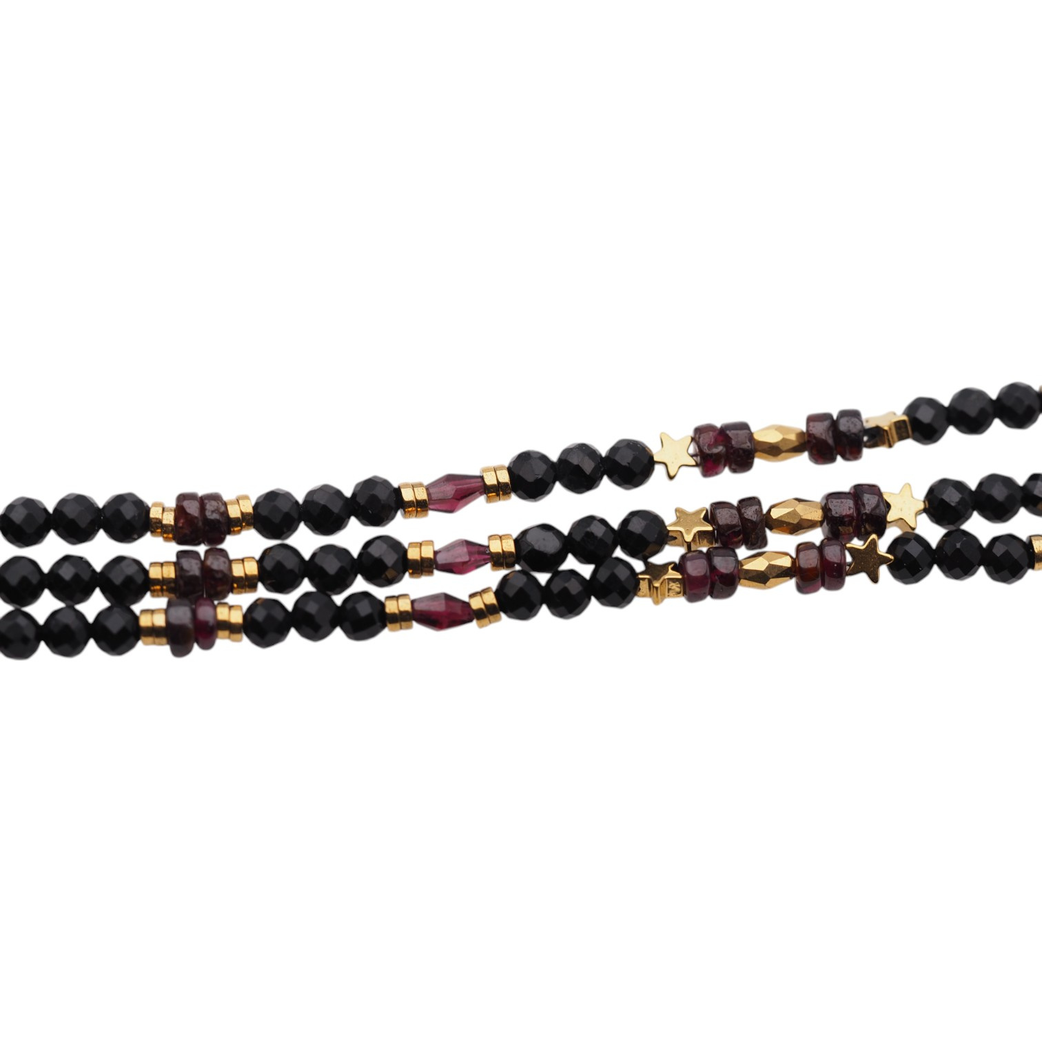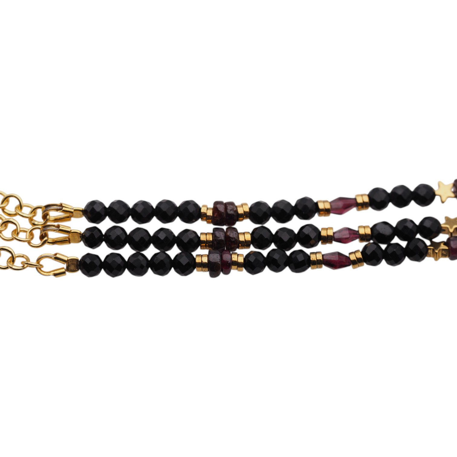 Bransoletka z Granatem, czarnym Turmalinem i Hematytem została wykonana ręcznie na lince stalowej.