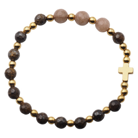 Bransoletka składa się z fasetowanych kulek bronzytu o średnicy 6 mm oraz większych kulek Kamienia Słonecznego o średnicy 8 mm, które nadają całości jasny, ciepły akcent. Całość uzupełniają polerowane kulki hematytu złoconego 24-karatowym złotem (4 mm) oraz krzyż z hematytu w tym samym wykończeniu o wymiarach 10 × 8 mm.