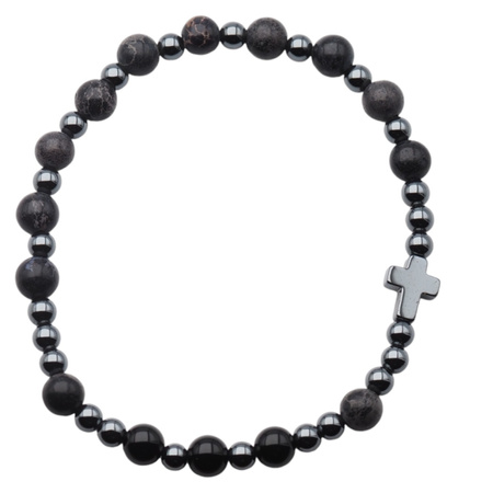 Bransoletka składa się z polerowanych kulek czarnego Turmalinu oraz Jaspisu o średnicy 6 mm, które tworzą harmonijną, ciemną kompozycję o spokojnym i wyważonym charakterze. Całość uzupełniają polerowane kulki hematytu o średnicy 4 mm oraz krzyż z hematytu o wymiarach 10 × 8 mm, nadające bransoletce spójny i elegancki wygląd.