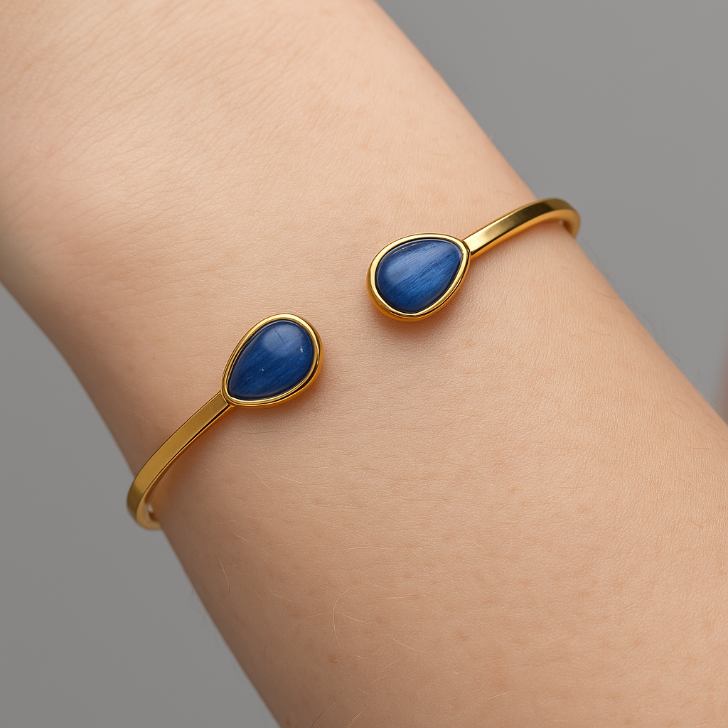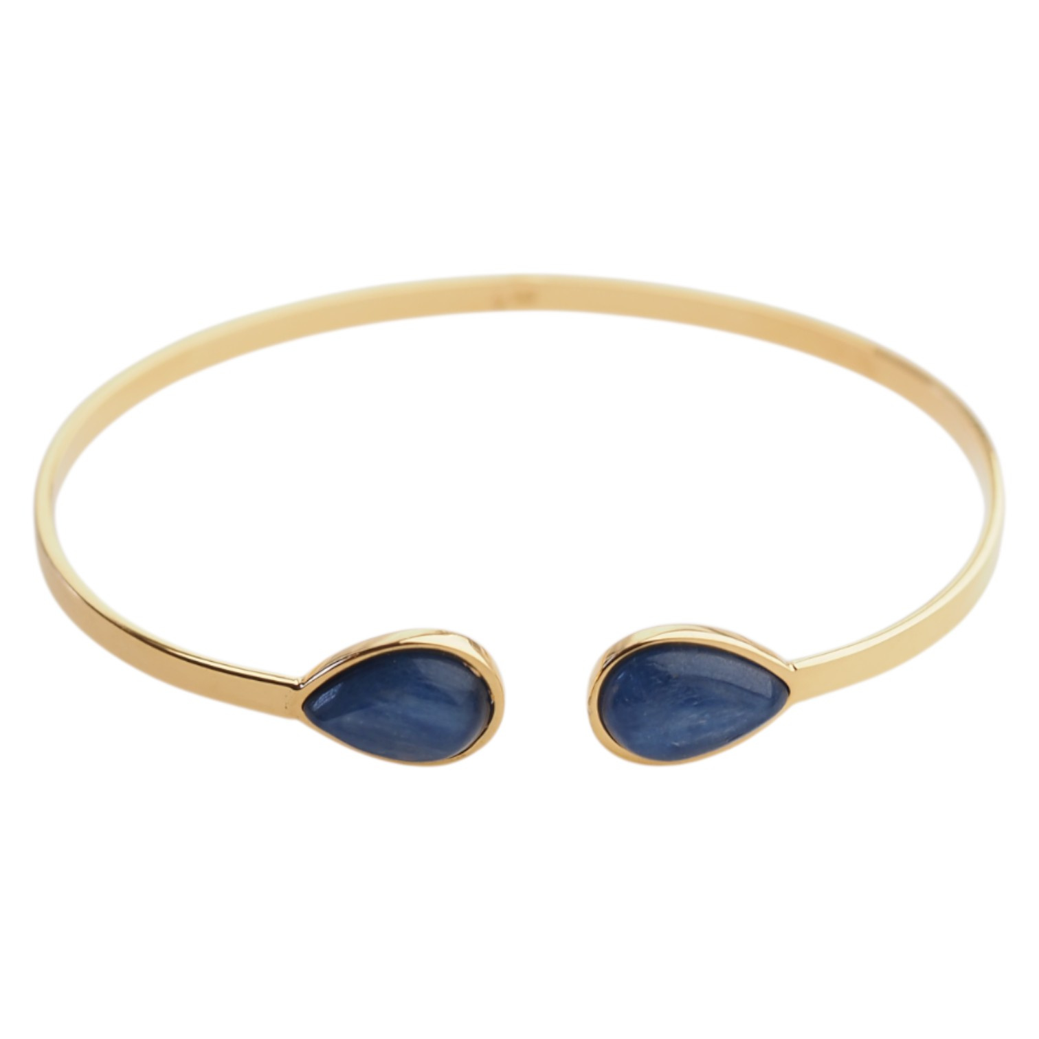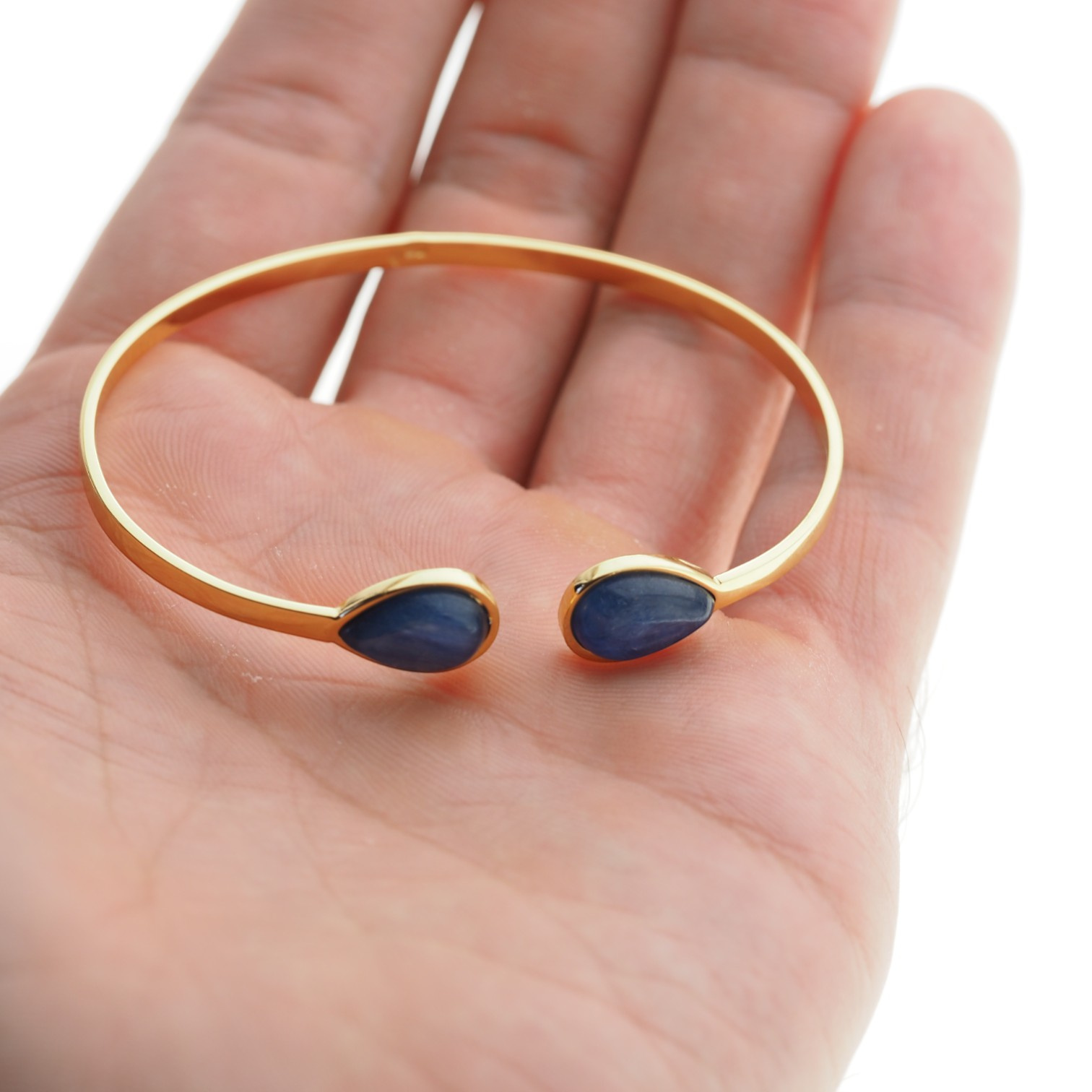 Ręcznie wykonana, sztywna bransoletka z naturalnymi kyanitami, osadzonymi w prostej, klasycznej oprawie ze srebra próby 925, pokrytego warstwą 24-karatowego złota. Minimalistyczna forma pozwala w pełni wyeksponować piękno kamieni, które mają kształt łez i głęboki, niebieski odcień z charakterystycznymi, subtelnymi smugami.