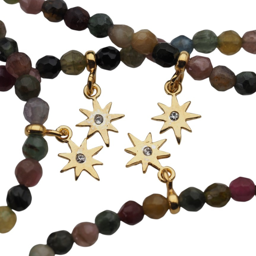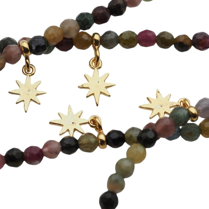 Ręcznie wykonana bransoletka z kolorowego, fasetowanego Turmalinu to subtelna i energetyzująca ozdoba o głębokiej symbolice. Naturalne kamienie w odcieniach różu, zieleni i brązu zostały nanizane na stalową linkę, a całość uzupełniają pozłacane elementy ze srebra próby 925. Dodatkowym akcentem jest delikatna zawieszka w kształcie gwiazdy północy z wklejoną cyrkonią — symbol ochrony i prowadzenia.