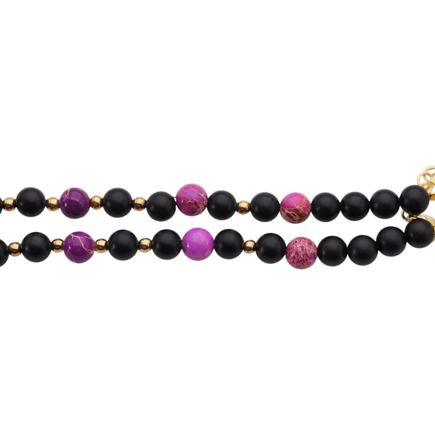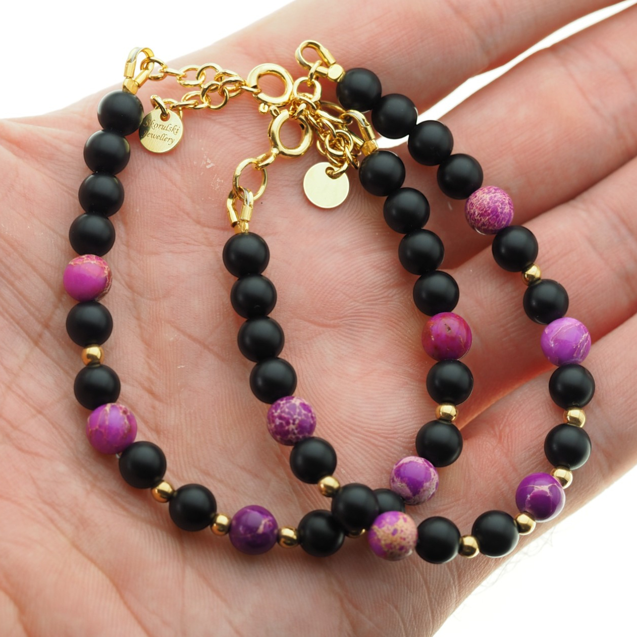 Bransoletka z fioletowym Jaspisem cesarskim i Onyksem – ręcznie wykonana, srebro pozłacane 24k