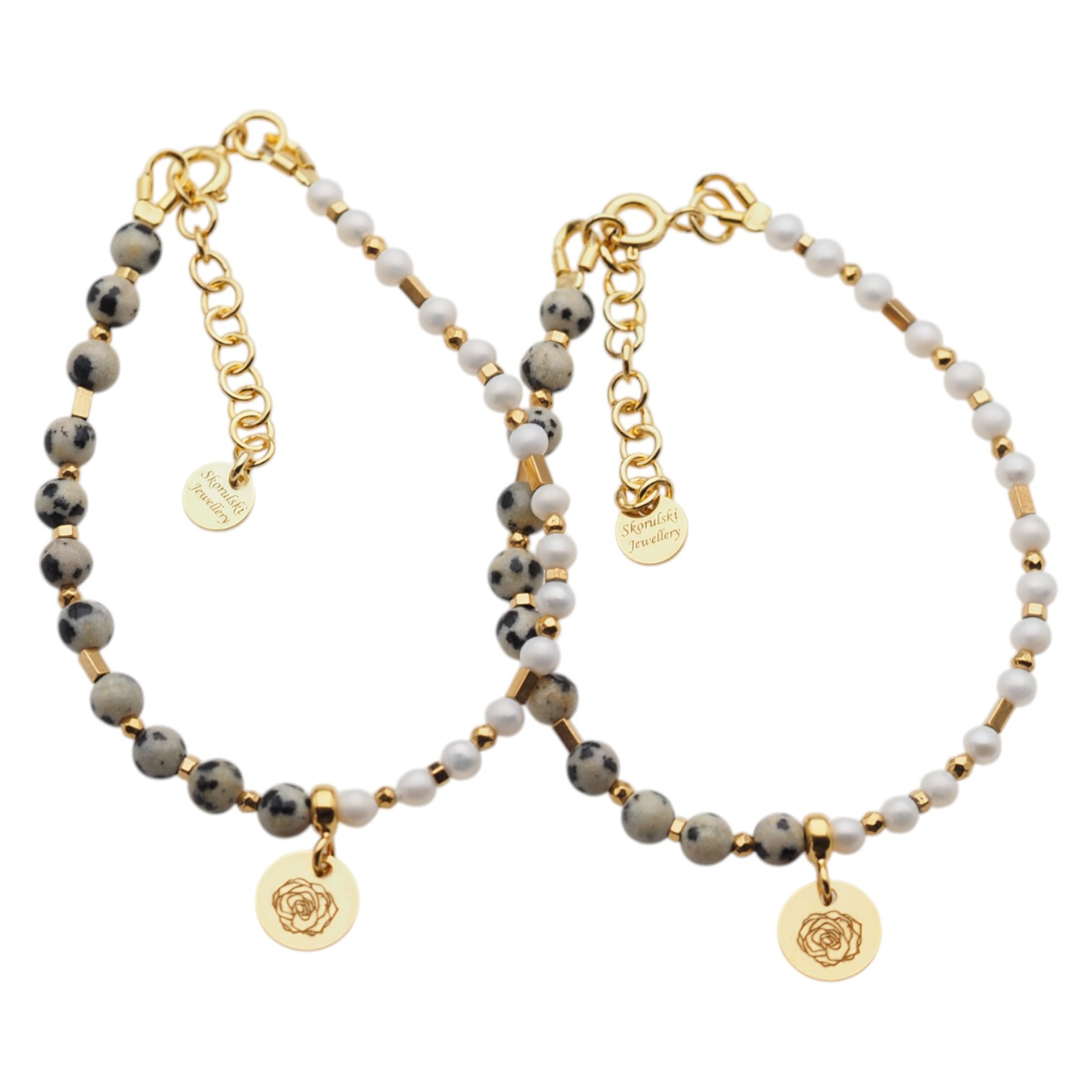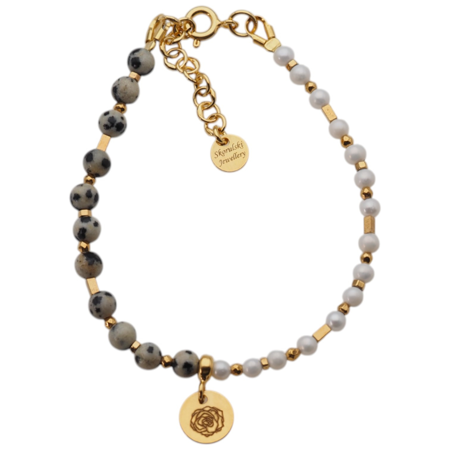 Bransoletka z Perłami i Jaspisem Dalmatyńskim – srebro pozłacane 24k, ręcznie robiona, zawieszka kwiat