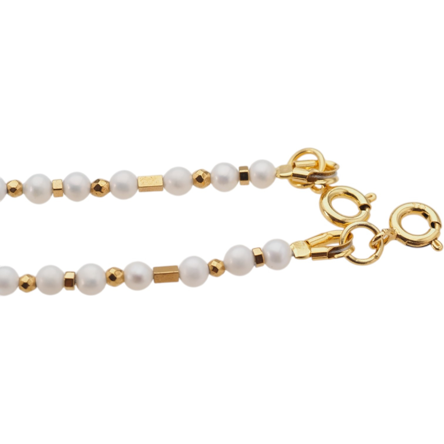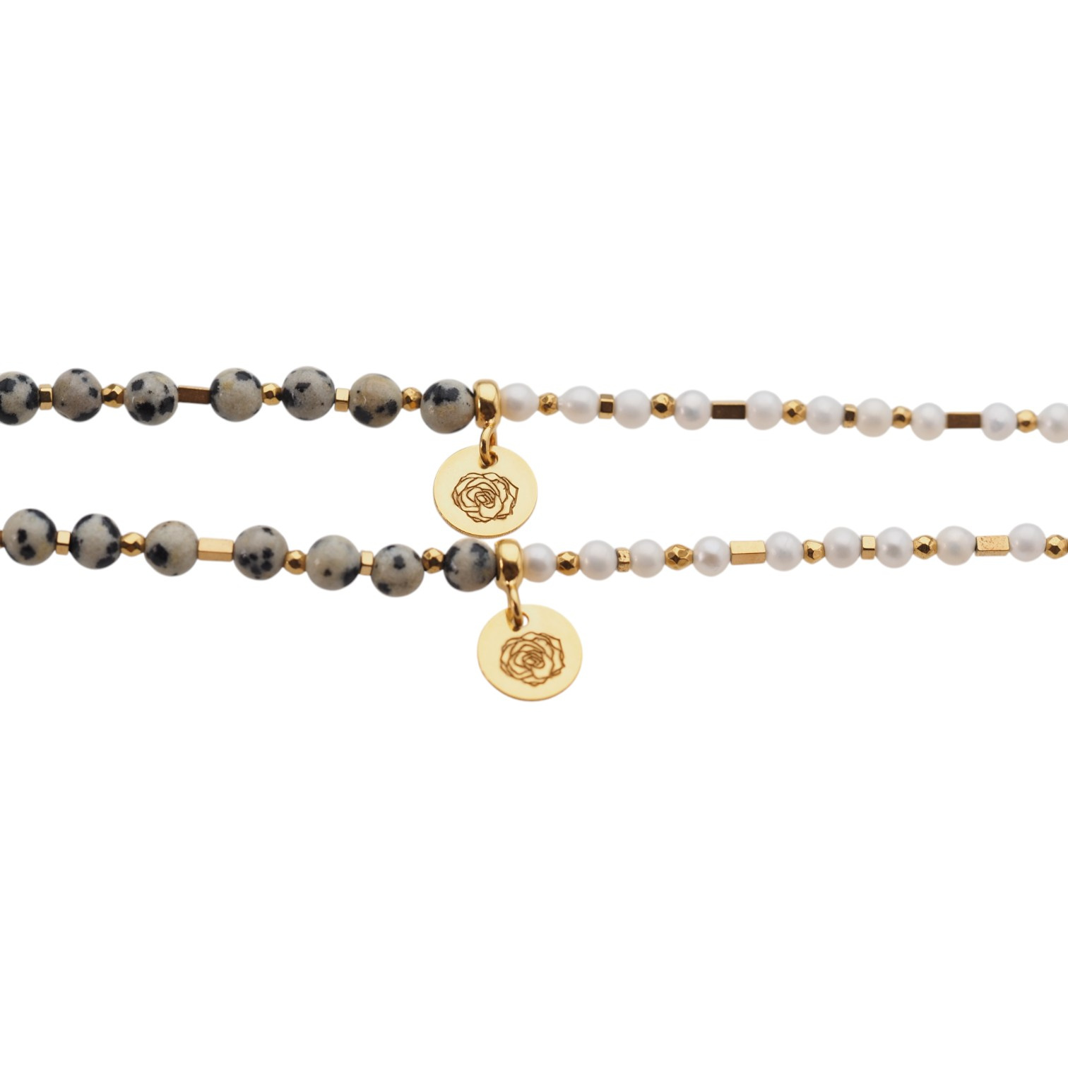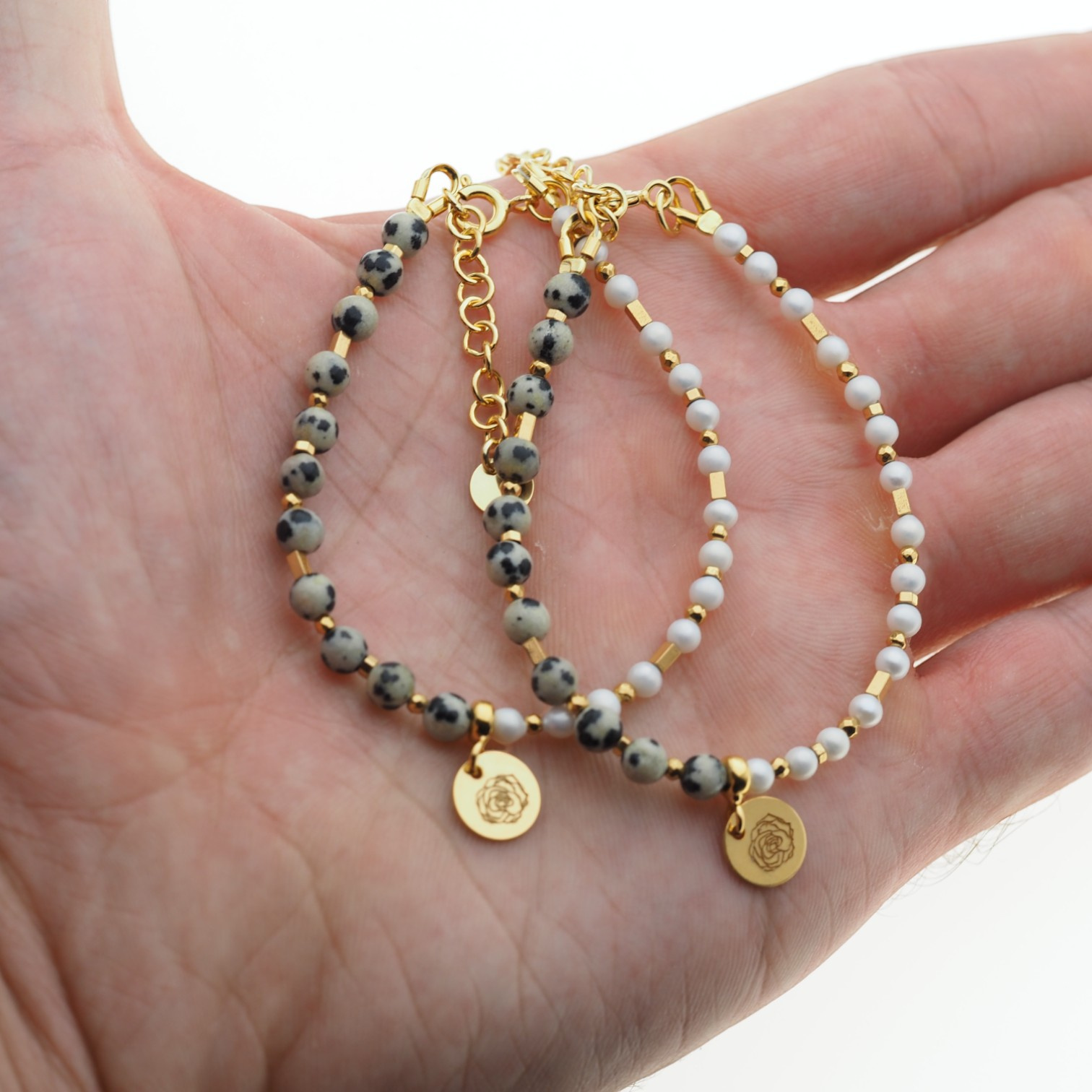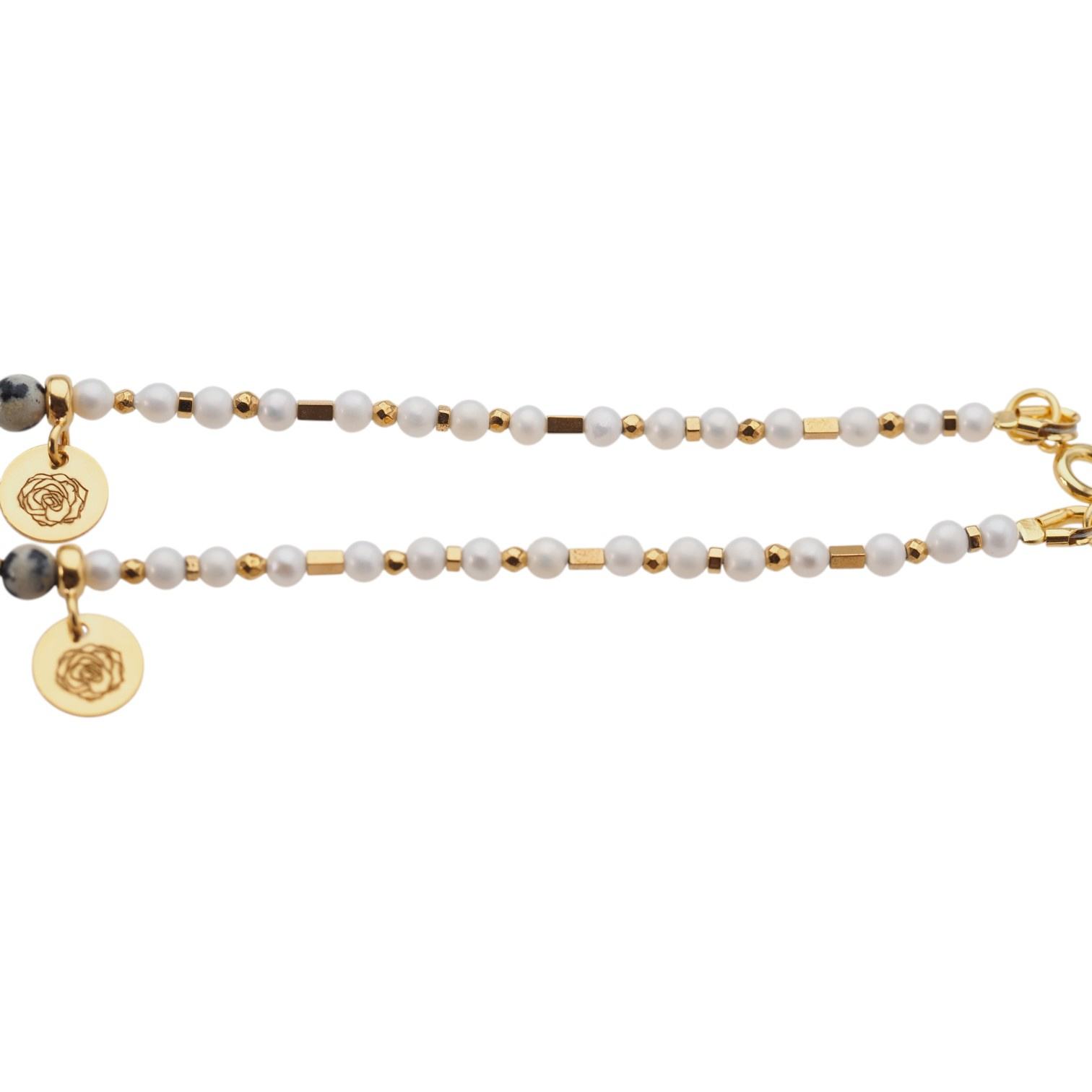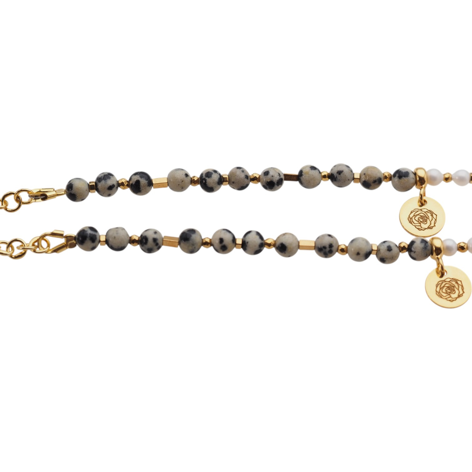 Delikatna, ręcznie wykonana bransoletka z naturalnych, hodowanych Pereł słodkowodnych i Jaspisu Dalmatyńskiego. Zestawienie klasycznej bieli pereł z charakterystyczną, nakrapianą strukturą jaspisu tworzy elegancką i zarazem oryginalną kompozycję. Bransoletka została wykończona elementami ze srebra próby 925, pokrytego 24-karatowym złotem, co nadaje jej szlachetnego blasku.