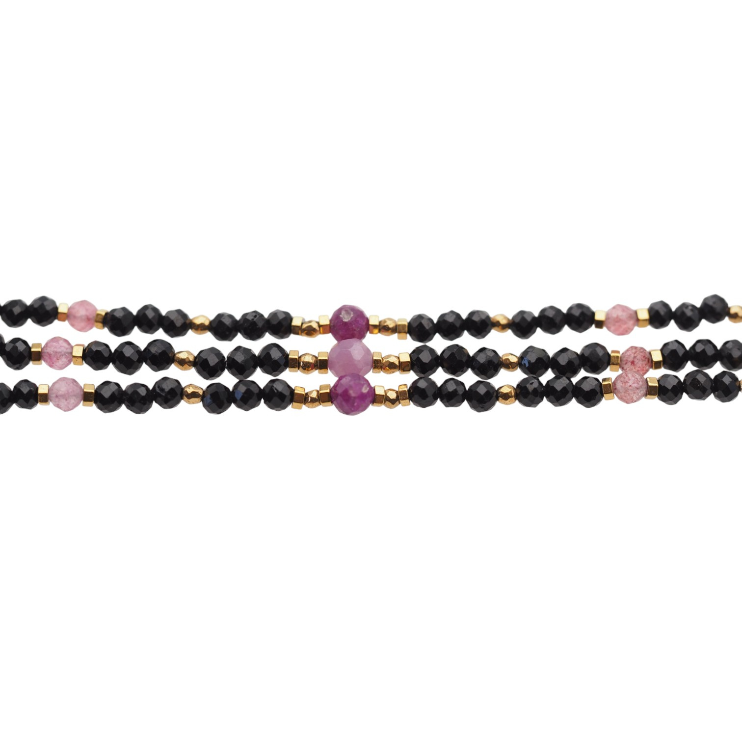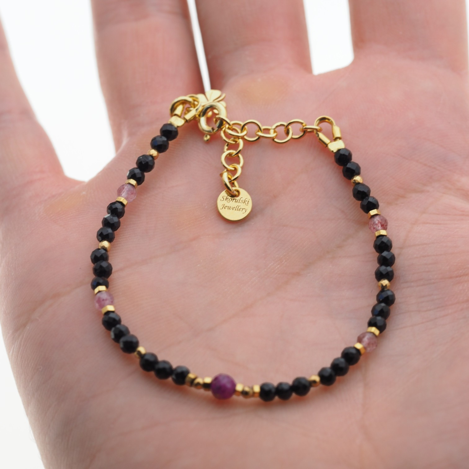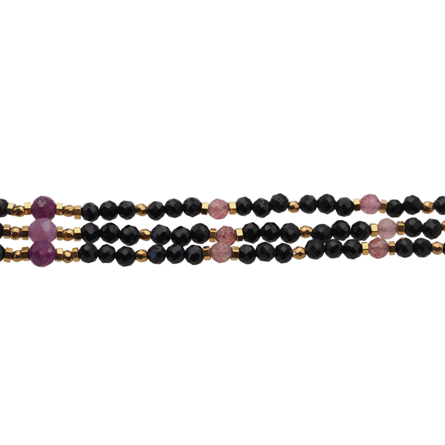 Wyrób składa się z kamieni: Rubin, Kwarc Truskawkowy, Turmalin czarny i złoty Hematyt.
