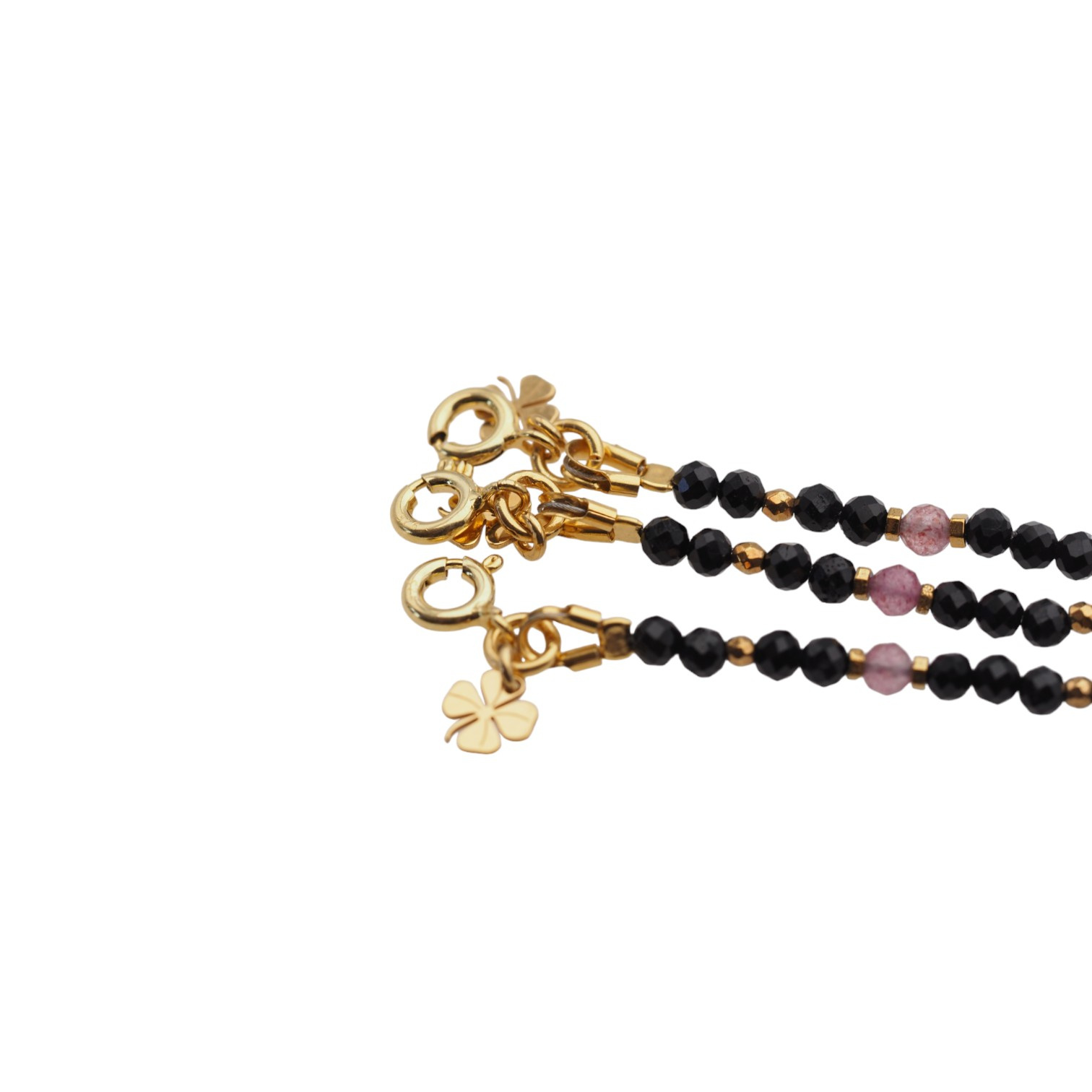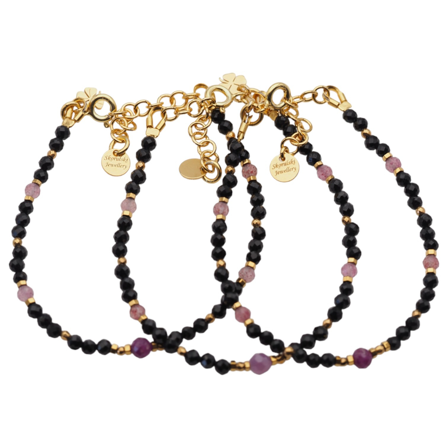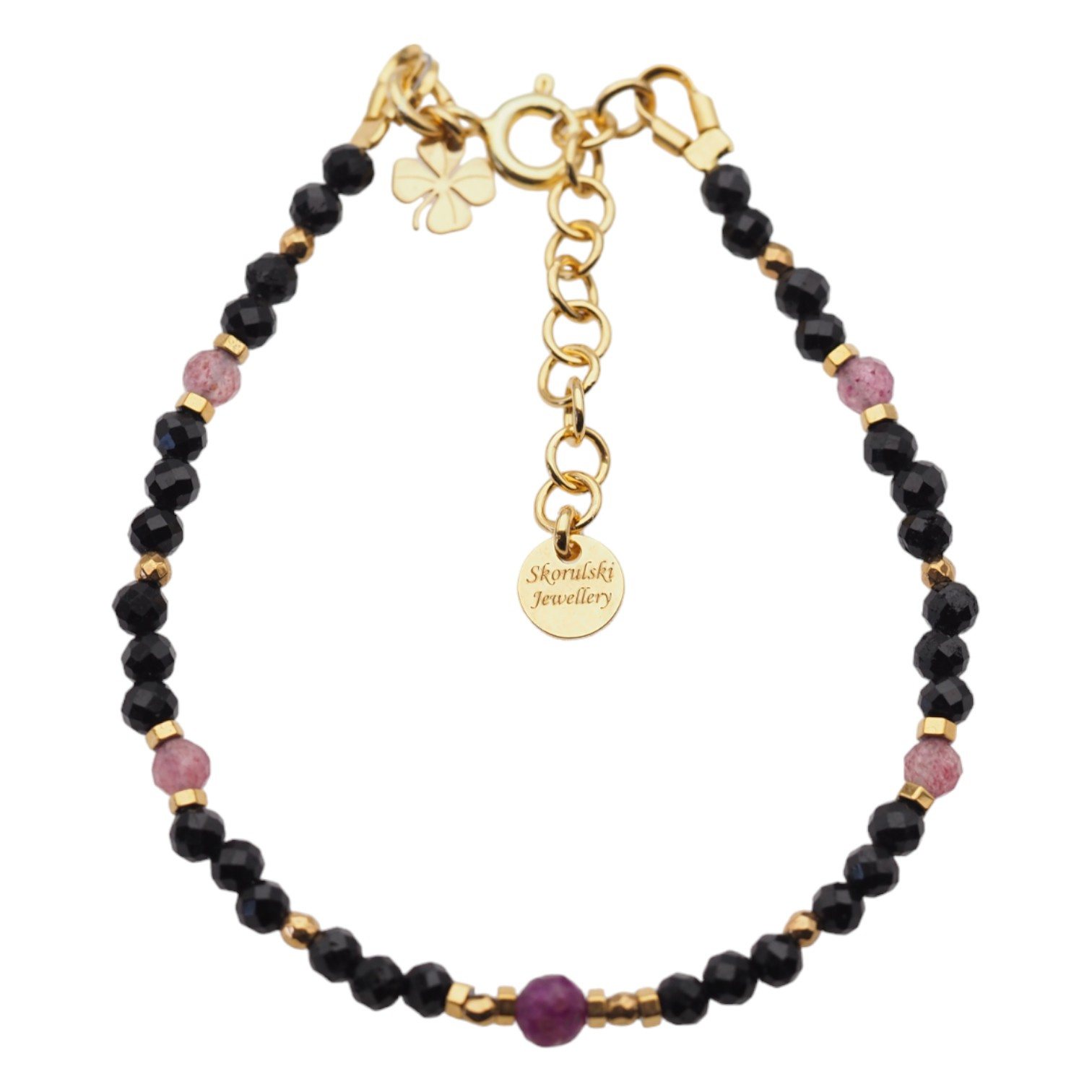 Wyrób składa się z kamieni: Rubin, Kwarc Truskawkowy, Turmalin czarny i złoty Hematyt.