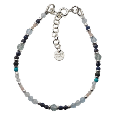 Kompozycja drobnych, starannie dobranych kamieni naturalnych tworzy lekką i harmonijną całość. Bransoletka została wykonana na trwałej lince stalowej i wykończona elementami ze srebra próby 925. Regulowana długość zapewnia wygodę noszenia i idealne dopasowanie do nadgarstka.