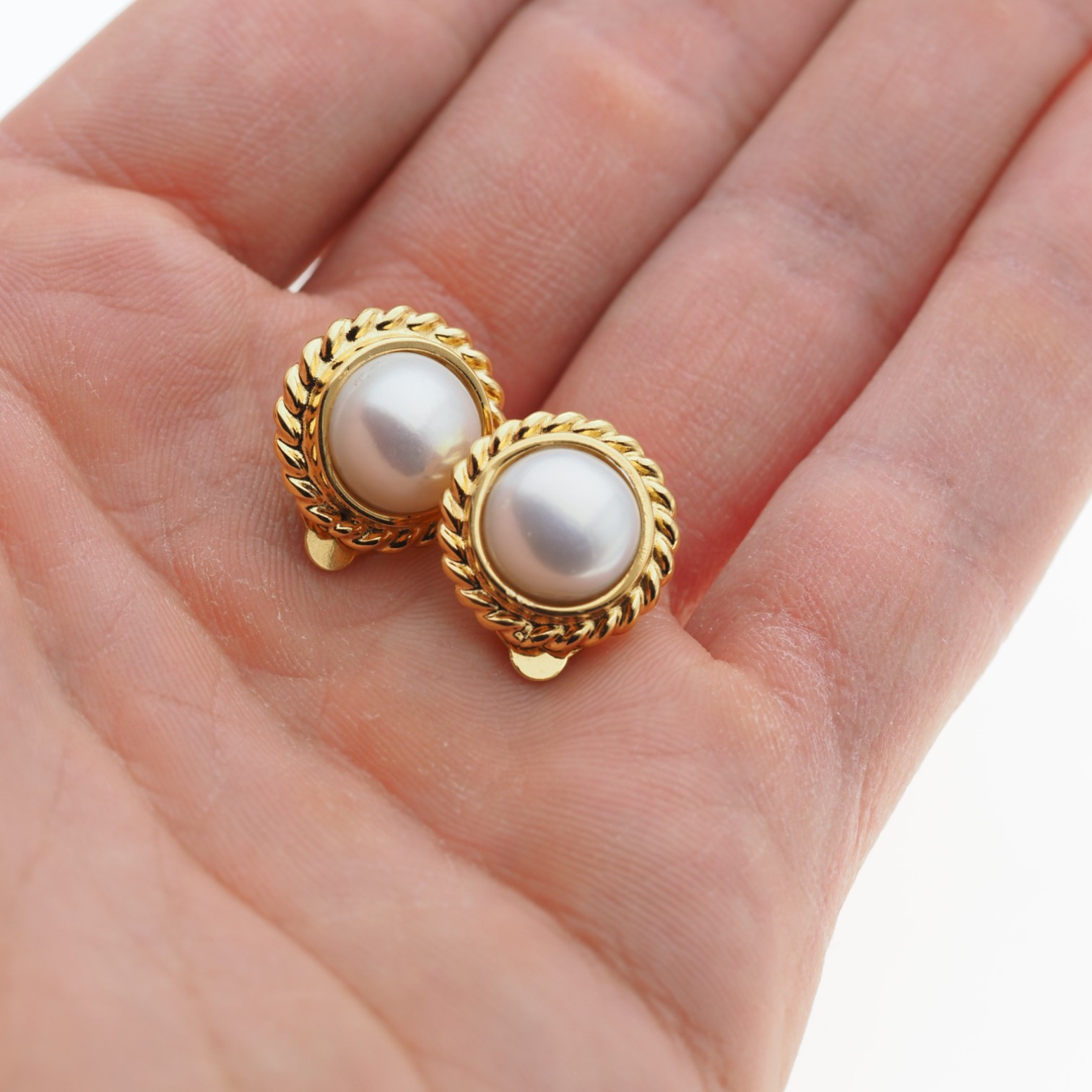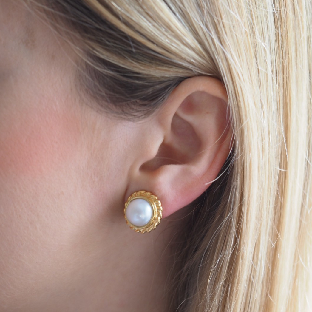 Srebrne, złocone klipsy z białą Perłą hodowaną zostały wykonane ręcznie.