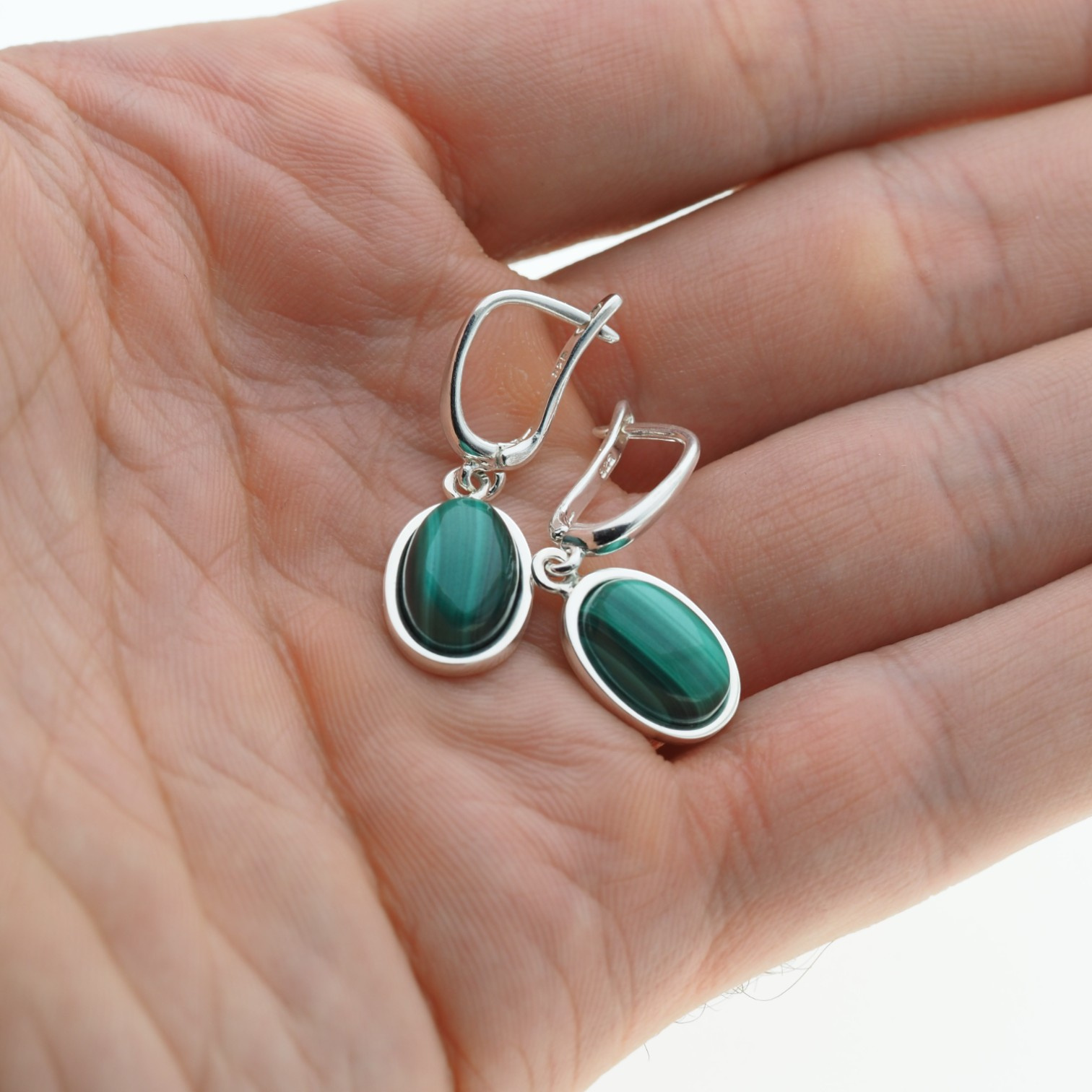 Srebrne kolczyki z naturalnym Malachitem zostały wykonane ręcznie w klasycznej formie. Kamień o owalnym kształcie osadzono w minimalistycznej oprawie, która podkreśla jego naturalne piękno.