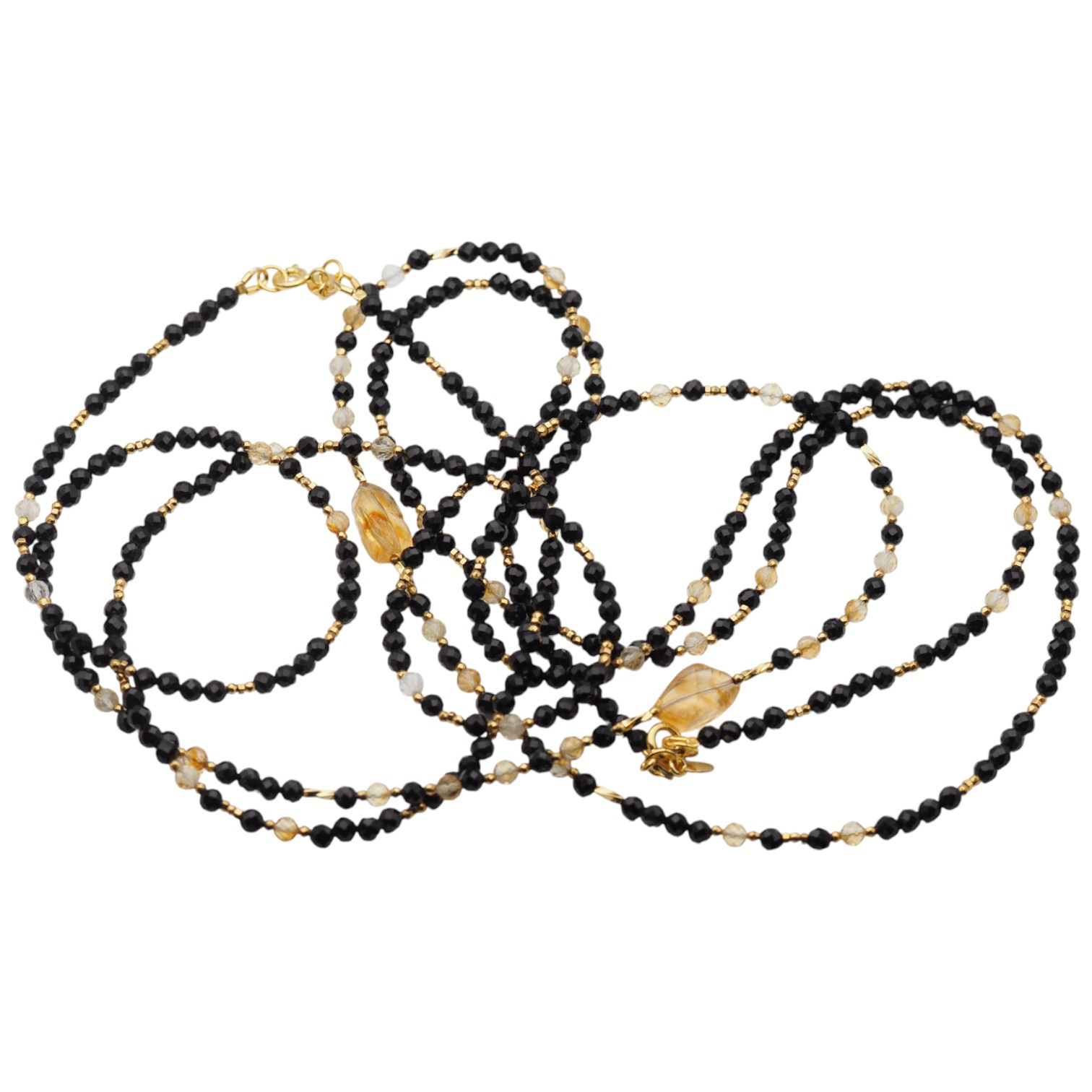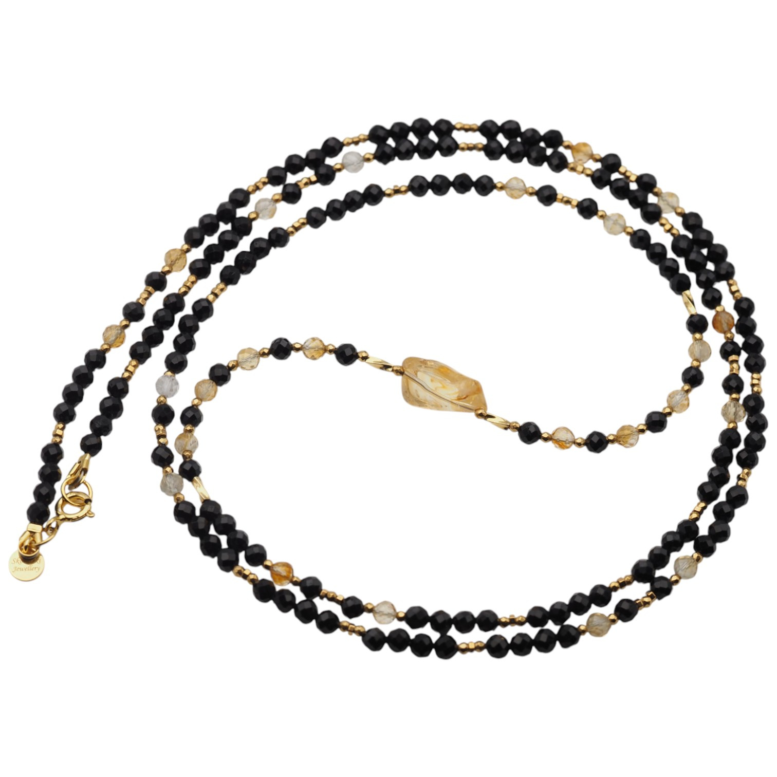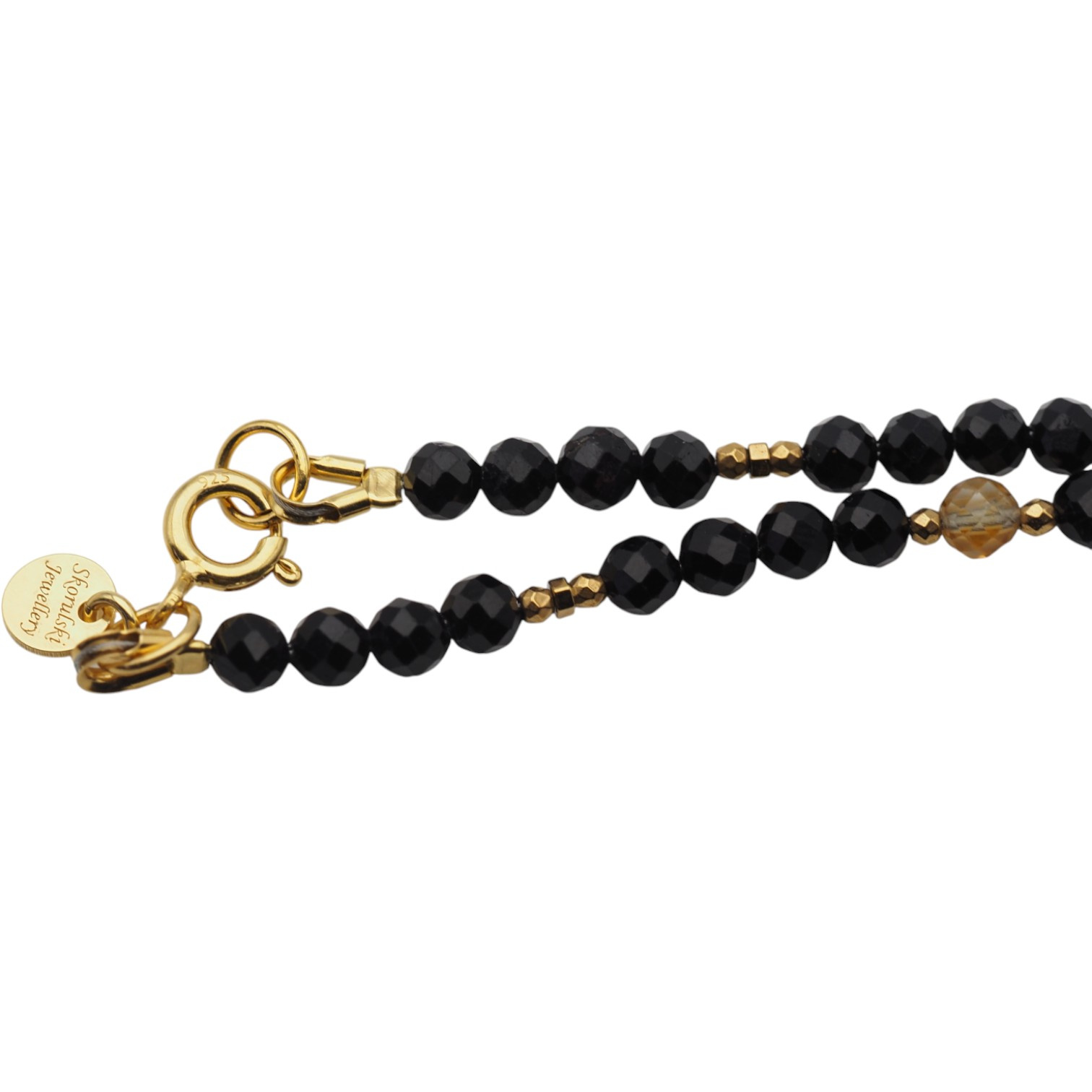 Zestawienie głębokiej czerni, złotych akcentów i miodowych odcieni cytrynu tworzy wyjątkowo elegancką i zrównoważoną kompozycję. To biżuteria, która łączy w sobie estetykę i symbolikę – idealna zarówno do codziennego noszenia, jak i na wyjątkowe okazje.