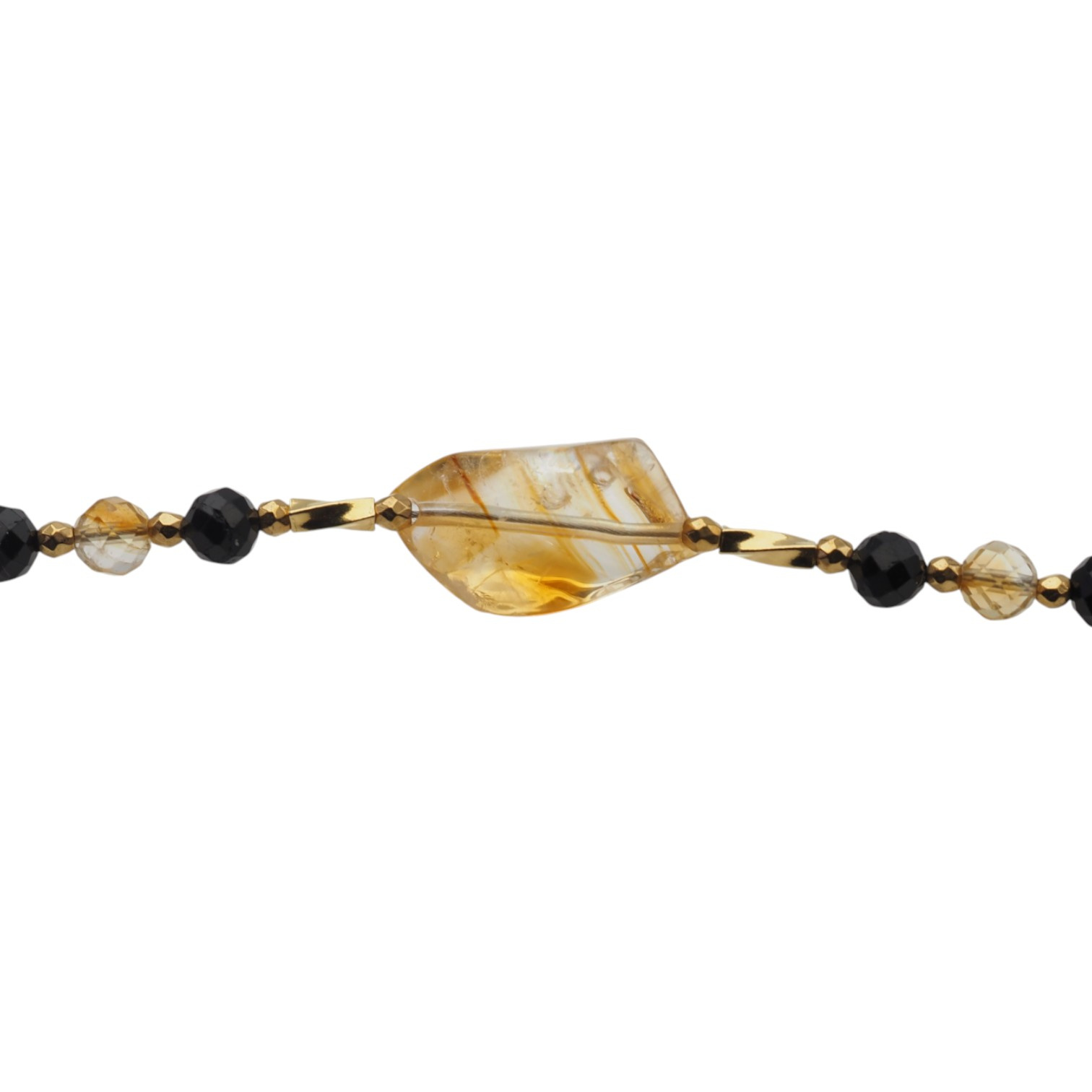 Ręcznie wykonany naszyjnik z naturalnych kamieni: czarnego turmalinu, cytrynu i hematytu. Starannie nawleczony na stalową linkę jubilerską i wykończony elementami ze srebra próby 925 pozłacanymi 24-karatowym złotem.