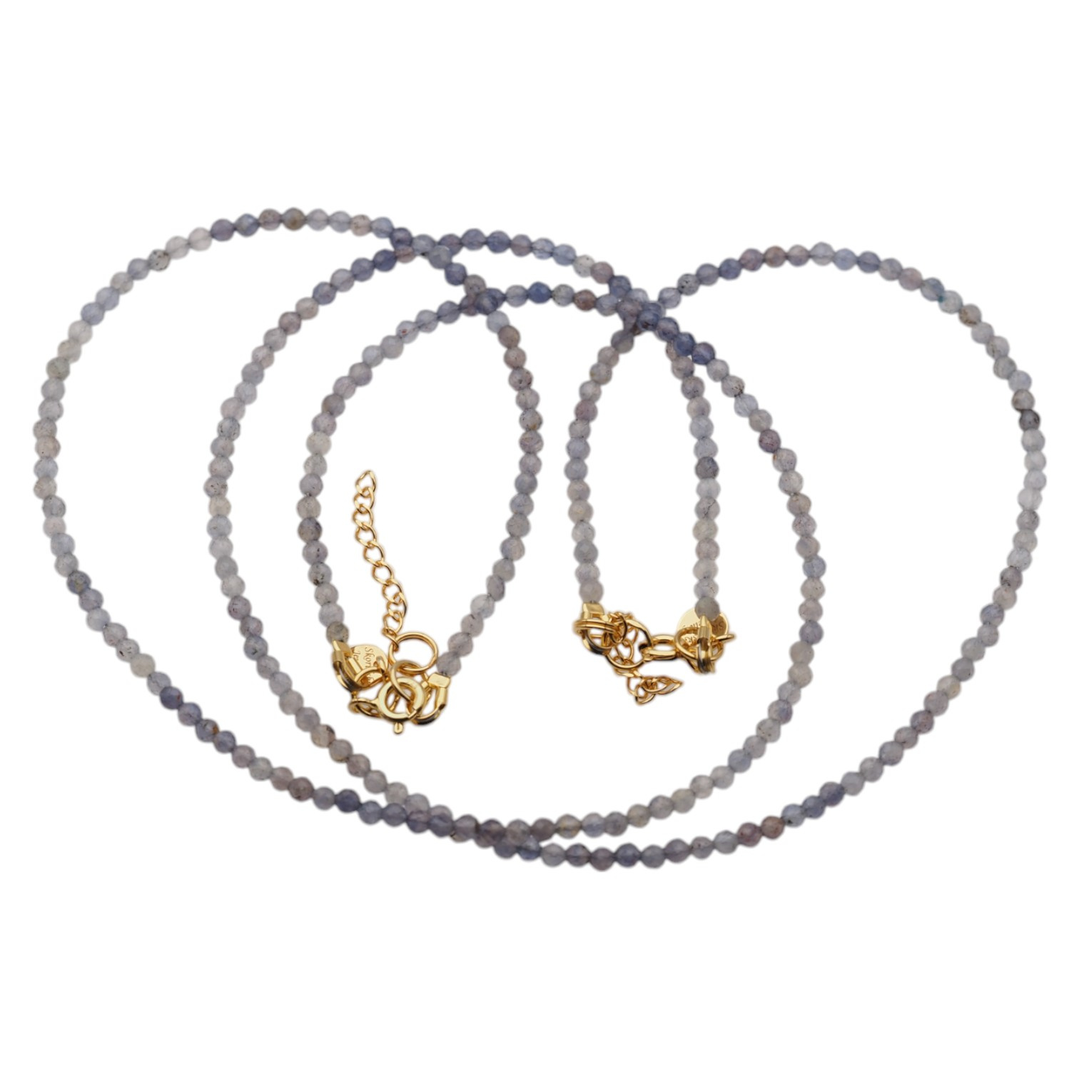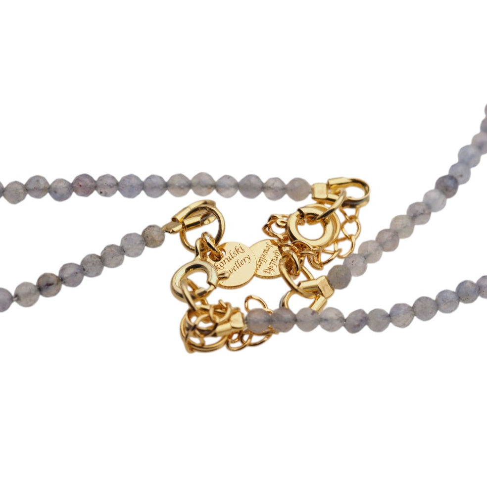Naszyjnik z fasetowanym Iolitem i srebrem złoconym został wykonany ręcznie na lince stalowej.