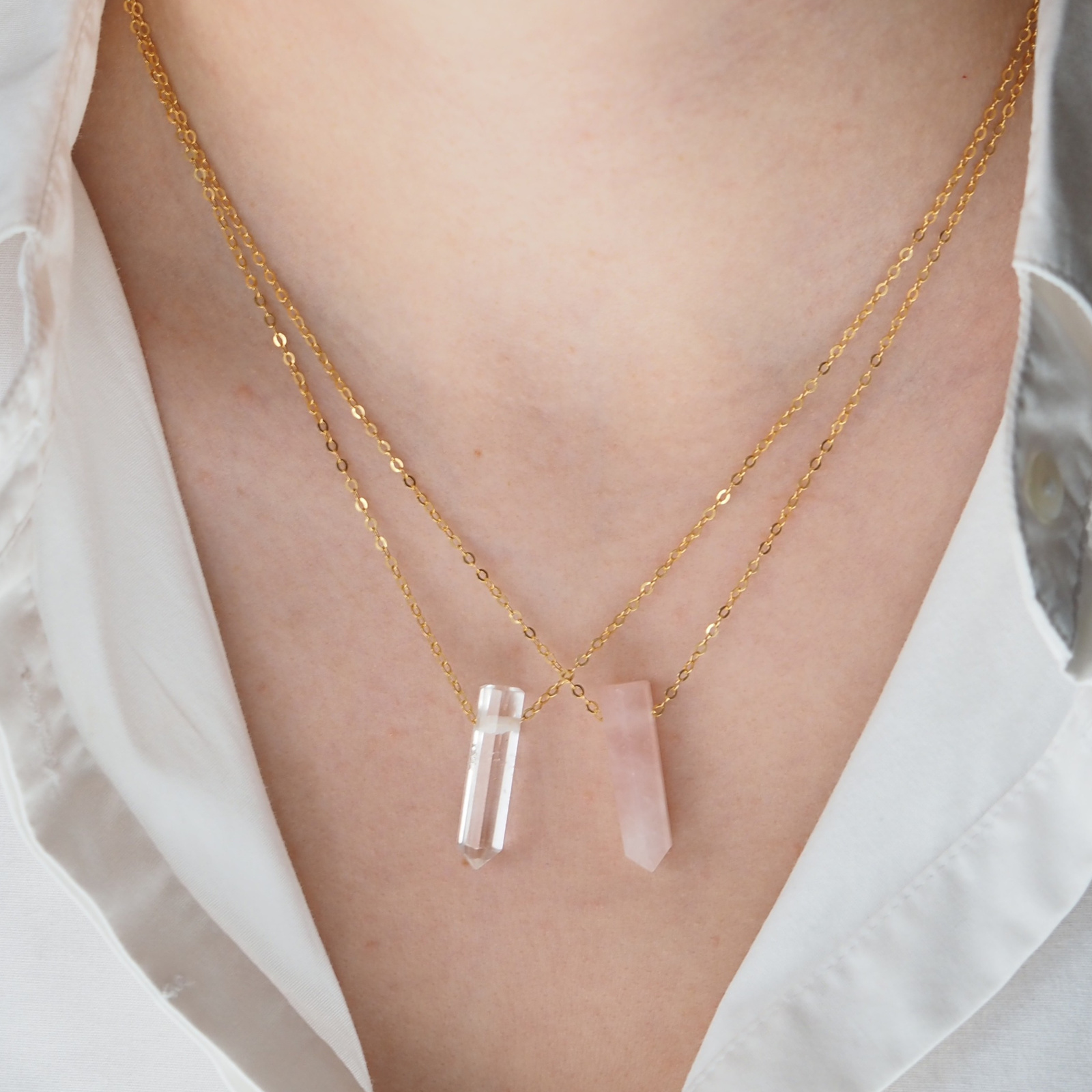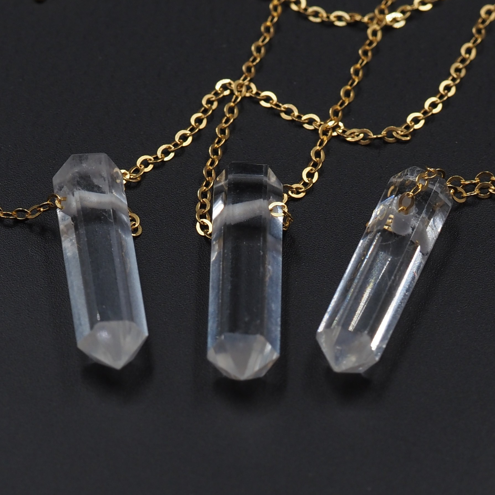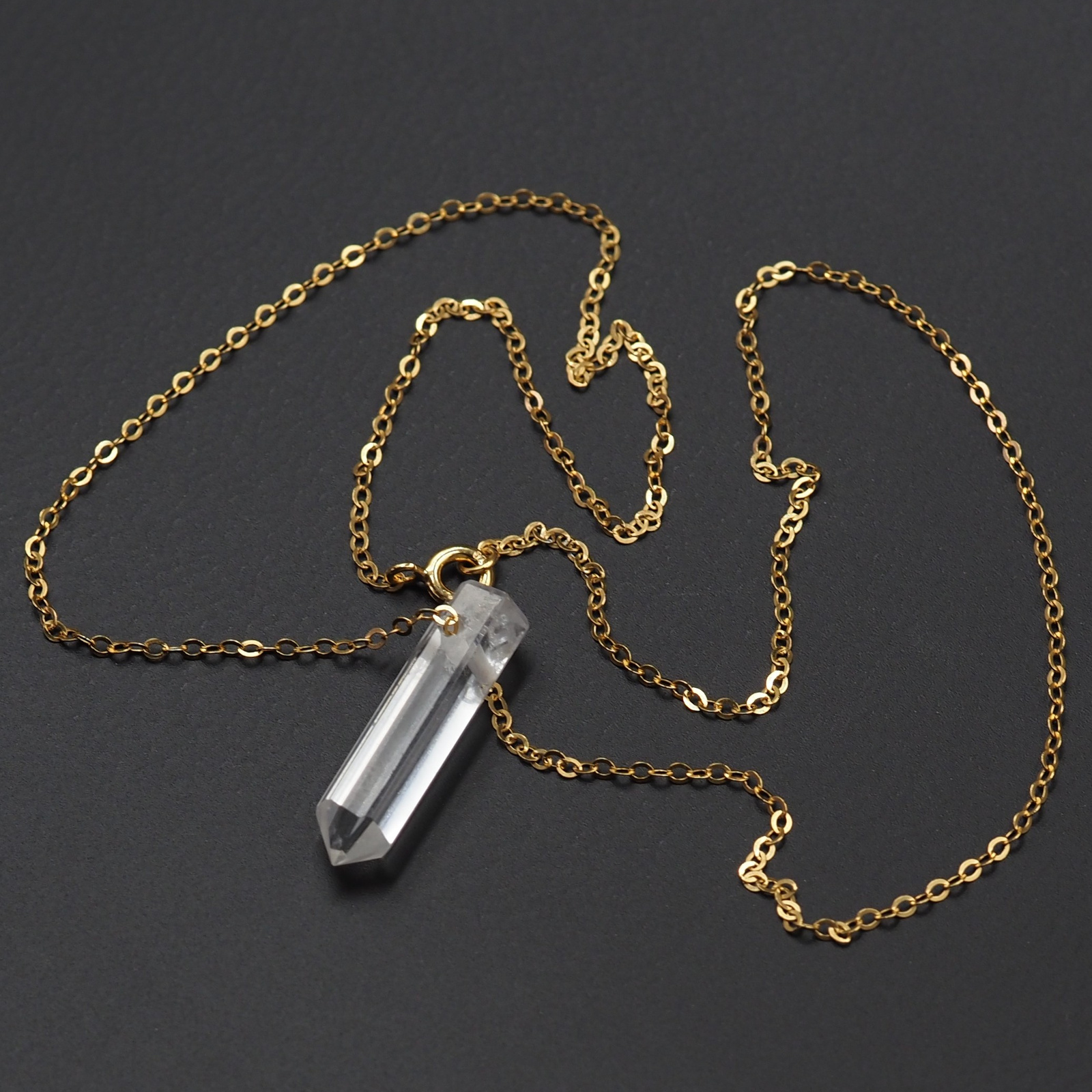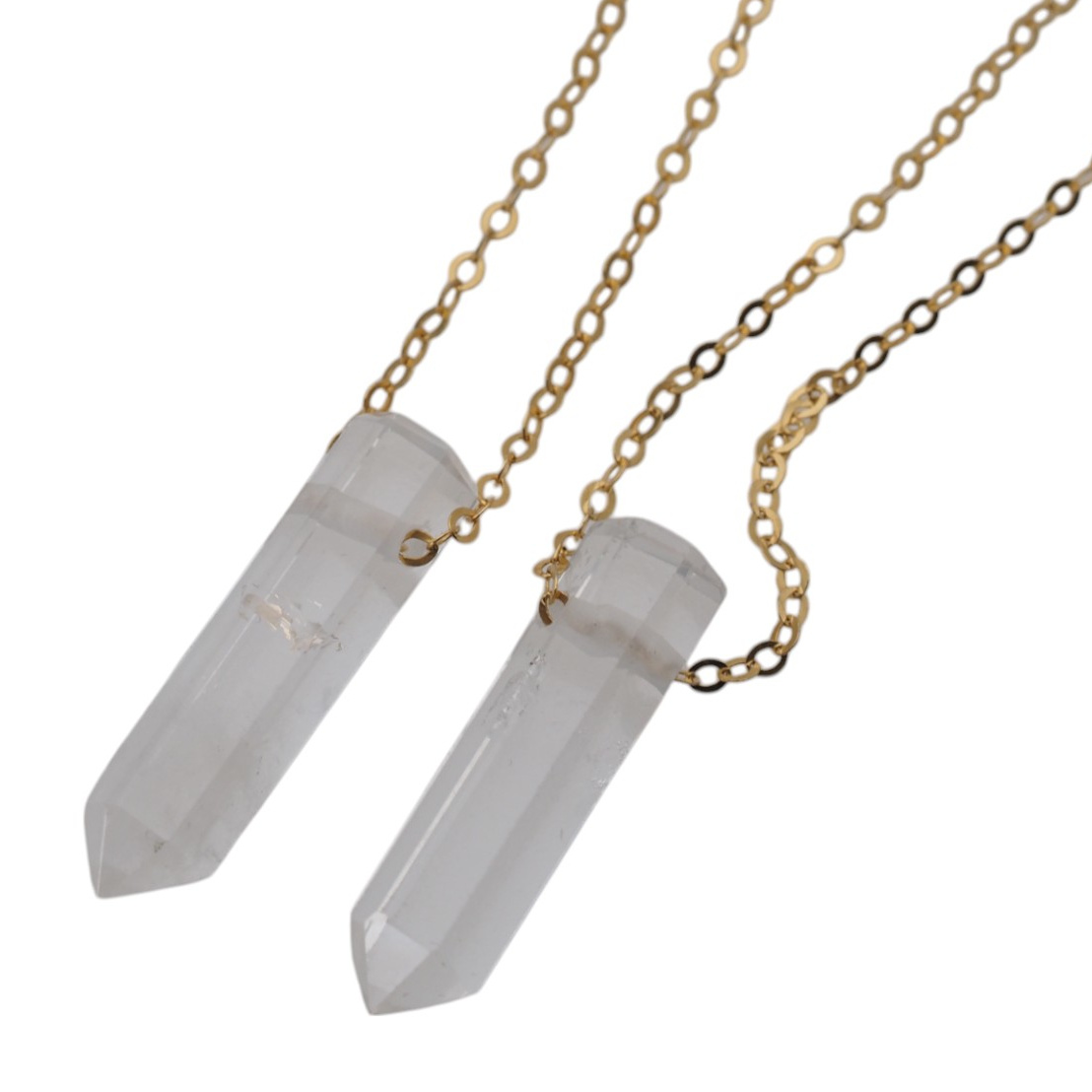 - Naszyjnik z naturalnym Kryształem Górskim - mały kryształ (sopel) zawieszony na srebrnym, złoconym łańcuszku pokrytym polimerem. Długość łańcuszka to 45 cm.