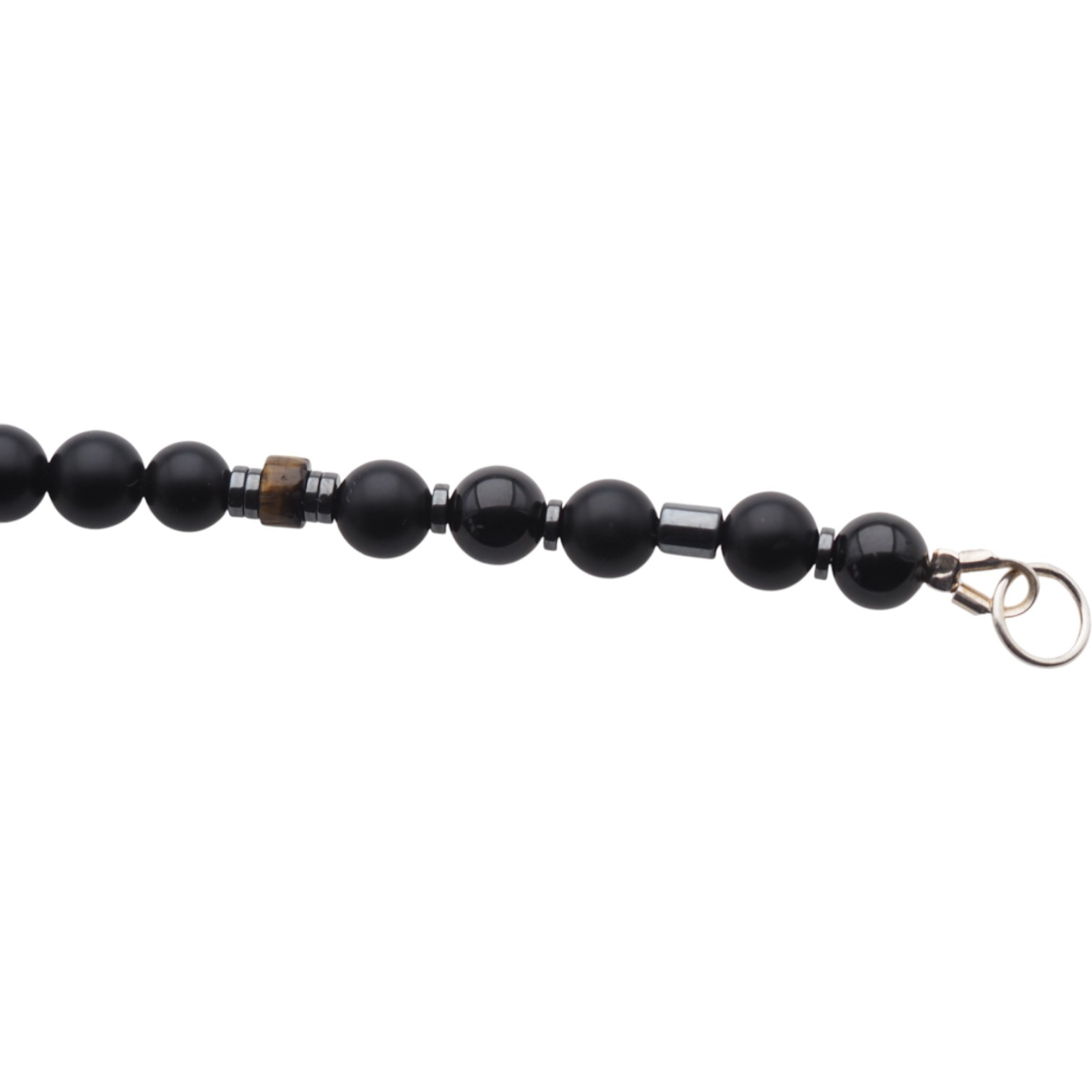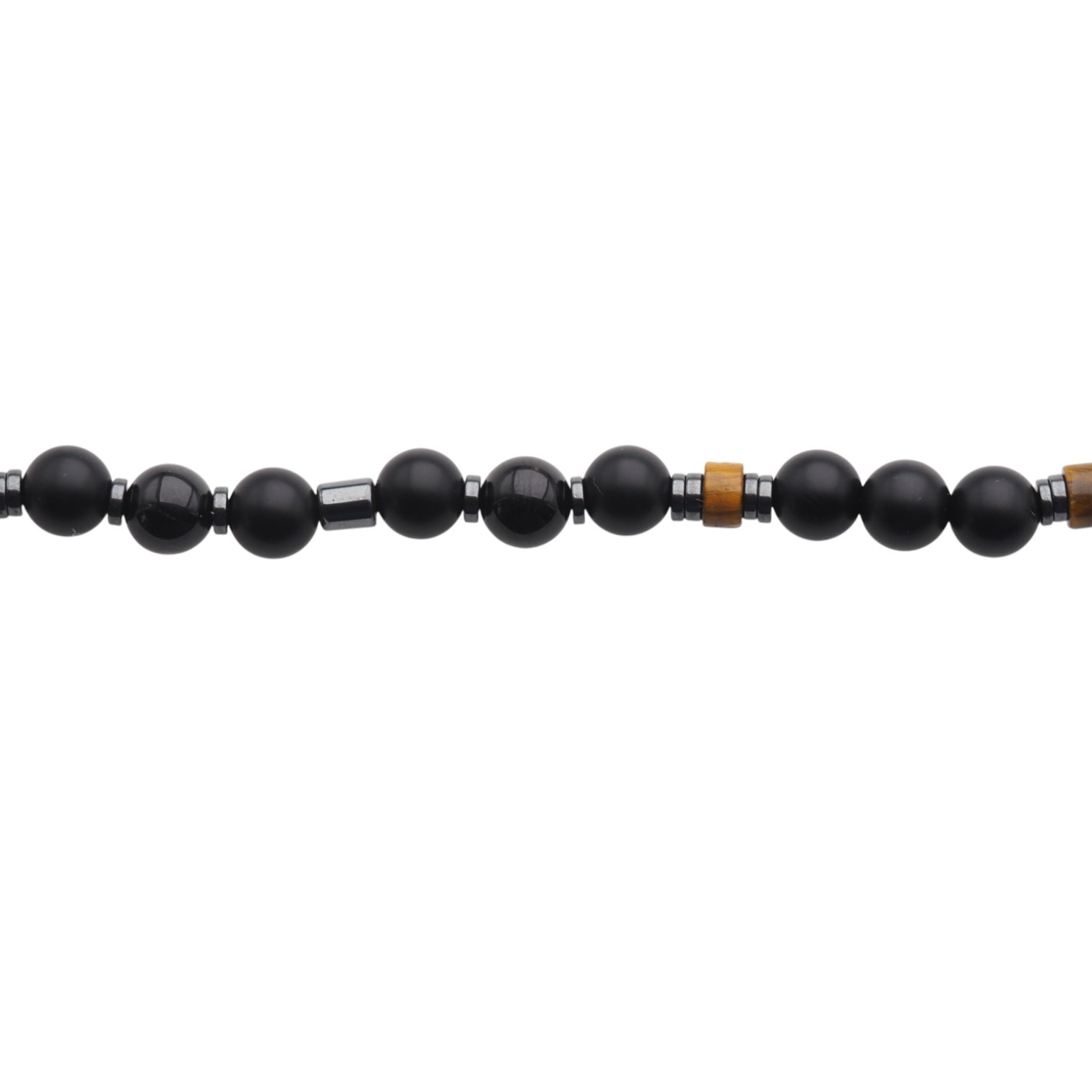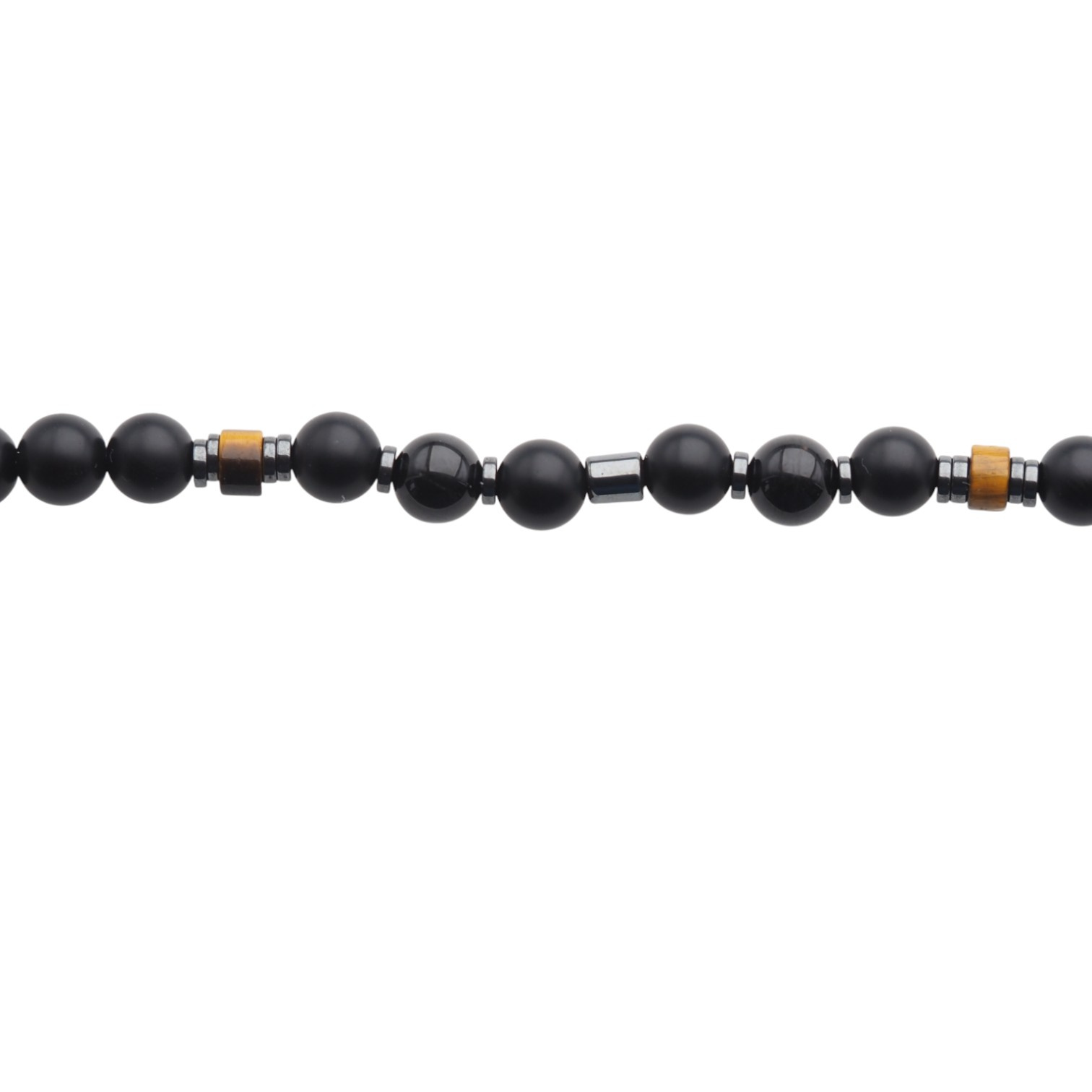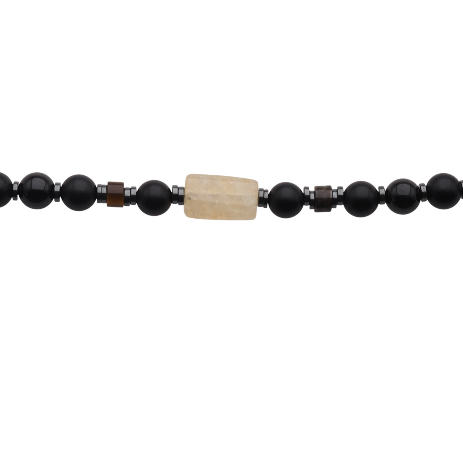 Elegancki, ręcznie wykonany naszyjnik z naturalnych kamieni półszlachetnych, łączący głęboką czerń Onyksu i Turmalinu z ciepłymi refleksami Tygrysiego Oka oraz złocistym blaskiem Cytrynu i metalicznym połyskiem Hematytu.