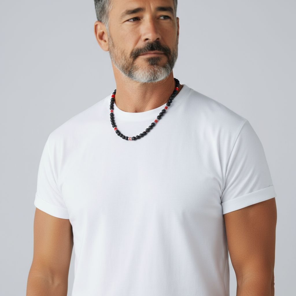 Naszyjnik męski z Lawy Wulkanicznej, czerwonego Jaspisu i Hematytu – ręcznie wykonany, srebro 925