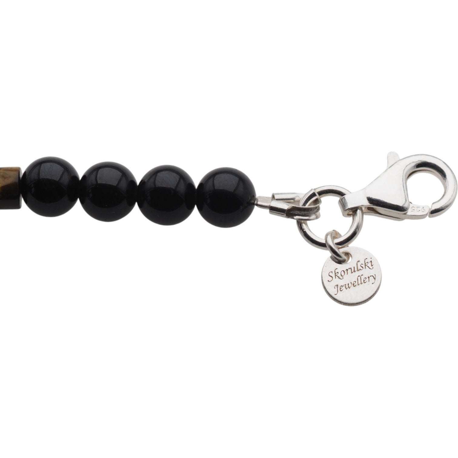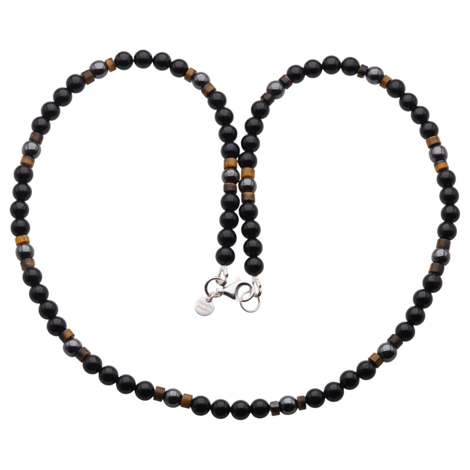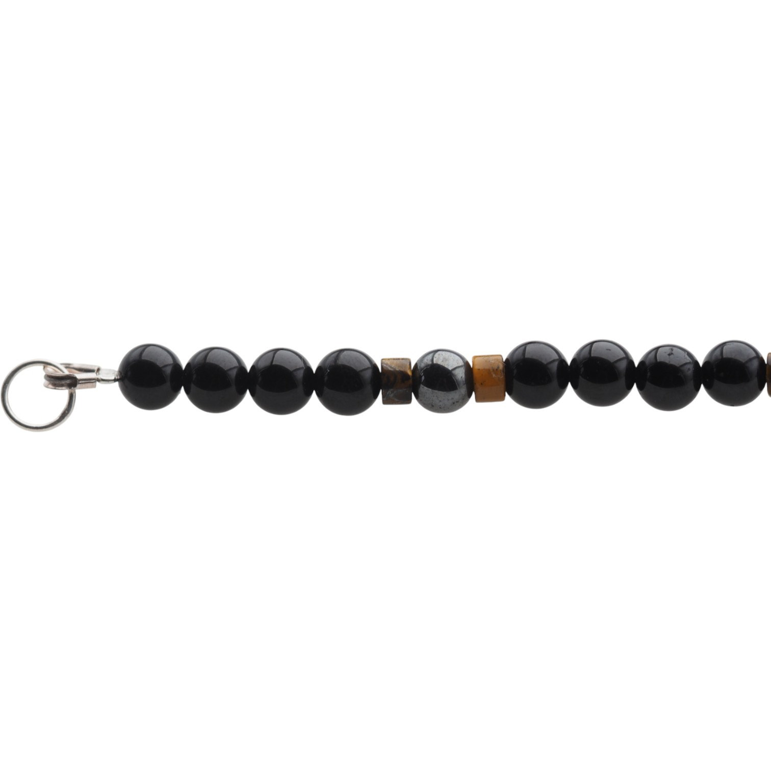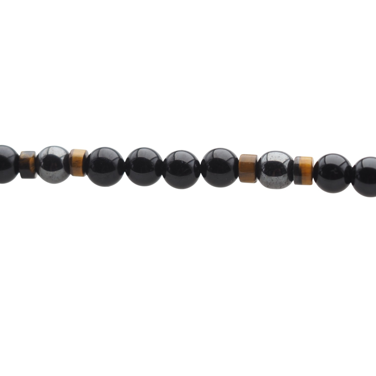 Elegancki naszyjnik męski wykonany ręcznie z naturalnych kamieni półszlachetnych – czarnego Turmalinu, złocistego Tygrysiego Oka i metalicznego Hematytu.
