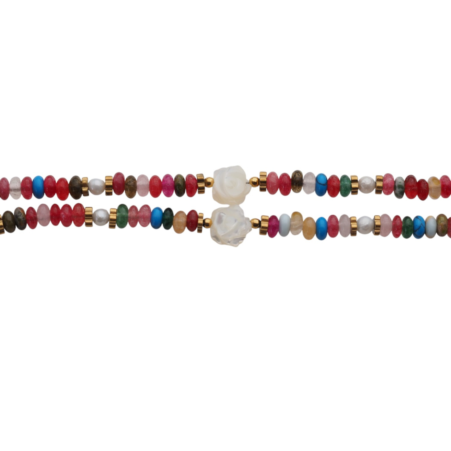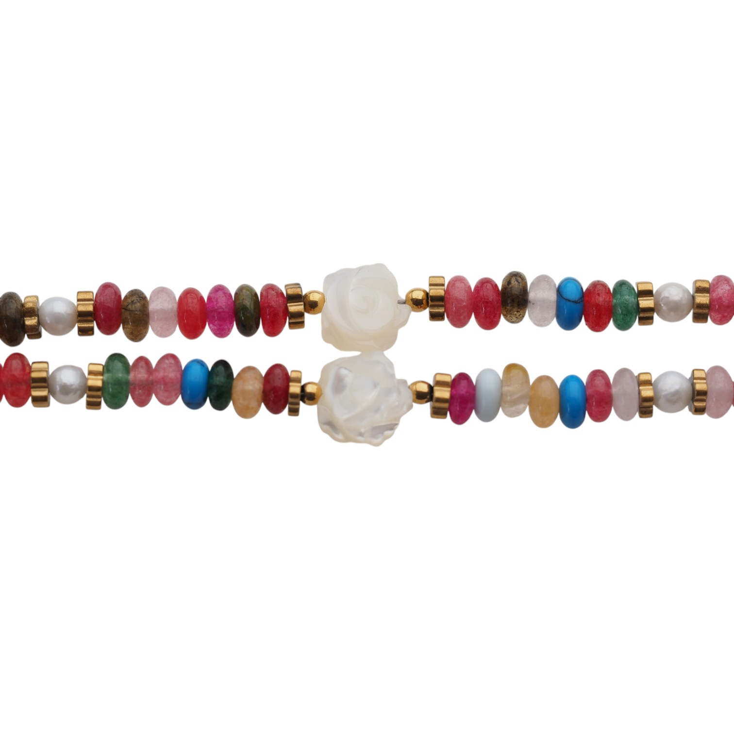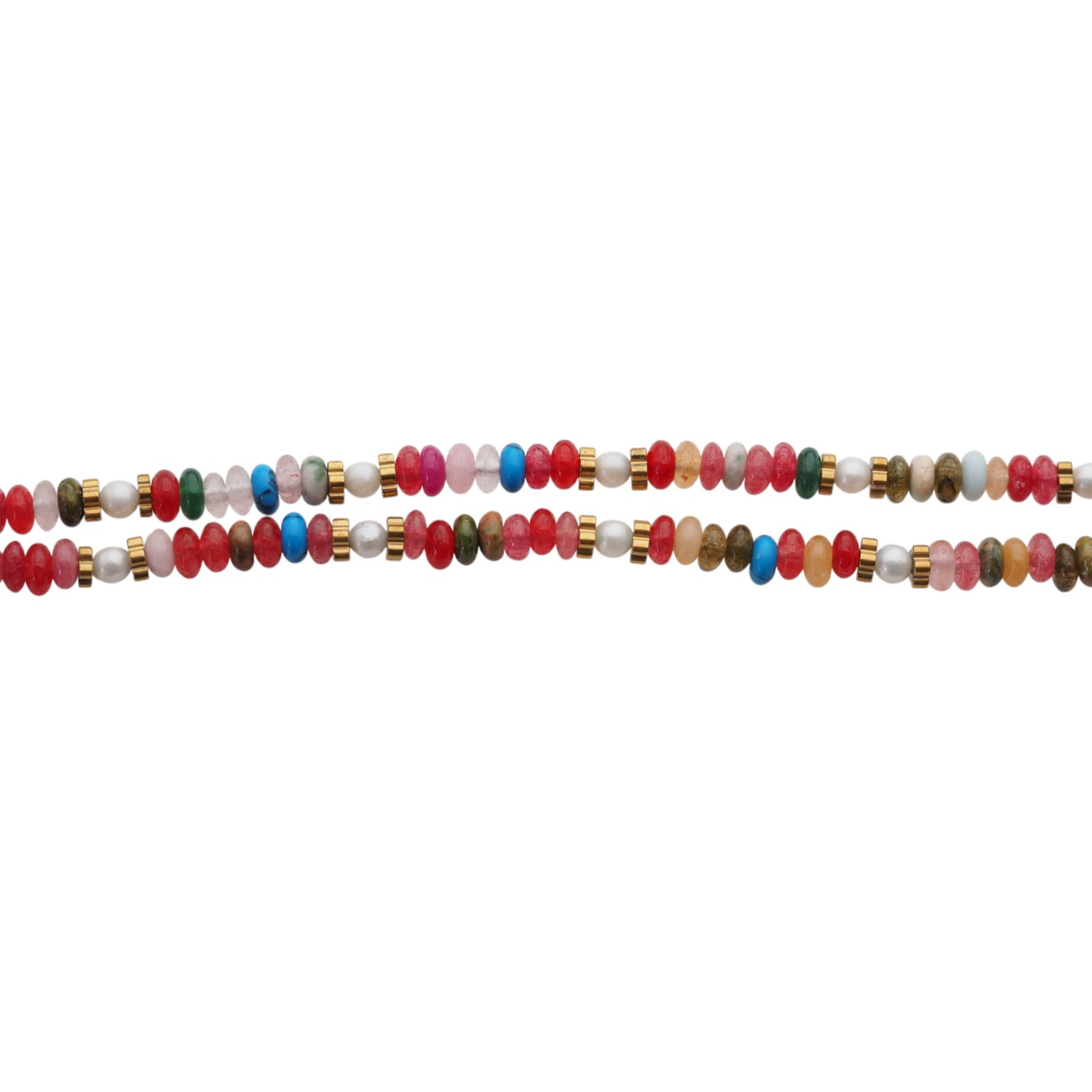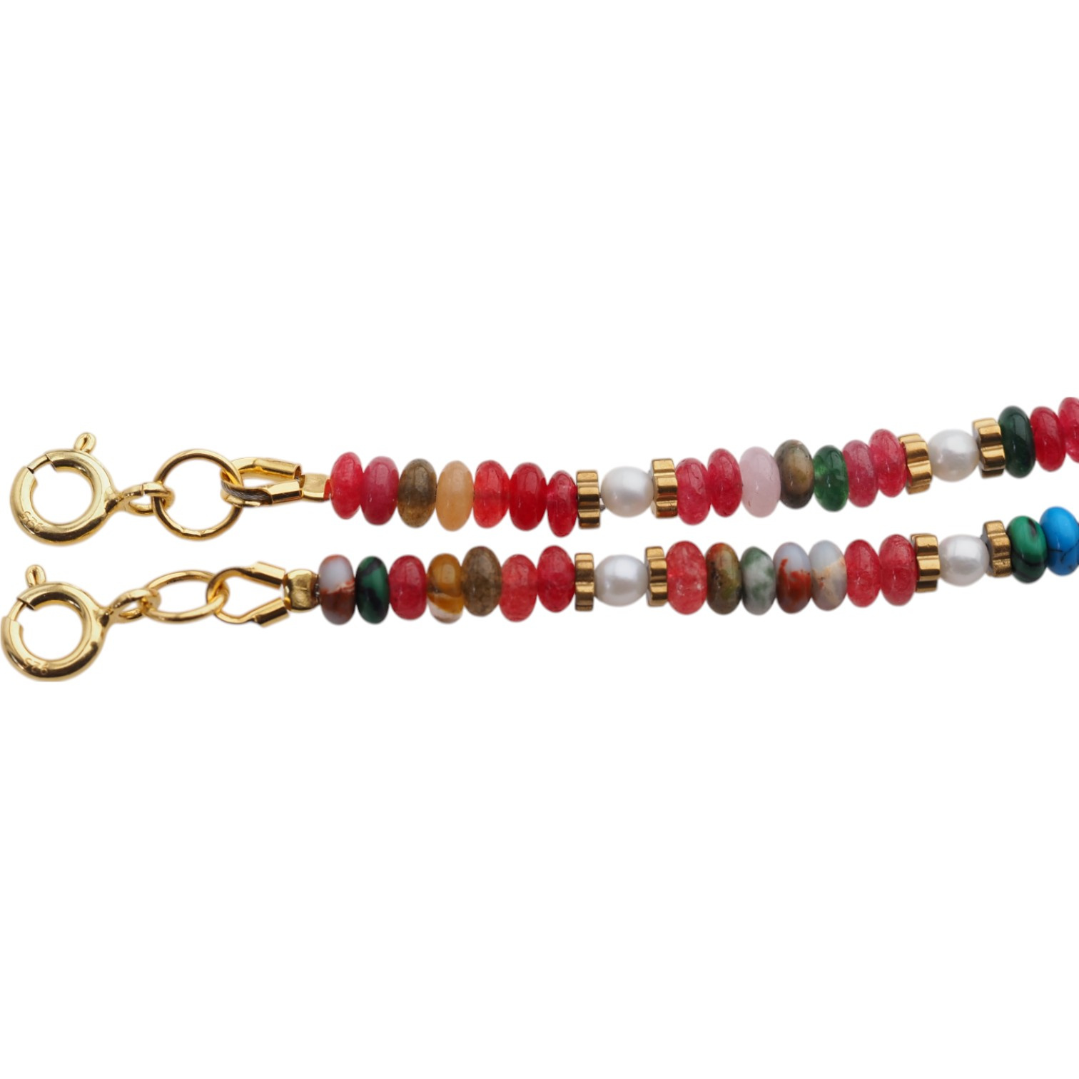 Wyjątkowy naszyjnik wykonany ręcznie z różnorodnych, naturalnych kamieni: malachitu, białej muszli, perły hodowanej, jaspisu, howlitu, złotego hematytu i innych. Kamienie w różnych kształtach – róża, walce – tworzą energetyczną, ale spójną kompozycję. Całość została osadzona na stalowej lince i uzupełniona elementami ze srebra próby 925 pozłacanego 24-karatowym złotem. Naszyjnik doskonale sprawdzi się zarówno na co dzień, jak i jako elegancki akcent do wyjątkowych stylizacji.