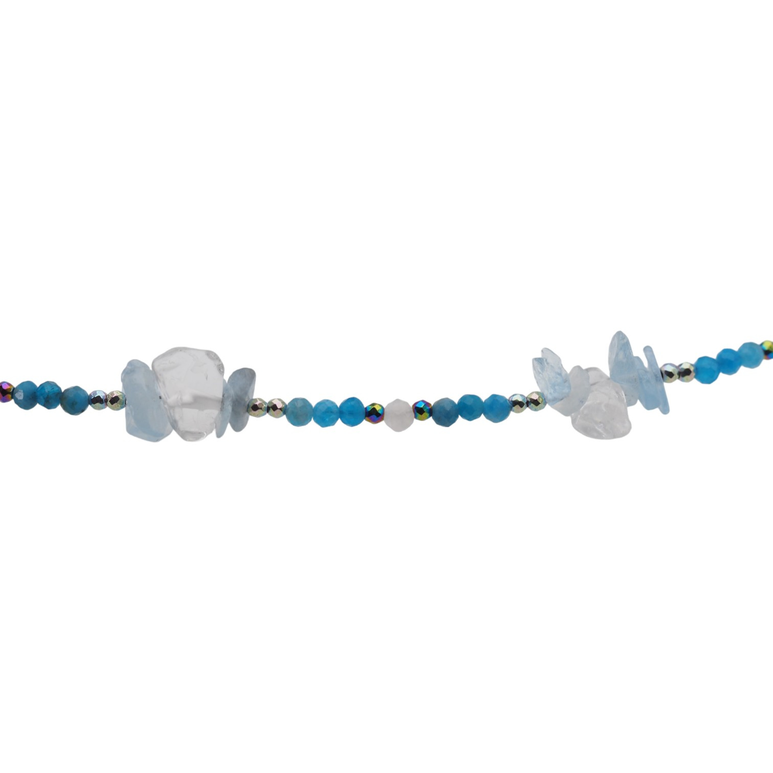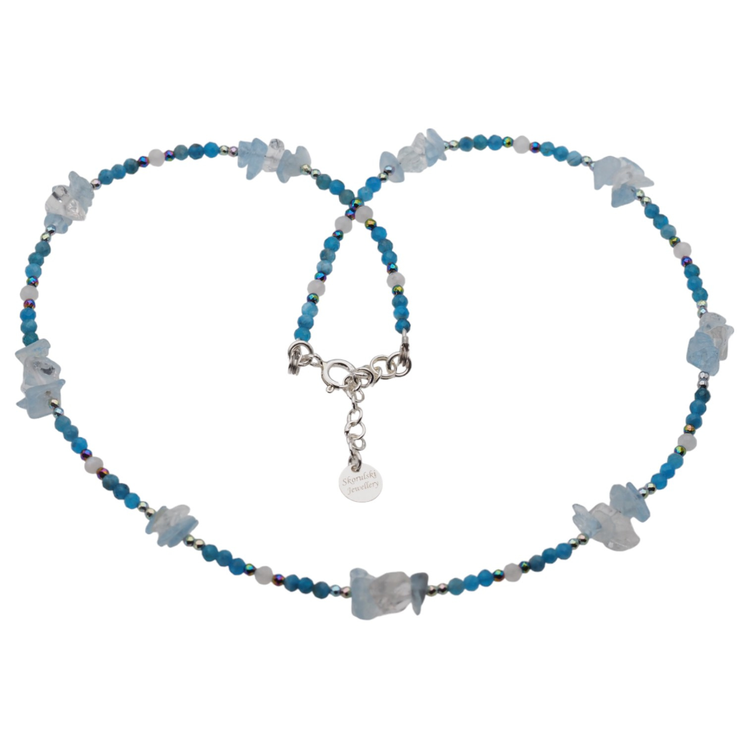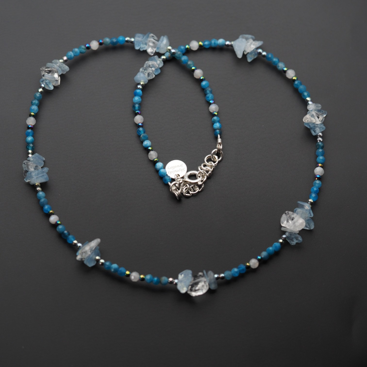 Naszyjnik z Apatytem, Hematytem kolorowym, Akwamarynem, Kryształem Górskim i srebrem został wykonany ręcznie na lince stalowej.