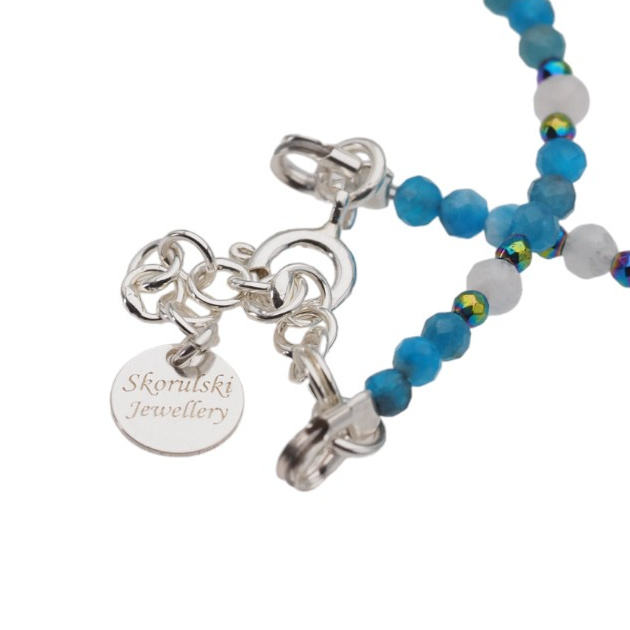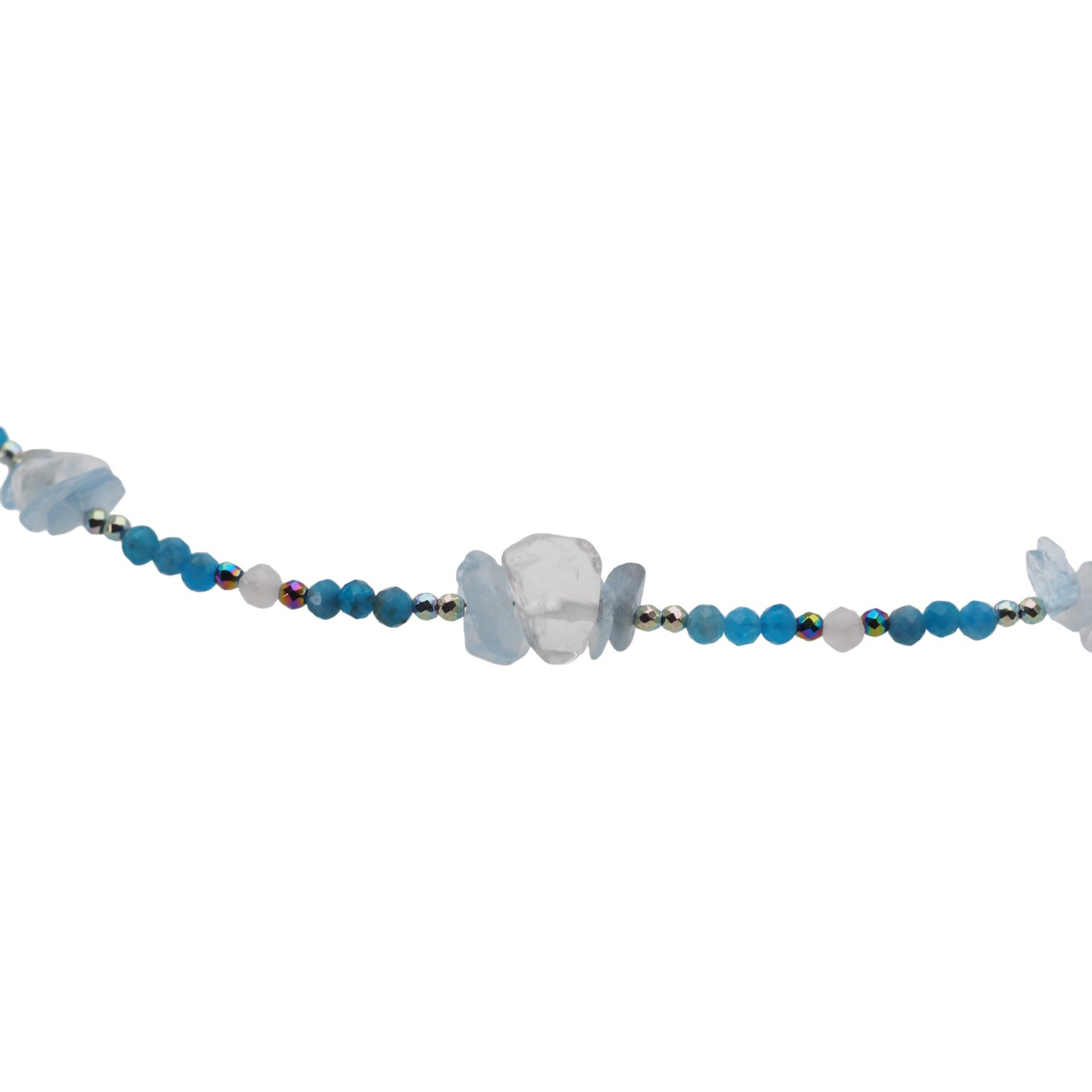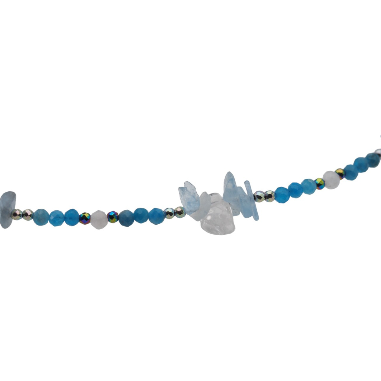 Naszyjnik z Apatytem, Hematytem kolorowym, Akwamarynem, Kryształem Górskim i srebrem został wykonany ręcznie na lince stalowej.