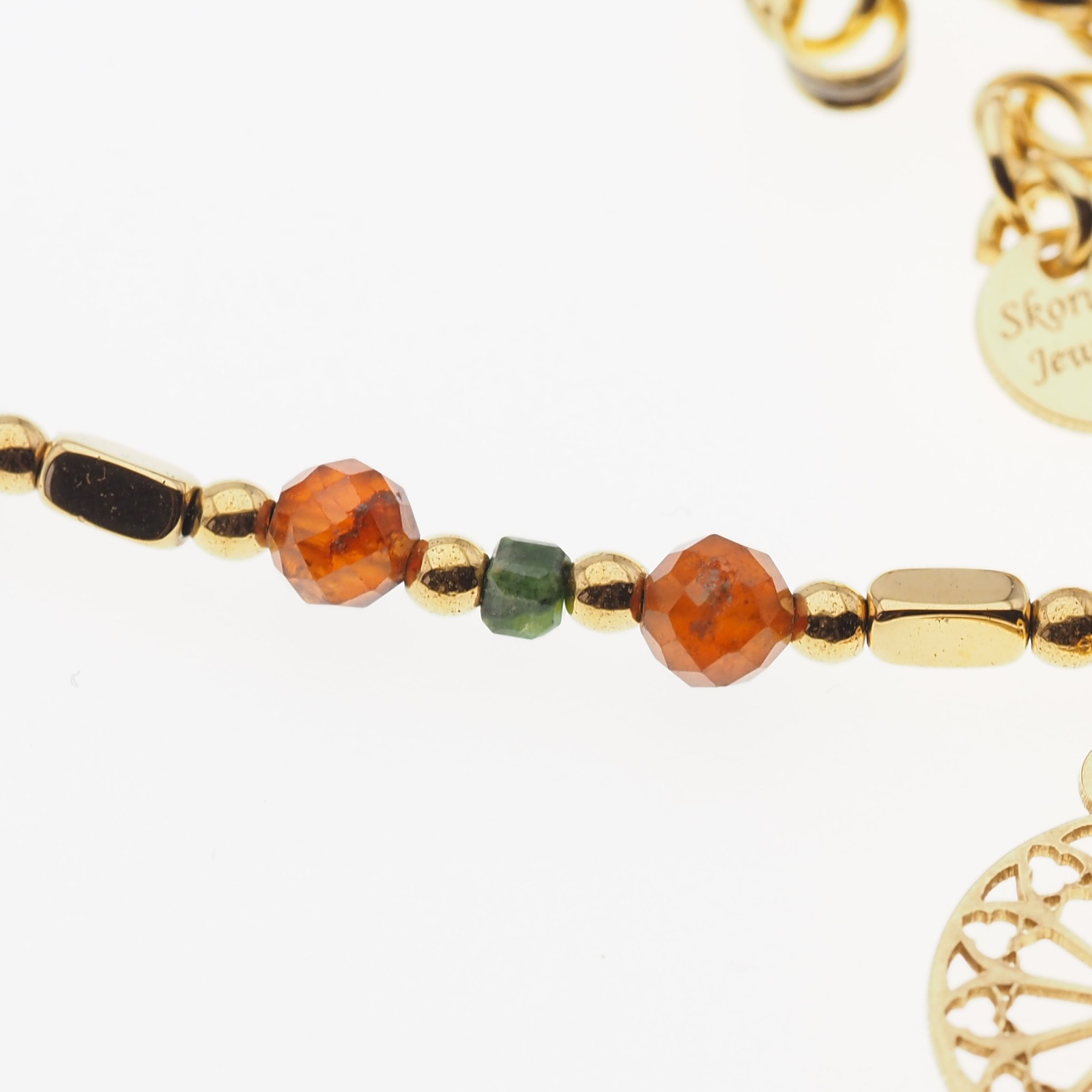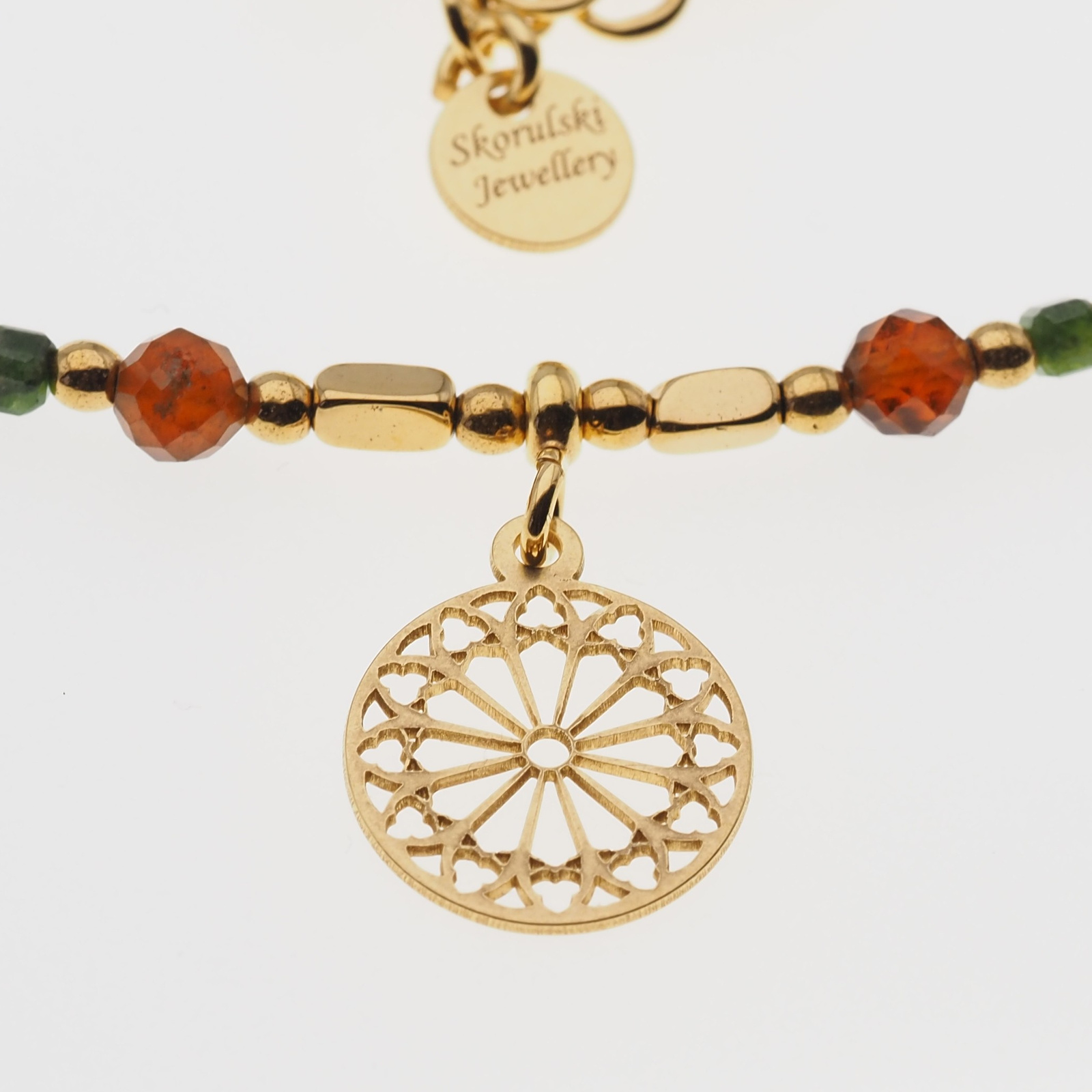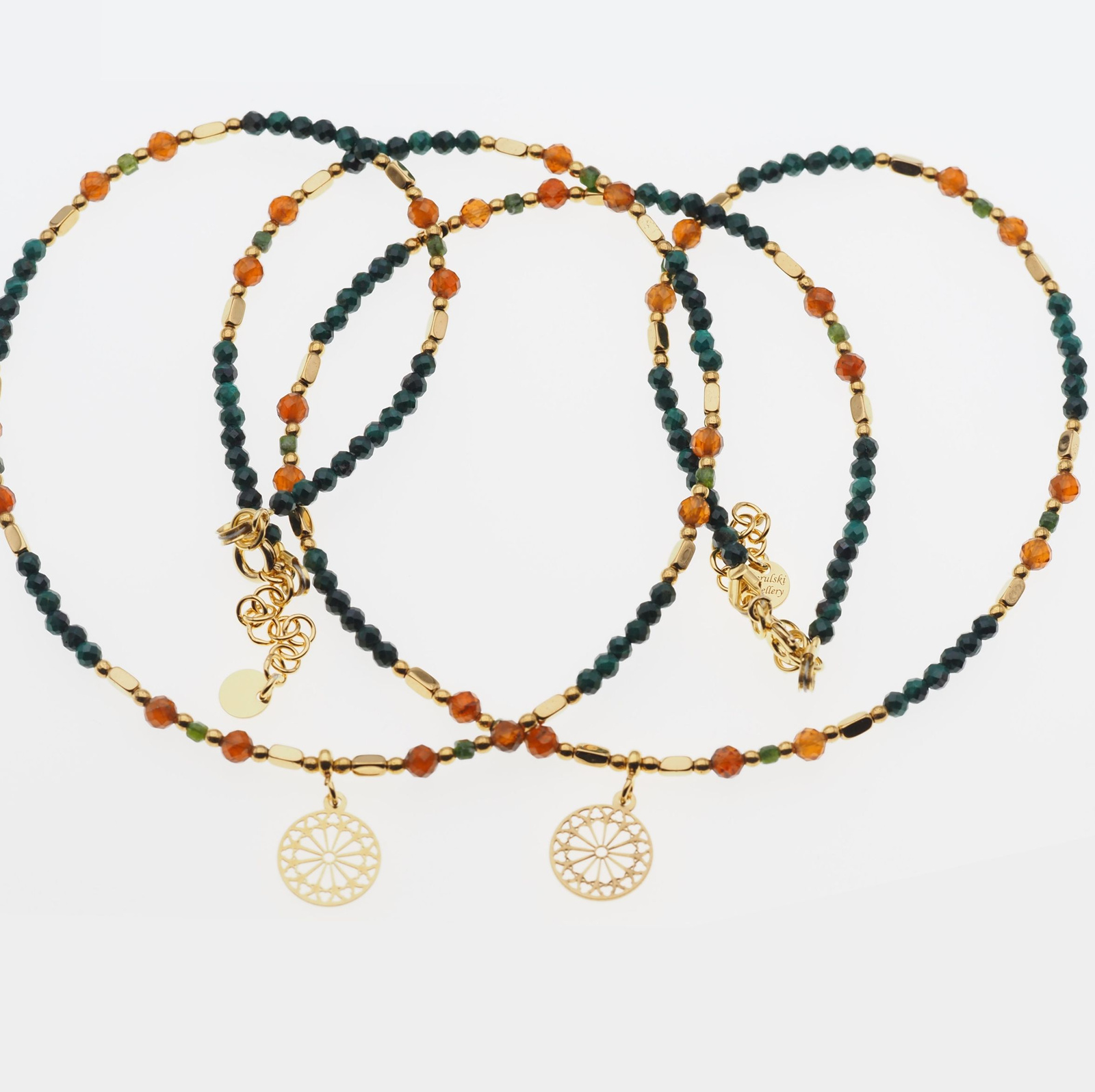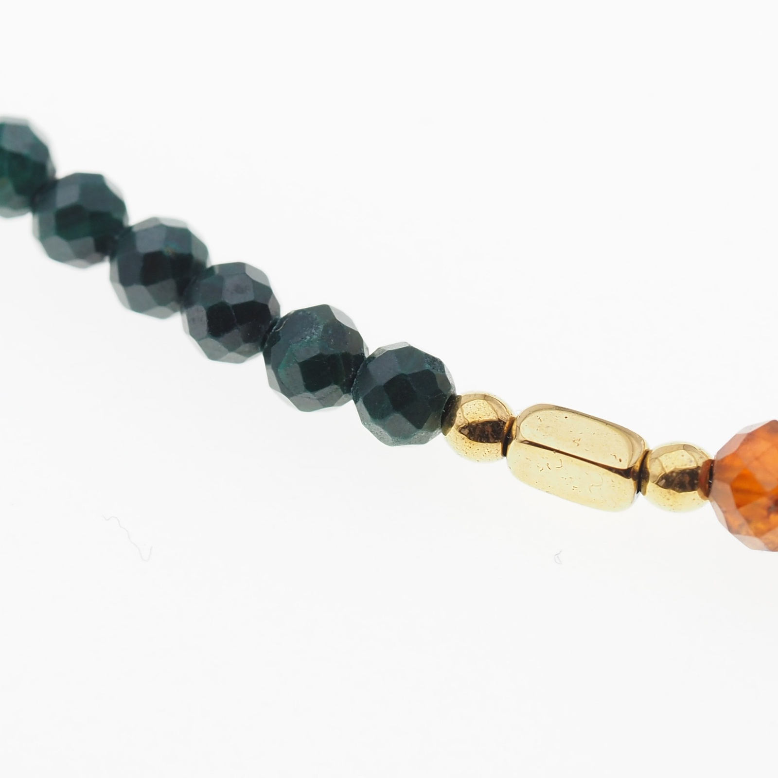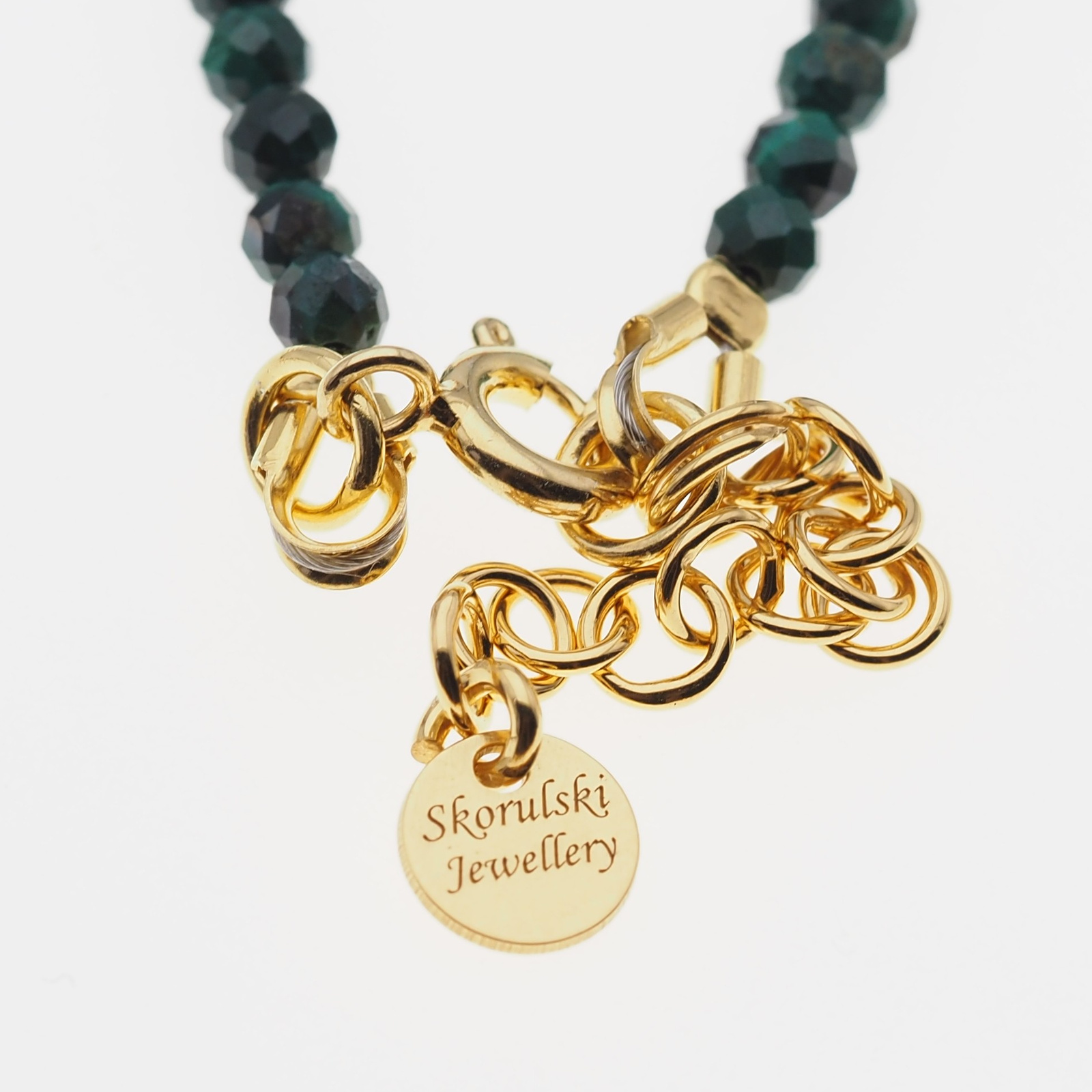 Naszyjnik z Malachitem, Granatem brązowym, Diopsydem i złotym Hematytem został zrobiony ręcznie na lince stalowej.