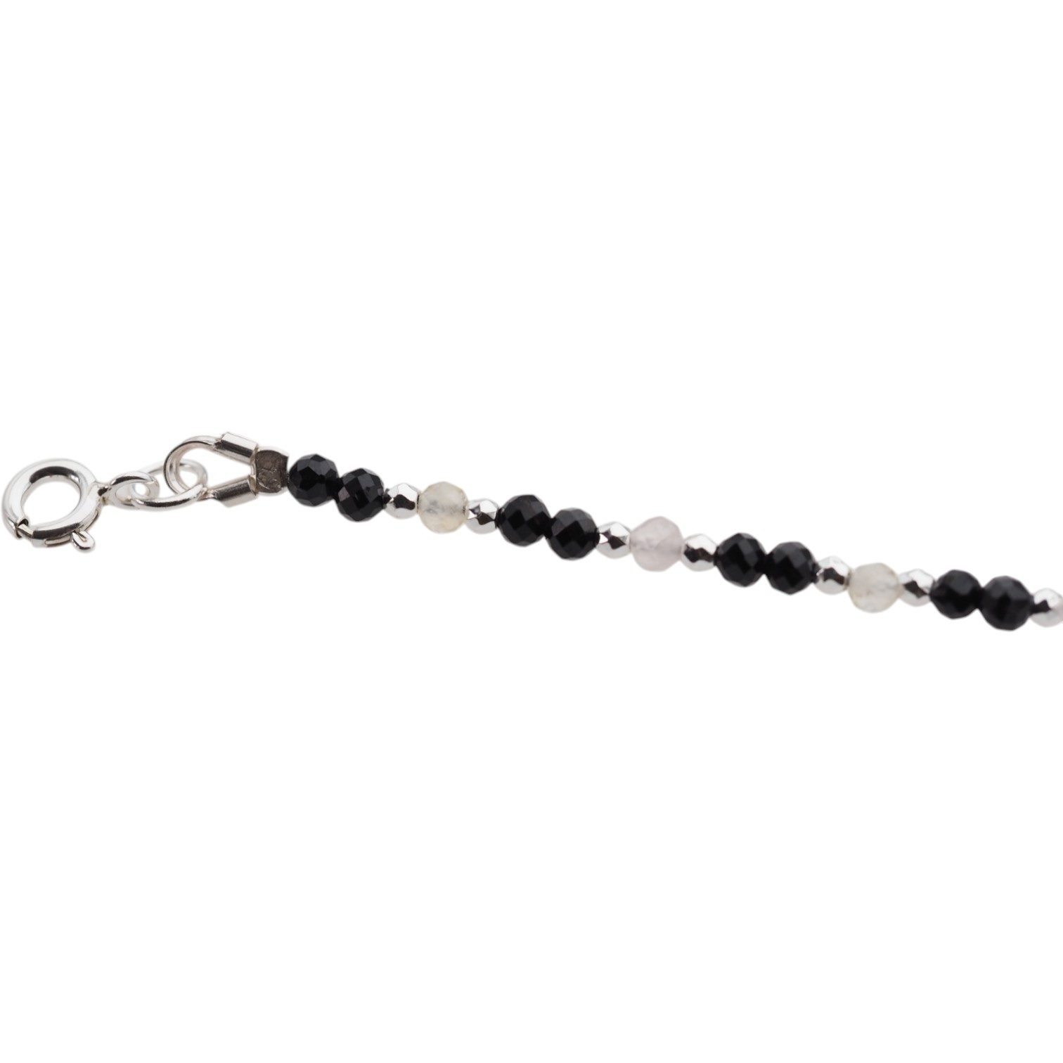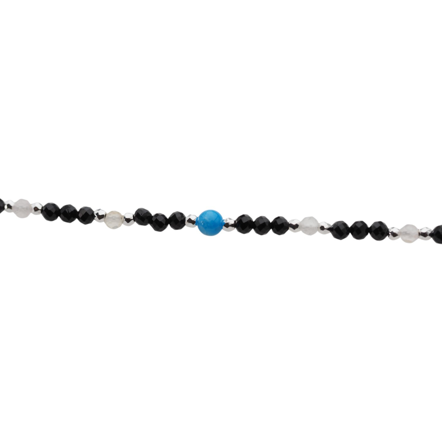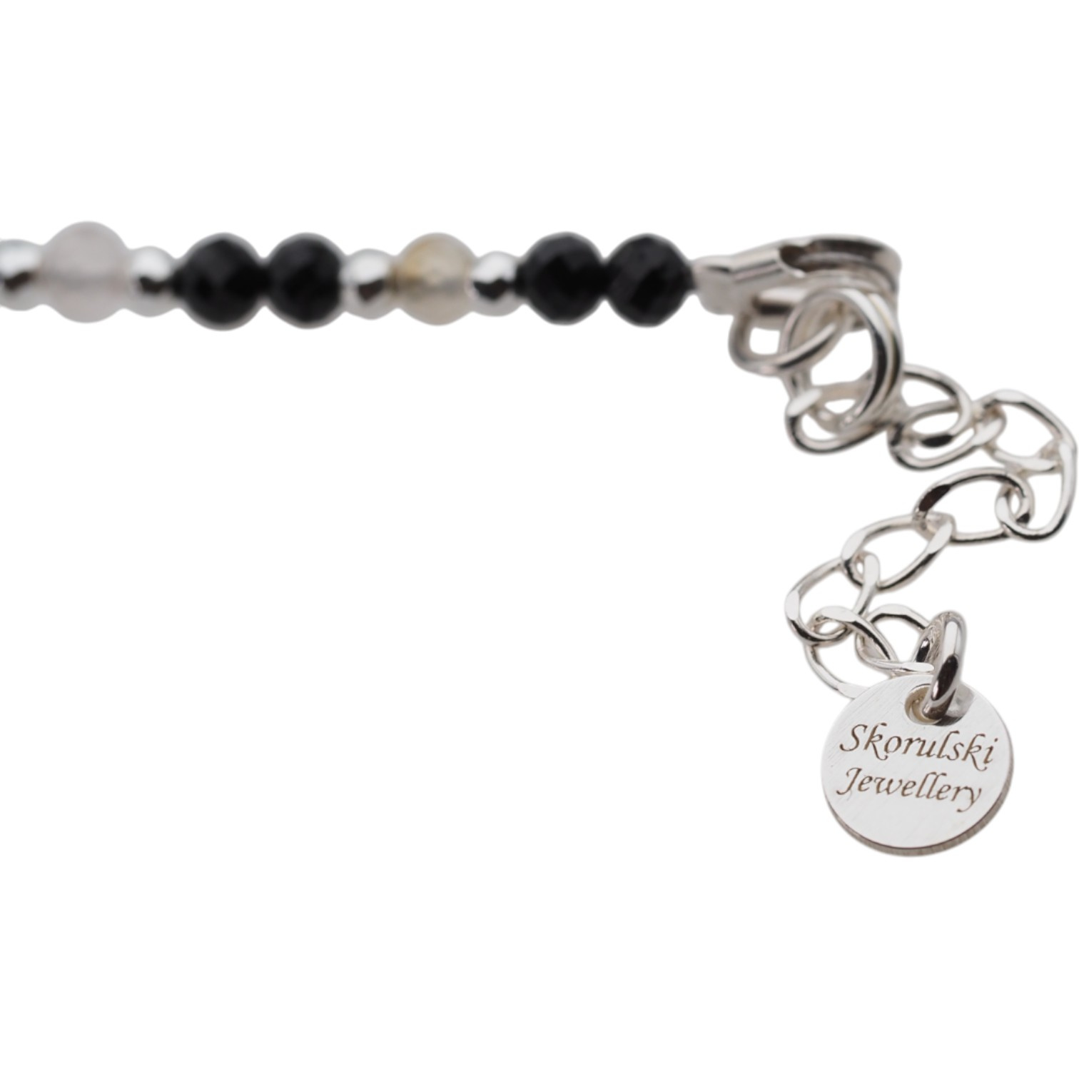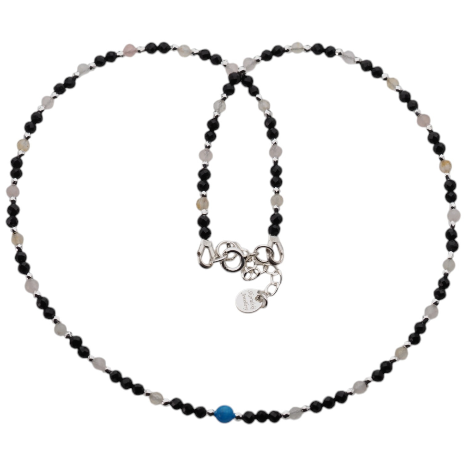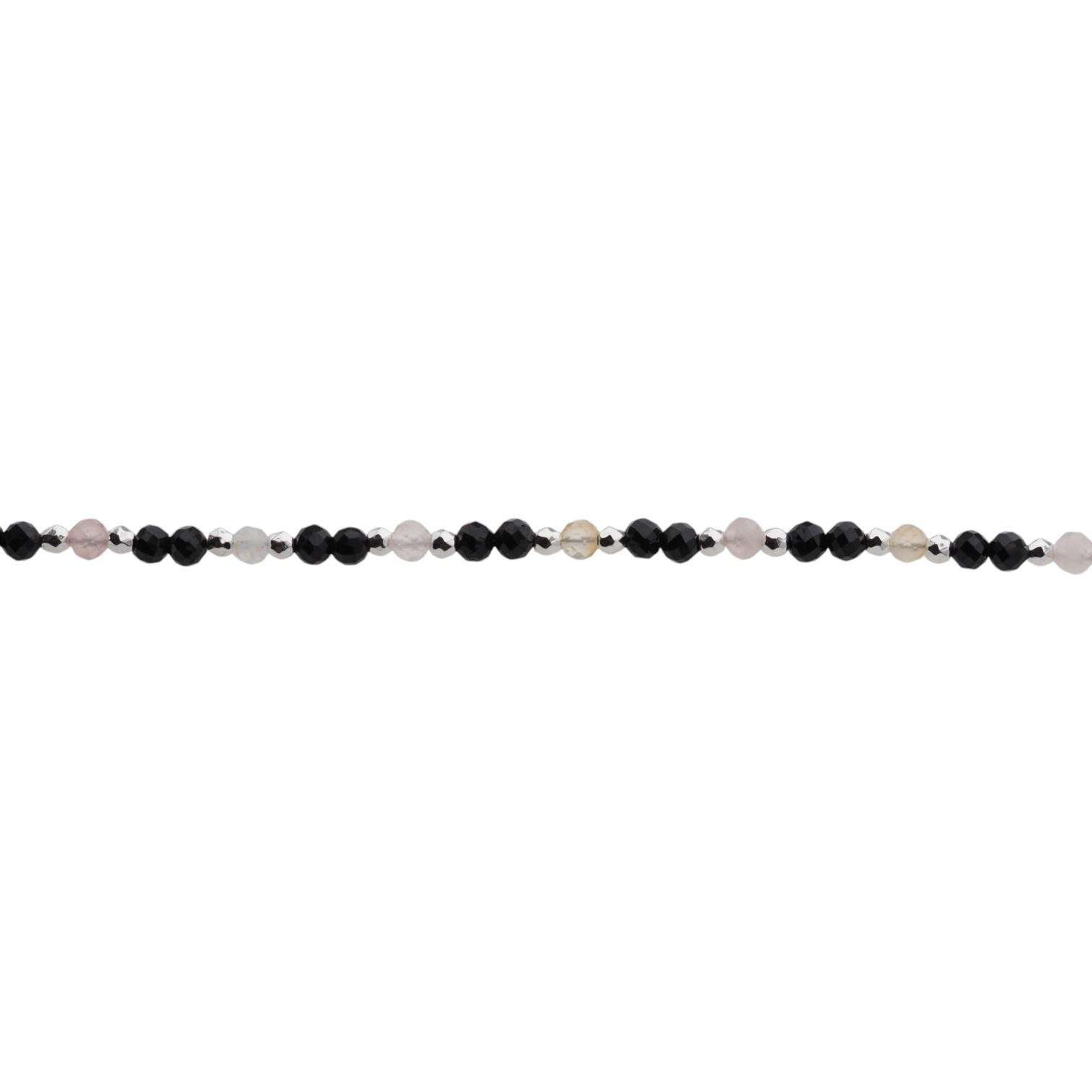 Naszyjnik z Apatytem, czarnym Turmalinem, Cytrynem, Kwarcem Różowym i Hematytem został wykonany ręcznie na lince stalowej.