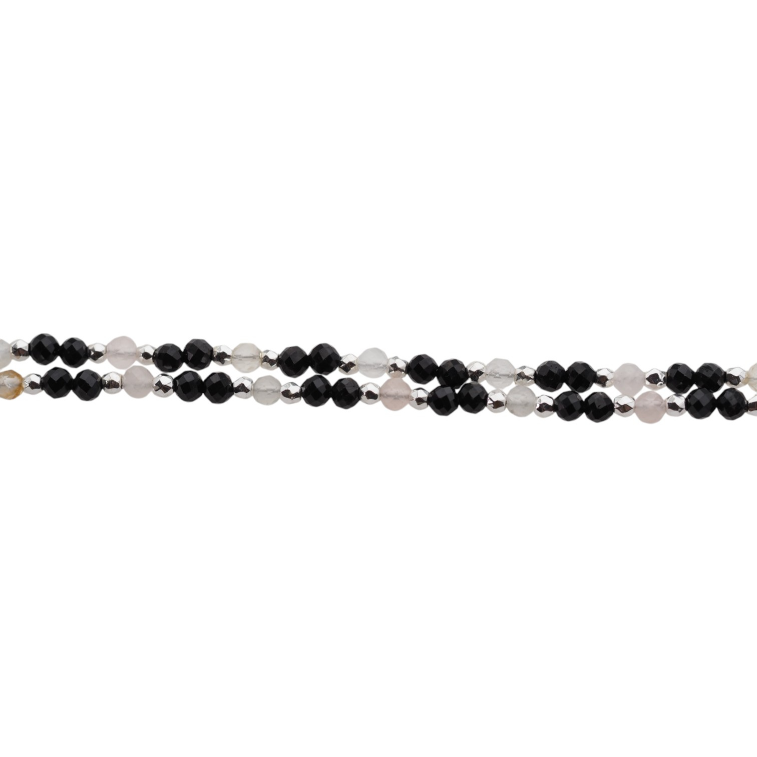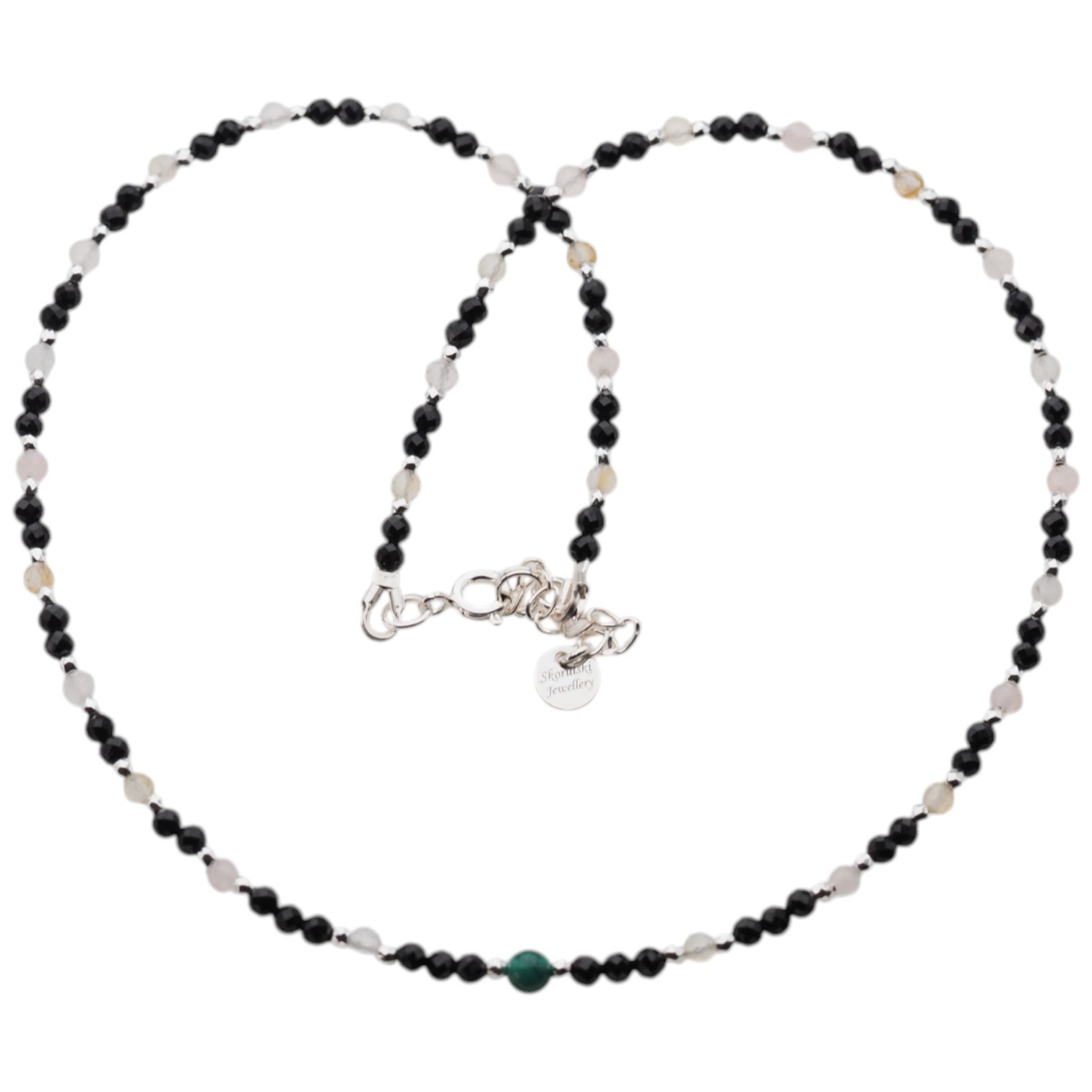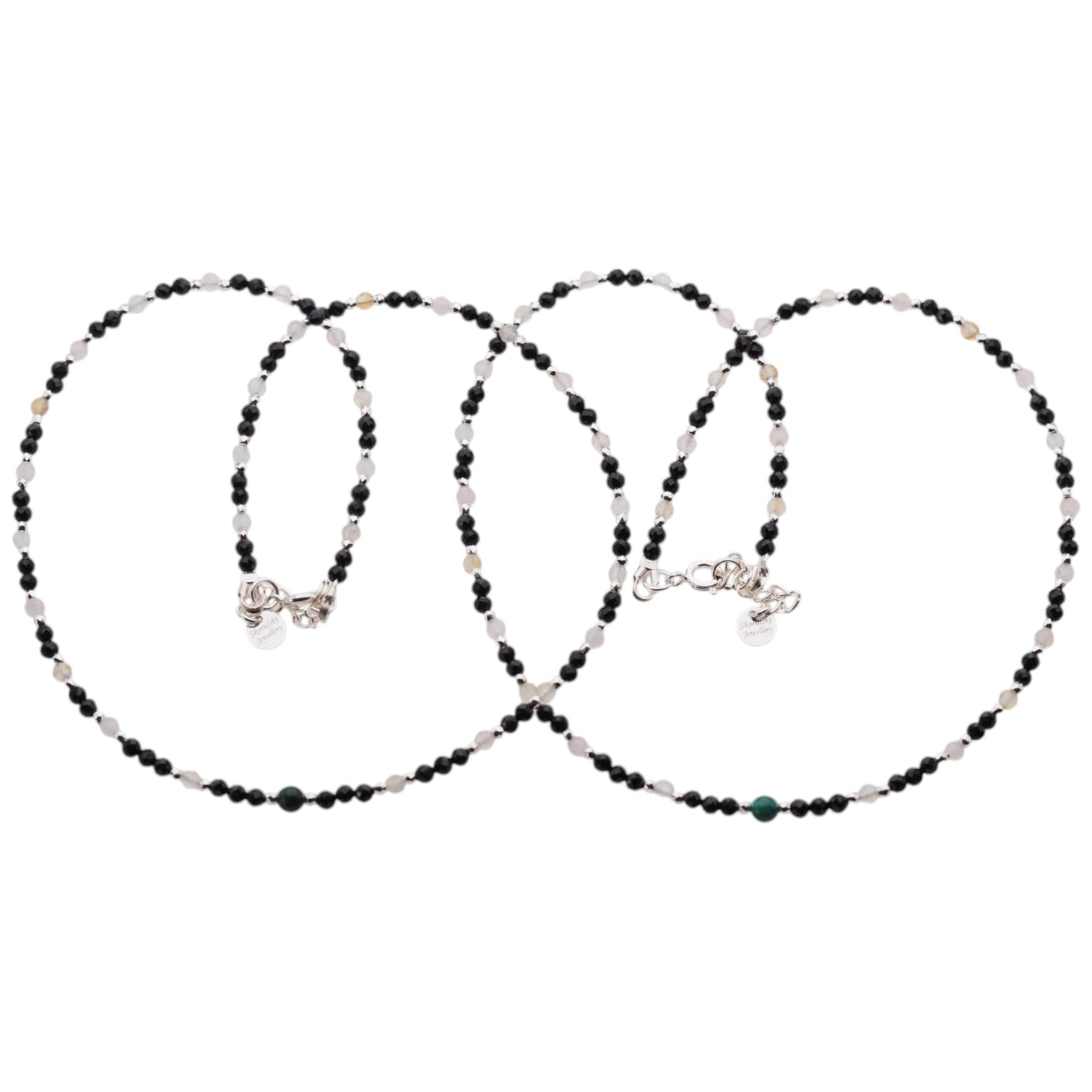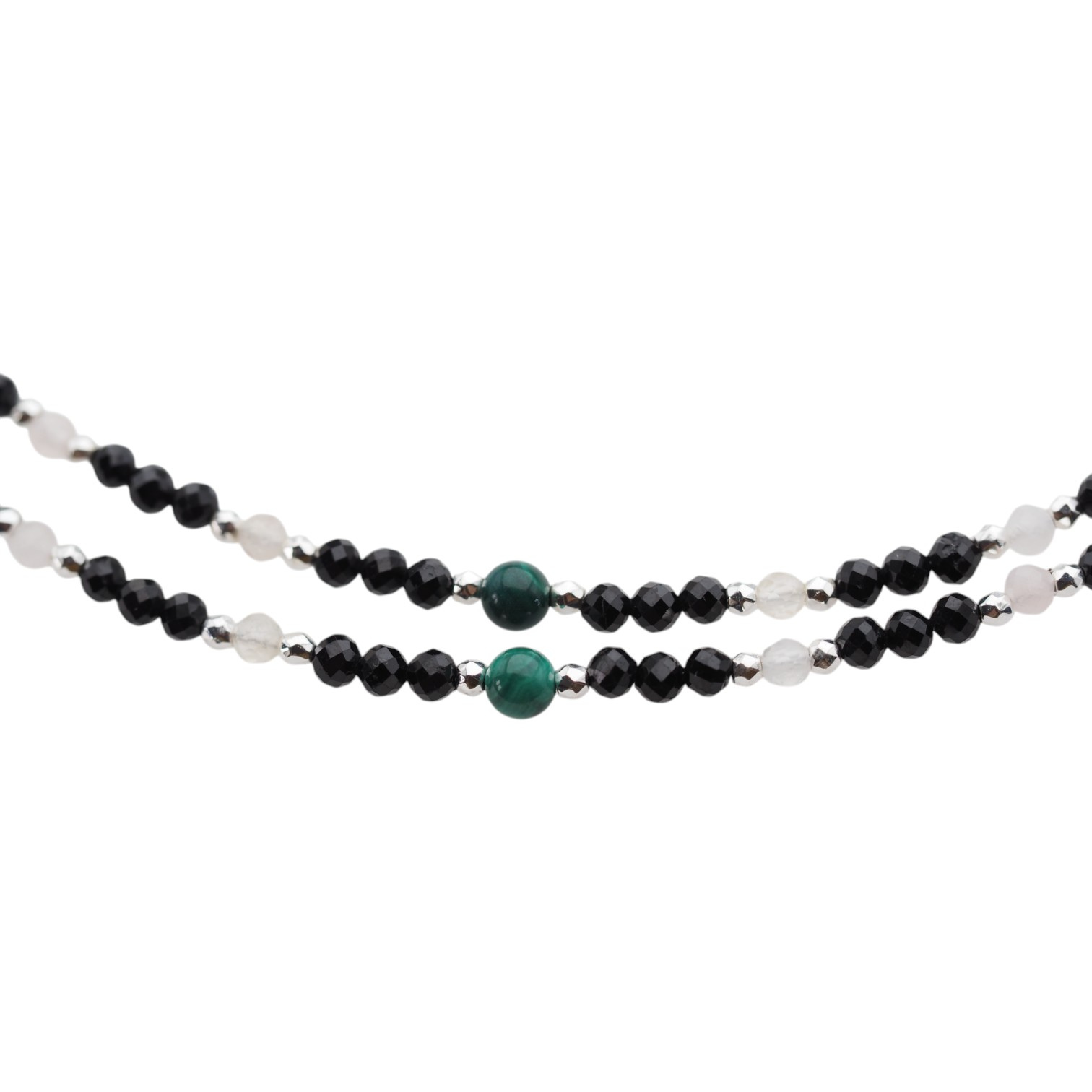 Naszyjnik z Malachitem, czarnym Turmalinem, Cytrynem, Kwarcem Różowym i Hematytem został wykonany ręcznie na lince stalowej.