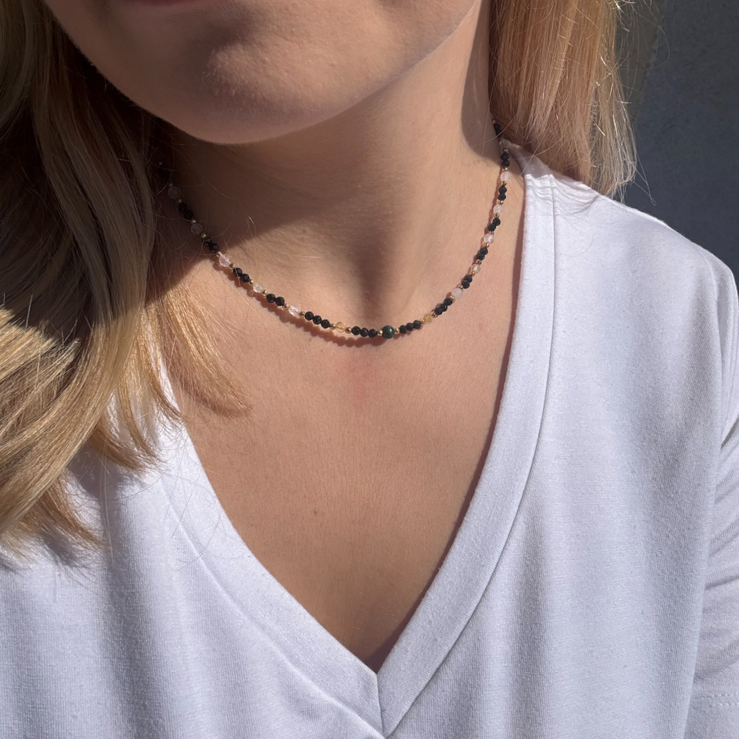 Naszyjnik z Malachitem, czarnym Turmalinem, Cytrynem, Kwarcem Różowym i Hematytem został wykonany ręcznie na lince stalowej.